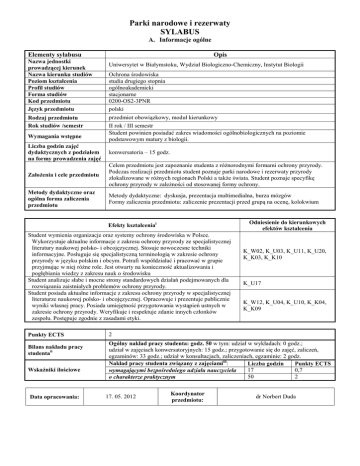 Parki narodowe i rezerwaty SYLABUS A. Informacje ogólne Elementy sylabusu Nazwa jednostki prowadzącej kierunek Nazwa kierunku studiów Poziom kształcenia Profil studiów Forma studiów Kod przedmiotu Język przedmiotu Rodzaj przedmiotu Rok studiów /semestr Wymagania wstępne Opis Uniwersytet w Białymstoku, Wydział Biologiczno-Chemiczny, Instytut Biologii Ochrona środowiska studia drugiego stopnia ogólnoakademicki stacjonarne 0200-OS2-3PNR polski przedmiot obowiązkowy, moduł kierunkowy II rok / III semestr Student powinien posiadać zakres wiadomości ogólnobiologicznych na poziomie podstawowym matury z biologii. Liczba godzin zajęć dydaktycznych z podziałem na formy prowadzenia zajęć konwersatoria – 15 godz. Założenia i cele przedmiotu Celem przedmiotu jest zapoznanie studenta z różnorodnymi formami ochrony przyrody. Podczas realizacji przedmiotu student poznaje parki narodowe i rezerwaty przyrody zlokalizowane w różnych regionach Polski a także świata. Student poznaje specyfikę ochrony przyrody w zależności od stosowanej formy ochrony. Metody dydaktyczne oraz ogólna forma zaliczenia przedmiotu Metody dydaktyczne: dyskusja, prezentacja multimedialna, burza mózgów Formy zaliczenia przedmiotu: zaliczenie prezentacji przed grupą na ocenę, kolokwium Odniesienie do kierunkowych efektów kształcenia Efekty kształceniai Student wymienia organizacje oraz systemy ochrony środowiska w Polsce. Wykorzystuje aktualne informacje z zakresu ochrony przyrody ze specjalistycznej literatury naukowej polsko- i obcojęzycznej. Stosuje nowoczesne techniki informacyjne. Posługuje się specjalistyczną terminologią w zakresie ochrony przyrody w języku polskim i obcym. Potrafi współdziałać i pracować w grupie przyjmując w niej różne role. Jest otwarty na konieczność aktualizowania i pogłębiania wiedzy z zakresu nauk o środowisku Student analizuje słabe i mocne strony standardowych działań podejmowanych dla rozwiązania zaistniałych problemów ochrony przyrody. Student posiada aktualne informacje z zakresu ochrony przyrody w specjalistycznej literaturze naukowej polsko- i obcojęzycznej. Opracowuje i prezentuje publicznie wyniki własnej pracy. Posiada umiejętność przygotowania wystąpień ustnych w zakresie ochrony przyrody. Weryfikuje i respektuje zdanie innych członków zespołu. Postępuje zgodnie z zasadami etyki. Punkty ECTS Bilans nakładu pracy studentaii Wskaźniki ilościowe Data opracowania: K_W02, K_U03, K_U11, K_U20, K_K03, K_K10 K_U17 K_W12, K_U04, K_U10, K_K04, K_K09 2 Ogólny nakład pracy studenta: godz. 50 w tym: udział w wykładach: 0 godz.; udział w zajęciach konwersatoryjnych: 15 godz.; przygotowanie się do zajęć, zaliczeń, egzaminów: 33 godz.; udział w konsultacjach, zaliczeniach, egzaminie: 2 godz. Nakład pracy studenta związany z zajęciamiiii: Liczba godzin Punkty ECTS 17 0,7 wymagającymi bezpośredniego udziału nauczyciela 50 2 o charakterze praktycznym 17. 05. 2012 Koordynator przedmiotu: dr Norbert Duda SYLABUS B. Informacje szczegółowe Elementy składowe sylabusu Nazwa przedmiotu Kod przedmiotu Nazwa kierunku Nazwa jednostki prowadzącej kierunek Język przedmiotu Rok studiów/ semestr Liczba godzin zajęć dydaktycznych oraz forma prowadzenia zajęć Prowadzący Treści merytoryczne przedmiotu: Efekty kształcenia wraz ze sposobem ich weryfikacji Forma i warunki zaliczenia przedmiotu Wykaz literatury podstawowej i uzupełniającej Opis Parki narodowe i rezerwaty 0200-OS2-3PNR Ochrona środowiska, studia drugiego stopnia Wydział Biologiczno-Chemiczny UwB, Instytut Biologii polski drugi rok, trzeci semestr (zimowy) 15 godz., konwersatorium dr Norbert Duda Omówienie form ochrony przyrody w Polsce według Ustawy o Ochronie Przyrody z 2004 r. Wypunktowanie roli parków narodowych i rezerwatów w zachowaniu najcenniejszych fragmentów przyrody. Parki narodowe w górach: Bieszczadzki PN, Magurski PN, Tatrzański PN, Pieniński PN, Karkonoski PN, Gorczański PN Parki narodowe w pobliżu aglomeracji miejskich i zagrożenia płynące z tej lokalizacji: Ojcowski PN, Narwiański PN, Kampinoski PN, Wigierski PN Parki narodowe chroniące bagna i rozlewiska: Poleski PN, Biebrzański PN, PN Ujście Warty. Parki narodowe objęte Konwencją Ramsarską. Nadmorskie parki narodowe: Woliński PN, Słowiński PN. Efekty kształcenia: Student wymienia organizacje oraz systemy ochrony środowiska w Polsce i na świecie. Wykorzystuje aktualne informacje z zakresu ochrony przyrody ze specjalistycznej literatury naukowej polsko- i obcojęzycznej. Stosuje nowoczesne techniki informacyjne. Posługuje się specjalistyczną terminologią w zakresie ochrony przyrody w języku polskim i obcym. Potrafi współdziałać i pracować w grupie przyjmując w niej różne role. Jest otwarty na konieczność aktualizowania i pogłębiania wiedzy z zakresu nauk o środowisku. Dobiera odpowiednie metody i środki ograniczania oraz przeciwdziałania zagrożeniom środowiska. Analizuje słabe i mocne strony standardowych działań podejmowanych dla rozwiązania zaistniałych problemów ochrony przyrody. Posiada aktualne informacje z zakresu ochrony przyrody w specjalistycznej literaturze naukowej polsko- i obcojęzycznej. Opracowuje i prezentuje publicznie wyniki własnej pracy. Posiada umiejętność przygotowania wystąpień ustnych w zakresie ochrony przyrody. Weryfikuje i respektuje zdanie innych członków zespołu. Postępuje zgodnie z zasadami etyki. Sposoby weryfikacji: 1. Ocena prezentacji na wybrany temat. Ocena aktywności podczas dyskusji. Kolokwium podsumowujące. 1. Pozytywna ocena prezentacji na wybrany temat. Pozytywna ocena kolokwium Literatura podstawowa: Parki Narodowe i Rezerwaty przyrody – kwartalnik Białowieskiego Parku Narodowego. Parki Narodowe – kwartalnik Kampinoskiego Parku Narodowego. Literatura uzupełniająca: Foldery informacyjne wydane nakładami dyrekcji parków narodowych ………………………………. podp