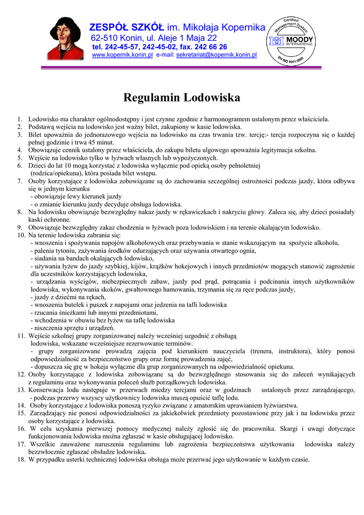 ZESPÓŁ SZKÓŁ im. Mikołaja Kopernika 62-510 Konin, ul. Aleje 1 Maja 22 tel. 242-45-57, 242-45-02, fax. 242 66 26 www.kopernik.konin.pl e-mail: [email protected] Regulamin Lodowiska 1. Lodowisko ma charakter ogólnodostępny i jest czynne zgodnie z harmonogramem ustalonym przez właściciela. 2. Podstawą wejścia na lodowisko jest ważny bilet, zakupiony w kasie lodowiska. 3. Bilet upoważnia do jednorazowego wejścia na lodowisko na czas trwania tzw. tercję:- tercja rozpoczyna się o każdej pełnej godzinie i trwa 45 minut. 4. Obowiązuje cennik ustalony przez właściciela, do zakupu biletu ulgowego upoważnia legitymacja szkolna. 5. Wejście na lodowisko tylko w łyżwach własnych lub wypożyczonych. 6. Dzieci do lat 10 mogą korzystać z lodowiska wyłącznie pod opieką osoby pełnoletniej (rodzica/opiekuna), która posiada bilet wstępu. 7. Osoby korzystające z lodowiska zobowiązane są do zachowania szczególnej ostrożności podczas jazdy, która odbywa się w jednym kierunku - obowiązuje lewy kierunek jazdy - o zmianie kierunku jazdy decyduje obsługa lodowiska. 8. Na lodowisku obowiązuje bezwzględny nakaz jazdy w rękawiczkach i nakryciu głowy. Zaleca się, aby dzieci posiadały kaski ochronne. 9. Obowiązuje bezwzględny zakaz chodzenia w łyżwach poza lodowiskiem i na terenie okalającym lodowisko. 10. Na terenie lodowiska zabrania się: - wnoszenia i spożywania napojów alkoholowych oraz przebywania w stanie wskazującym na spożycie alkoholu, - palenia tytoniu, zażywania środków odurzających oraz używania otwartego ognia, - siadania na bandach okalających lodowisko, - używania łyżew do jazdy szybkiej, kijów, krążków hokejowych i innych przedmiotów mogących stanowić zagrożenie dla uczestników korzystających lodowiska, - urządzania wyścigów, niebezpiecznych zabaw, jazdy pod prąd, potrącania i podcinania innych użytkowników lodowiska, wykonywania skoków, gwałtownego hamowania, trzymania się za ręce podczas jazdy, - jazdy z dziećmi na rękach, - wnoszenia butelek i puszek z napojami oraz jedzenia na tafli lodowiska - rzucania śnieżkami lub innymi przedmiotami, - wchodzenia w obuwiu bez łyżew na taflę lodowiska - niszczenia sprzętu i urządzeń. 11. Wejście szkolnej grupy zorganizowanej należy wcześniej uzgodnić z obsługą lodowiska, wskazane wcześniejsze rezerwowanie terminów. - grupy zorganizowane prowadzą zajęcia pod kierunkiem nauczyciela (trenera, instruktora), który ponosi odpowiedzialność za bezpieczeństwo grupy oraz formę prowadzenia zajęć, - dopuszcza się grę w hokeja wyłączne dla grup zorganizowanych na odpowiedzialność opiekuna. 12. Osoby korzystające z lodowiska zobowiązane są do bezwzględnego stosowania się do zaleceń wynikających z regulaminu oraz wykonywania poleceń służb porządkowych lodowiska. 13. Konserwacja lodu następuje w przerwach miedzy tercjami oraz w godzinach ustalonych przez zarządzającego, - podczas przerwy wszyscy użytkownicy lodowiska muszą opuścić taflę lodu. 14. Osoby korzystające z lodowiska ponoszą ryzyko związane z amatorskim uprawianiem łyżwiarstwa. 15. Zarządzający nie ponosi odpowiedzialności za jakiekolwiek przedmioty pozostawione przy jak i na lodowisku przez osoby korzystające z lodowiska. 16. W celu uzyskania pierwszej pomocy medycznej należy zgłosić się do pracownika. Skargi i uwagi dotyczące funkcjonowania lodowiska można zgłaszać w kasie obsługującej lodowisko. 17. Wszelkie zauważone naruszenia regulaminu lub zagrożenia bezpieczeństwa użytkowania lodowiska należy bezzwłocznie zgłaszać obsłudze lodowiska. 18. W przypadku usterki technicznej lodowiska obsługa może przerwać jego użytkowanie w każdym czasie.