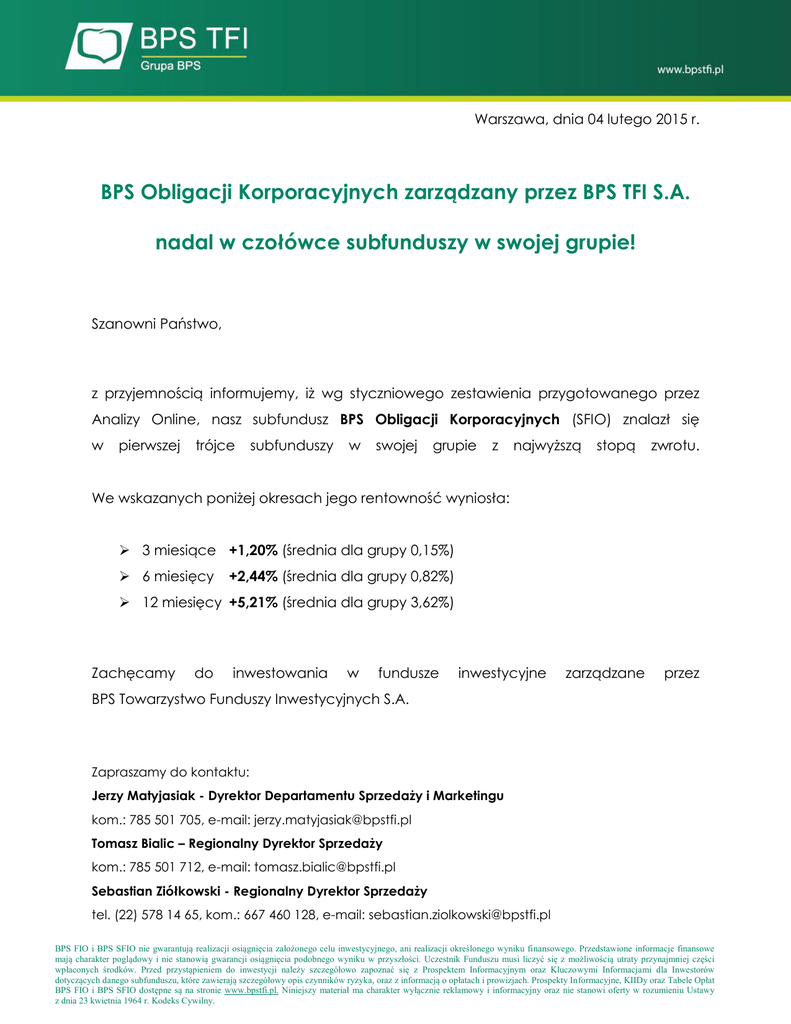 Warszawa, dnia 04 lutego 2015 r. BPS Obligacji Korporacyjnych zarządzany przez BPS TFI S.A. nadal w czołówce subfunduszy w swojej grupie! Szanowni Państwo, z przyjemnością informujemy, iż wg styczniowego zestawienia przygotowanego przez Analizy Online, nasz subfundusz BPS Obligacji Korporacyjnych (SFIO) znalazł się w pierwszej trójce subfunduszy w swojej grupie z najwyższą stopą zwrotu. We wskazanych poniżej okresach jego rentowność wyniosła: 3 miesiące +1,20% (średnia dla grupy 0,15%) 6 miesięcy +2,44% (średnia dla grupy 0,82%) 12 miesięcy +5,21% (średnia dla grupy 3,62%) Zachęcamy do inwestowania w fundusze inwestycyjne zarządzane przez BPS Towarzystwo Funduszy Inwestycyjnych S.A. Zapraszamy do kontaktu: Jerzy Matyjasiak - Dyrektor Departamentu Sprzedaży i Marketingu kom.: 785 501 705, e-mail: [email protected] Tomasz Bialic – Regionalny Dyrektor Sprzedaży kom.: 785 501 712, e-mail: [email protected] Sebastian Ziółkowski - Regionalny Dyrektor Sprzedaży tel. (22) 578 14 65, kom.: 667 460 128, e-mail: [email protected] BPS FIO i BPS SFIO nie gwarantują realizacji osiągnięcia założonego celu inwestycyjnego, ani realizacji określonego wyniku finansowego. Przedstawione informacje finansowe mają charakter poglądowy i nie stanowią gwarancji osiągnięcia podobnego wyniku w przyszłości. Uczestnik Funduszu musi liczyć się z możliwością utraty przynajmniej części wpłaconych środków. Przed przystąpieniem do inwestycji należy szczegółowo zapoznać się z Prospektem Informacyjnym oraz Kluczowymi Informacjami dla Inwestorów dotyczących danego subfunduszu, które zawierają szczegółowy opis czynników ryzyka, oraz z informacją o opłatach i prowizjach. Prospekty Informacyjne, KIIDy oraz Tabele Opłat BPS FIO i BPS SFIO dostępne są na stronie www.bpstfi.pl. Niniejszy materiał ma charakter wyłącznie reklamowy i informacyjny oraz nie stanowi oferty w rozumieniu Ustawy z dnia 23 kwietnia 1964 r. Kodeks Cywilny.