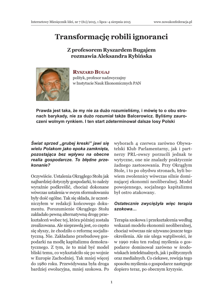 Internetowy Miesięcznik Idei, nr 7 (61)/2015, 1 lipca–4 sierpnia 2015 www.nowakonfederacja.pl Transformację robili ignoranci Z profesorem Ryszardem Bugajem rozmawia Aleksandra Rybińska RysZARd BugAj polityk, profesor nadzwyczajny w Instytucie Nauk Ekonomicznych PAN Prawda jest taka, że my nie za dużo rozumieliśmy, i mówię to o obu stronach barykady, nie za dużo rozumiał także Balcerowicz. Byliśmy zauroczeni wolnym rynkiem. I ten start zdeterminował dalsze losy Polski Świat sprzed „grubej kreski” jawi się wielu Polakom jako epoka zamknięta, pozostająca bez wpływu na obecne realia gospodarcze. To błędne przekonanie? wyborach 4 czerwca zarówno Obywatelski Klub Parlamentarny, jak i partnerzy PRL-owscy porzucili jednak te wytyczne, one nie znalazły praktycznie żadnego zastosowania. Przy Okrągłym Stole, i to po obydwu stronach, byli bowiem zwolennicy wówczas silnie dominującej ekonomii neoliberalnej. Model powojennego, socjalnego kapitalizmu był ostro atakowany. Oczywiście. Ustalenia Okrągłego Stołu jak najbardziej dotyczyły gospodarki, to należy wyraźnie podkreślić, chociaż dokonane wówczas ustalenia w swym sformułowaniu były dość ogólne. Tak się składa, że uczestniczyłem w redakcji końcowego dokumentu. Porozumienie Okrągłego Stołu zakładało pewną alternatywną drogę przekształceń wobec tej, która później została zrealizowana. Ale nieprawdą jest, co często się słyszy, że chodziło o reformę socjalistyczną. Nie. Zakładano przebudowę gospodarki na modłę kapitalizmu demokratycznego. Z tym, że to miał być model bliski temu, co wykształciło się po wojnie w Europie Zachodniej. Tak mniej więcej do 1980 roku. Przewidywana była droga bardziej ewolucyjna, mniej szokowa. Po Ostatecznie zwyciężyła więc terapia szokowa… Terapia szokowa i przekształcenia według wskazań modelu ekonomii neoliberalnej, chociaż wówczas nie używano jeszcze tego określenia. Ale nie ulega wątpliwości, że w 1990 roku ten rodzaj myślenia o gospodarce dominował zarówno w środowiskach intelektualnych, jak i politycznych oraz medialnych. Co ciekawe, rewizja tego sposobu myślenia o gospodarce następuje dopiero teraz, po obecnym kryzysie. 1 Internetowy Miesięcznik Idei, nr 7 (61)/2015, 1 lipca–4 sierpnia 2015 Jak twierdzi historyk Sławomir Cenckiewicz, „geneza polskiego kapitalizmu tkwi w dużej mierze na ul. Rakowieckiej i w al. Niepodległości w Warszawie”. Według niego poprzez neoliberalne przekształcenia ludzie PRL uwłaszczyli się na majątku narodowym… www.nowakonfederacja.pl wątpliwości, że te spółki polonijne w czasach PRL-u były taką enklawą wolnorynkową, ale były pod bardzo dużą kontrolą aparatu służb specjalnych. Bardzo niewiele było przypadków spółek polonijnych, w których nie było kontroli czy udziału ludzi aparatu służb. W moim przekonaniu takiego założenia świadomego nie było. Natomiast nie ulega wątpliwości, że terapia szokowa sprzyjała wszystkim tym, którzy już byli w dołkach, jeszcze w PRL-u zajęli miejsca. Tym bardziej, iż w końcówce PRL-u dokonano szeregu zmian, które znacznie umocniły pozycje dotychczasowych aktorów nomenklaturowych. W związku z tym transformacja czysto rynkowa dała tym ludziom ogromną przewagę. Powstał w Polsce kapitalizm, ale w wersji niekoniecznie odpowiadającej interesom dużych grup społecznych Mówi pan, że nikt świadomie nie zakładał uwłaszczenia się nomenklatury PRL-u na majątku narodowym podczas transformacji. Oznaczałoby to, że ludzi po tamtej stornie, tej solidarnościowej, cechowała ogromna naiwność. Jacek Kuroń później przyznał, że wyszedł z założenia, iż najpierw zbudujemy kapitalizm, a potem będziemy go kontestować. Tyle że instytucje powstają i stają się nienaruszalne. Czy w tym czasie nikt nie alarmował, jakie to wszystko może mieć skutki? Unika pan pojęcia „uwłaszczenie”. A przecież doszło do likwidacji czy grabieży wielu branż przemysłu, do egoistycznego rozparcelowania tego, co pozostało w spadku po komunie… Ja myślę, że określenie ukute przez panią prof. Jadwigę Staniszkis, „uwłaszczenie nomenklatury”, jest dobre, co nie znaczy, że można poprzestać na tym. Generalnie rzecz biorąc zyskali ci, którzy mieli stosunkowo sporo środków. To byli ludzie aparatu w dużym stopniu, ale byli to ludzie, którzy w nomenklaturze pełnili rolę dyrektorów przedsiębiorstw i zajmowali czołowe pozycje w administracji państwowej. Oni nie musieli być koniecznie częścią aparatu partii komunistycznej. Aż do 1990 roku ich pozycja zależała jednak od tego aparatu. Jest także delikatna sprawa prywatnego biznesu, czyli spółek polonijnych, które odegrały bardzo dużą rolę w procesie transformacji. Nie ulega Cóż, powstał w Polsce kapitalizm, ale w wersji niekoniecznie odpowiadającej interesom dużych grup społecznych. To jest bezsporne. Prawda jest taka, że my nie za dużo rozumieliśmy, i mówię to o obu stronach barykady, nie za dużo rozumiał także Leszek Balcerowicz. Byliśmy zauroczeni wolnym rynkiem. I ten start zdeterminował dalsze losy Polski. Ci, którzy zajęli miejsca na starcie, uzyskali ogromny handicap na przyszłość. To nie jest tak, że wszyscy byli skazani na sukces, ale nie ulega wątpliwości, że mieli prze2 Internetowy Miesięcznik Idei, nr 7 (61)/2015, 1 lipca–4 sierpnia 2015 wagę nad innymi. Znamy przecież we współczesnej Polsce przykłady ludzi sukcesu, którzy nie byli w żadnej mierze związani z dawnym aparatem. Ale zdecydowana większość to oczywiście ludzie nomenklatury, tyle że dziś jest to już drugie pokolenie. Minęło już dwadzieścia parę lat i ich dzieci te pozycje zaczynają powoli przejmować. Tu wracamy do Leszka Balcerowicza, który właściwie nie próbował reformować przedsiębiorstw publicznych. Zakładał, że ta reforma się dokona poprzez prywatyzację. Najpierw upadną, potem zostaną prze