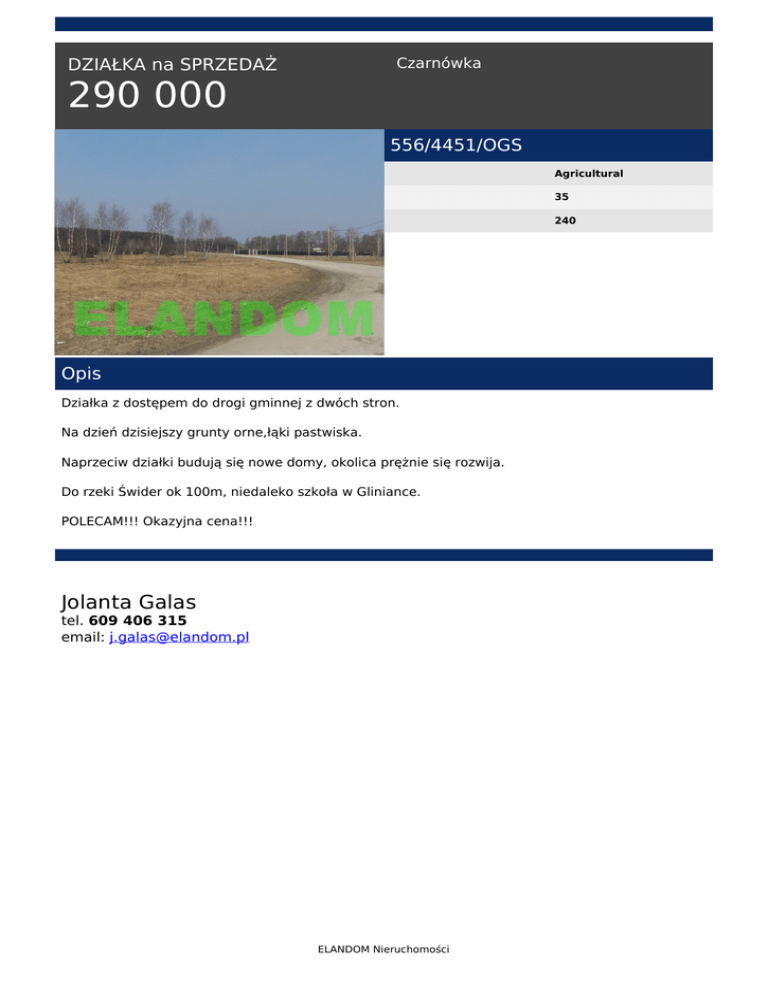 Czarnówka DZIAŁKA na SPRZEDAŻ 290 000 556/4451/OGS Agricultural 35 240 Opis Działka z dostępem do drogi gminnej z dwóch stron. Na dzień dzisiejszy grunty orne,łąki pastwiska. Naprzeciw działki budują się nowe domy, okolica prężnie się rozwija. Do rzeki Świder ok 100m, niedaleko szkoła w Gliniance. POLECAM!!! Okazyjna cena!!! Jolanta Galas tel. 609 406 315 email: [email protected] ELANDOM Nieruchomości Powered by TCPDF (www.tcpdf.org)