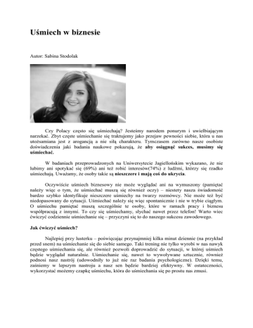 Uśmiech w biznesie Autor: Sabina Stodolak Czy Polacy często się uśmiechają? Jesteśmy narodem ponurym i uwielbiającym narzekać. Zbyt częste uśmiechanie się traktujemy jako przejaw pewności siebie, która u nas utoŜsamiana jest z arogancją a nie siłą charakteru. Tymczasem zarówno nasze osobiste doświadczenia jaki badania naukowe pokazują, Ŝe aby osiągnąć sukces, musimy się uśmiechać. W badaniach przeprowadzonych na Uniwersytecie Jagiellońskim wykazano, Ŝe nie lubimy ani spotykać się (69%) ani teŜ robić interesów(74%) z ludźmi, którzy się rzadko uśmiechają. UwaŜamy, Ŝe osoby takie są nieszczere i mają coś do ukrycia. Oczywiście uśmiech biznesowy nie moŜe wyglądać ani na wymuszony (pamiętać naleŜy więc o tym, Ŝe uśmiechać muszą się równieŜ oczy) – niestety nasza świadomość bardzo szybko identyfikuje nieszczere uśmiechy na twarzy rozmówcy. Nie moŜe teŜ być niedopasowany do sytuacji. Uśmiechać naleŜy się więc spontanicznie i nie w trybie ciągłym. O uśmiechu pamiętać muszą szczególnie te osoby, które w ramach pracy i biznesu współpracują z innymi. To czy się uśmiechamy, słychać nawet przez telefon! Warto wiec ćwiczyć codziennie uśmiechanie się – przyczyni się to do naszego sukcesu zawodowego. Jak ćwiczyć uśmiech? Najlepiej przy lusterku – poświęcając przynajmniej kilka minut dziennie (na przykład przed snem) na uśmiechanie się do siebie samego. Taki trening nie tylko wyrobi w nas nawyk częstego uśmiechania się, ale równieŜ pozwoli doprowadzić do sytuacji, w której uśmiech będzie wyglądał naturalnie. Uśmiechanie się, nawet to wywoływane sztucznie, równieŜ podnosi nasz nastrój (udowodniły to juŜ nie raz badania psychologiczne). Dzięki temu, zaśniemy w lepszym nastroju a nasz sen będzie bardziej efektywny. W ostateczności, wykorzystać moŜemy czapkę uśmiechu, która do uśmiechania się po prostu nas zmusi.