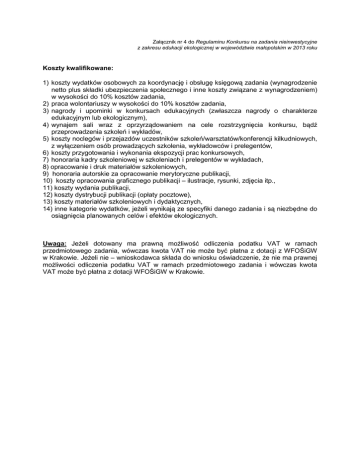 Załącznik nr 4 do Regulaminu Konkursu na zadania nieinwestycyjne z zakresu edukacji ekologicznej w województwie małopolskim w 2013 roku Koszty kwalifikowane: 1) koszty wydatków osobowych za koordynację i obsługę księgową zadania (wynagrodzenie netto plus składki ubezpieczenia społecznego i inne koszty związane z wynagrodzeniem) w wysokości do 10% kosztów zadania, 2) praca wolontariuszy w wysokości do 10% kosztów zadania, 3) nagrody i upominki w konkursach edukacyjnych (zwłaszcza nagrody o charakterze edukacyjnym lub ekologicznym), 4) wynajem sali wraz z oprzyrządowaniem na cele rozstrzygnięcia konkursu, bądź przeprowadzenia szkoleń i wykładów, 5) koszty noclegów i przejazdów uczestników szkoleń/warsztatów/konferencji kilkudniowych, z wyłączeniem osób prowadzących szkolenia, wykładowców i prelegentów, 6) koszty przygotowania i wykonania ekspozycji prac konkursowych, 7) honoraria kadry szkoleniowej w szkoleniach i prelegentów w wykładach, 8) opracowanie i druk materiałów szkoleniowych, 9) honoraria autorskie za opracowanie merytoryczne publikacji, 10) koszty opracowania graficznego publikacji – ilustracje, rysunki, zdjęcia itp., 11) koszty wydania publikacji, 12) koszty dystrybucji publikacji (opłaty pocztowe), 13) koszty materiałów szkoleniowych i dydaktycznych, 14) inne kategorie wydatków, jeżeli wynikają ze specyfiki danego zadania i są niezbędne do osiągnięcia planowanych celów i efektów ekologicznych. Uwaga: Jeżeli dotowany ma prawną możliwość odliczenia podatku VAT w ramach przedmiotowego zadania, wówczas kwota VAT nie może być płatna z dotacji z WFOŚiGW w Krakowie. Jeżeli nie – wnioskodawca składa do wniosku oświadczenie, że nie ma prawnej możliwości odliczenia podatku VAT w ramach przedmiotowego zadania i wówczas kwota VAT może być płatna z dotacji WFOŚiGW w Krakowie.