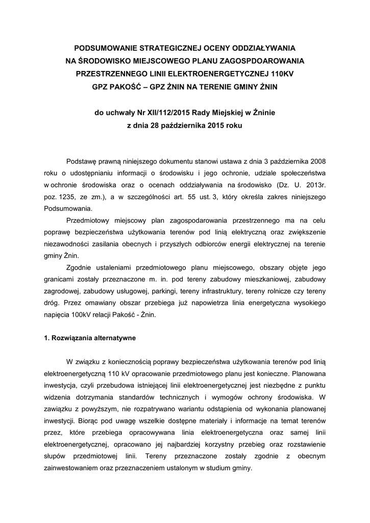 PODSUMOWANIE STRATEGICZNEJ OCENY ODDZIAŁYWANIA NA ŚRODOWISKO MIEJSCOWEGO PLANU ZAGOSPDOAROWANIA PRZESTRZENNEGO LINII ELEKTROENERGETYCZNEJ 110KV GPZ PAKOŚĆ – GPZ ŻNIN NA TERENIE GMINY ŻNIN do uchwały Nr XII/112/2015 Rady Miejskiej w Żninie z dnia 28 października 2015 roku Podstawę prawną niniejszego dokumentu stanowi ustawa z dnia 3 października 2008 roku o udostępnianiu informacji o środowisku i jego ochronie, udziale społeczeństwa w ochronie środowiska oraz o ocenach oddziaływania na środowisko (Dz. U. 2013r. poz. 1235, ze zm.), a w szczególności art. 55 ust. 3, który określa zakres niniejszego Podsumowania. Przedmiotowy miejscowy plan zagospodarowania przestrzennego ma na celu poprawę bezpieczeństwa użytkowania terenów pod linią elektryczną oraz zwiększenie niezawodności zasilania obecnych i przyszłych odbiorców energii elektrycznej na terenie gminy Żnin. Zgodnie ustaleniami przedmiotowego planu miejscowego, obszary objęte jego granicami zostały przeznaczone m. in. pod tereny zabudowy mieszkaniowej, zabudowy zagrodowej, zabudowy usługowej, parkingi, tereny infrastruktury, tereny rolnicze czy tereny dróg. Przez omawiany obszar przebiega już napowietrza linia energetyczna wysokiego napięcia 100kV relacji Pakość - Żnin. 1. Rozwiązania alternatywne W związku z koniecznością poprawy bezpieczeństwa użytkowania terenów pod linią elektroenergetyczną 110 kV opracowanie przedmiotowego planu jest konieczne. Planowana inwestycja, czyli przebudowa istniejącej linii elektroenergetycznej jest niezbędne z punktu widzenia dotrzymania standardów technicznych i wymogów ochrony środowiska. W zawiązku z powyższym, nie rozpatrywano wariantu odstąpienia od wykonania planowanej inwestycji. Biorąc pod uwagę wszelkie dostępne materiały i informacje na temat terenów przez, które przebiega opracowywana linia elektroenergetyczna oraz samej linii elektroenergetycznej, opracowano jej najbardziej korzystny przebieg oraz rozstawienie słupów przedmiotowej linii. Tereny przeznaczone zostały zainwestowaniem oraz przeznaczeniem ustalonym w studium gminy. zgodnie z obecnym 2. Ustalenia zawarte w prognozie oddziaływania na środowisko W prognozie oddziaływania na środowisko przedmiotowego planu miejscowego przeanalizowano wpływ projektowanych zmian w zagospodarowaniu na środowisko, w szczególności na: powietrze atmosferyczne i klimat, wody powierzchniowe i podziemne, powierzchnię terenu, gleby i zasoby naturalne, krajobraz, klimat akustyczny oraz promieniowanie pól elektromagnetycznych, świat roślinny i zwierzęcy, różnorodność biologiczną, obszary chronione, w tym obszary Natura 2000 zdrowie ludzi i dziedzictwo kulturowe, dobra materialne, ryzyko wystąpienia poważnych awarii, bezpieczeństwo mienia. W wyniku realizacji planu miejscowego, przedmiotowy obszar na terenie miasta i gminy Żnin nie ulegnie znaczącym przekształceniom. Funkcje wyznaczone w projekcie miejscowego planu, zgodne są z obecnym zagospodarowaniem oraz przeznaczeniem zapisanym w ustaleniach Studium uwarunkowań i kierunków zagospodarowania miasta i gminy Żnin. Przekształceniu ulegną niektóre elementy środowiska przyrodniczego, jednak nie wystąpi znacząco negatywne oddziaływanie na środowisko. Projekt zmiany zachowuje bowiem większość istniejącego użytkowania np. tereny rolnicze, a na terenach gdzie została dopuszczona zabudowa zachowano odpowiednie areały powierzchni biologicznie czynnej. Przekształcenia wystąpią głównie na terenach infrastruktury technicznej – elektroenergetyki, gdzie posadowione zostaną słupy linii elektroenergetycznej. Zapisy projektu planu zapewnią odpowiednią ochronę poszczególnym komponentom środowiska przyrodniczego. 3. Opinie właściwych organów Pismem z dnia 29 sierpnia 2013 roku (znak: MRŚ.6721.5.2013) wystąpiono do Regionalny Dyrektor Ochrony Środowiska w Bydgoszczy o ustalenie zakresu i stopnia szczegółowości informacji wymaganych w prognozie oddziaływania na środowisko. Pismem z dnia 15 września 2013 roku (znak: WOO.411.104.2013.KB) Regionalny Dyrektor Ochrony Środowiska w Bydgoszczy uzgodnił zakres i stopień szczegółowości informacji wymaganych w prognozie. 2 Pismem z dnia 29 sierpnia 2013 roku (znak: MRŚ.6721.5.2013) wystąpiono do Państwowego Powiatowego Inspektora Sanitarnego w Żninie o ustalenie zakresu i stopnia szczegółowości informacji wymaganych w prognozie oddziaływania na środowisko. Pismem z dnia 6 września 2013 roku (znak: N.NS-42-11-22/13) Państwowy Powiatowy Inspektor Sanitarny w Żninie uzgodnił zakres i stopień szczegółowości informacji wymaganych w prognozie. Projekt miejscowego planu zagospodarowania przestrzennego wraz z prognozą został zaopiniowany pozytywnie przez Regionalnego Dyrektora Ochrony Środowiska w Bydgoszczy w dniu 23 października 2014 roku (znak: WOO.410.291.201.KJ). Projekt miejscowego planu zagospodarowania przestrzennego wraz z prognozą został pozytywnie uzgodniony przez Państwowy Powiatowy Inspektorat Sanitarny w Żninie w dniu 20 października 2014 roku (znak: N.NZ-42-21-13/14). Projekt miejscowego planu zagospodarowania przestrzennego wraz z prognozą oddziaływania na środowisko uzyskał również opinie Wielkopolskiego Państwowego Wojewódzkiego Inspektora Sanitarnego w Bydgoszczy – w dniu 23 października 2014 roku (NNZ.9022.3.368.2014). Zawarto w niej uwagi do projektu planu miejscowego, które zostały uwzględnione w projekcie planu miejscowego. 3. Zgłoszone uwagi i wnioski Przedmiotowy plan miejscowy przeszedł tryb formalny sporządzenia, zgodnie z art. 17 ustawy z dnia 27 marca 2003 r. o planowaniu i zagospodarowaniu przestrzennym (Dz. U. z 2015r. poz. 199, ze zm.) i art. 39 ustawy z dnia 3 października 2008 r. o udostępnianiu informacji o środowisku i jego ochronie, udziale społeczeństwa w ochronie środowiska oraz o ocenach oddziaływania na środowisko (Dz. U. 2013 r. poz. 1235 ze zm.) i przeprowadził strat