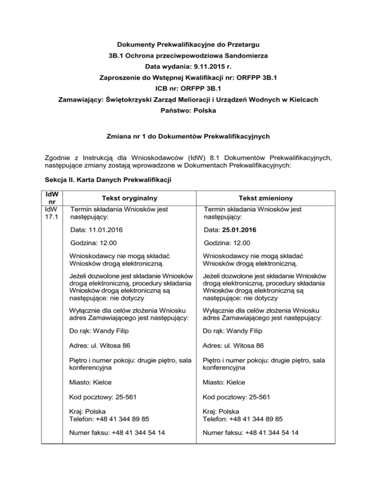 Dokumenty Prekwalifikacyjne do Przetargu 3B.1 Ochrona przeciwpowodziowa Sandomierza Data wydania: 9.11.2015 r. Zaproszenie do Wstępnej Kwalifikacji nr: ORFPP 3B.1 ICB nr: ORFPP 3B.1 Zamawiający: Świętokrzyski Zarząd Melioracji i Urządzeń Wodnych w Kielcach Państwo: Polska Zmiana nr 1 do Dokumentów Prekwalifikacyjnych Zgodnie z Instrukcją dla Wnioskodawców (IdW) 8.1 Dokumentów Prekwalifikacyjnych, następujące zmiany zostają wprowadzone w Dokumentach Prekwalifikacyjnych: Sekcja II. Karta Danych Prekwalifikacji IdW nr IdW 17.1 Tekst oryginalny Tekst zmieniony Termin składania Wniosków jest następujący: Termin składania Wniosków jest następujący: Data: 11.01.2016 Data: 25.01.2016 Godzina: 12.00 Godzina: 12.00 Wnioskodawcy nie mogą składać Wniosków drogą elektroniczną. Wnioskodawcy nie mogą składać Wniosków drogą elektroniczną. Jeżeli dozwolone jest składanie Wniosków drogą elektroniczną, procedury składania Wniosków drogą elektroniczną są następujące: nie dotyczy Jeżeli dozwolone jest składanie Wniosków drogą elektroniczną, procedury składania Wniosków drogą elektroniczną są następujące: nie dotyczy Wyłącznie dla celów złożenia Wniosku adres Zamawiającego jest następujący: Wyłącznie dla celów złożenia Wniosku adres Zamawiającego jest następujący: Do rąk: Wandy Filip Do rąk: Wandy Filip Adres: ul. Witosa 86 Adres: ul. Witosa 86 Piętro i numer pokoju: drugie piętro, sala konferencyjna Piętro i numer pokoju: drugie piętro, sala konferencyjna Miasto: Kielce Miasto: Kielce Kod pocztowy: 25-561 Kod pocztowy: 25-561 Kraj: Polska Telefon: +48 41 344 89 85 Kraj: Polska Telefon: +48 41 344 89 85 Numer faksu: +48 41 344 54 14 Numer faksu: +48 41 344 54 14 Adres poczty elektronicznej: [email protected] IdW 19.1 Otwarcie Wniosków odbędzie się w dniu 11.01.2016 r. o godzinie 12.00 w siedzibie Zamawiającego, tj. w Świętokrzyskim ZMiUW w Kielcach, ul. Witosa 86, sala konferencyjna, 25-561 Kielce, Polska Adres poczty elektronicznej: [email protected] Otwarcie Wniosków odbędzie się w dniu 25.01.2016 r. o godzinie 12.00 w siedzibie Zamawiającego, tj. w Świętokrzyskim ZMiUW w Kielcach, ul. Witosa 86, sala konferencyjna, 25-561 Kielce, Polska Pozostałe zapisy Dokumentu Wstępnej Kwalifikacji pozostają bez zmian.