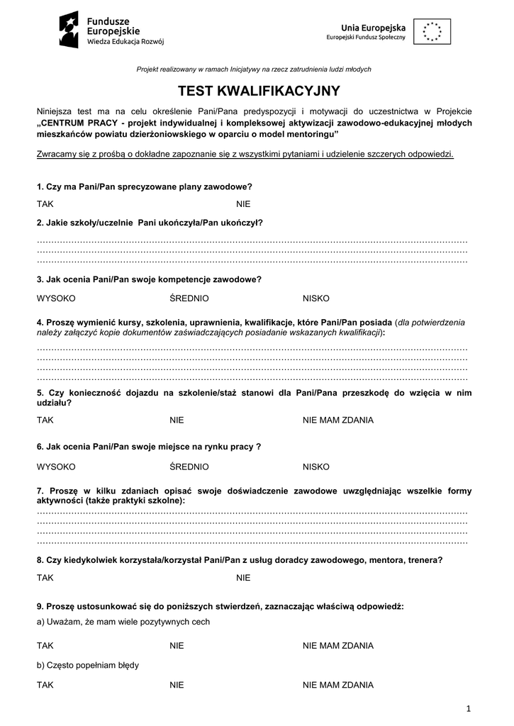 Projekt realizowany w ramach Inicjatywy na rzecz zatrudnienia ludzi młodych TEST KWALIFIKACYJNY Niniejsza test ma na celu określenie Pani/Pana predyspozycji i motywacji do uczestnictwa w Projekcie „CENTRUM PRACY - projekt indywidualnej i kompleksowej aktywizacji zawodowo-edukacyjnej młodych mieszkańców powiatu dzierżoniowskiego w oparciu o model mentoringu” Zwracamy się z prośbą o dokładne zapoznanie się z wszystkimi pytaniami i udzielenie szczerych odpowiedzi. 1. Czy ma Pani/Pan sprecyzowane plany zawodowe? TAK NIE 2. Jakie szkoły/uczelnie Pani ukończyła/Pan ukończył? …………………………………………………………………………………………………………………………………… …………………………………………………………………………………………………………………………………… …………………………………………………………………………………………………………………………………… 3. Jak ocenia Pani/Pan swoje kompetencje zawodowe? WYSOKO ŚREDNIO NISKO 4. Proszę wymienić kursy, szkolenia, uprawnienia, kwalifikacje, które Pani/Pan posiada (dla potwierdzenia należy załączyć kopie dokumentów zaświadczających posiadanie wskazanych kwalifikacji): …………………………………………………………………………………………………………………………………… …………………………………………………………………………………………………………………………………… …………………………………………………………………………………………………………………………………… …………………………………………………………………………………………………………………………………… 5. Czy konieczność dojazdu na szkolenie/staż stanowi dla Pani/Pana przeszkodę do wzięcia w nim udziału? TAK NIE NIE MAM ZDANIA 6. Jak ocenia Pani/Pan swoje miejsce na rynku pracy ? WYSOKO ŚREDNIO NISKO 7. Proszę w kilku zdaniach opisać swoje doświadczenie zawodowe uwzględniając wszelkie formy aktywności (także praktyki szkolne): …………………………………………………………………………………………………………………………………… …………………………………………………………………………………………………………………………………… …………………………………………………………………………………………………………………………………… …………………………………………………………………………………………………………………………………… 8. Czy kiedykolwiek korzystała/korzystał Pani/Pan z usług doradcy zawodowego, mentora, trenera? TAK NIE 9. Proszę ustosunkować się do poniższych stwierdzeń, zaznaczając właściwą odpowiedź: a) Uważam, że mam wiele pozytywnych cech TAK NIE NIE MAM ZDANIA NIE NIE MAM ZDANIA b) Często popełniam błędy TAK 1 Projekt realizowany w ramach Inicjatywy na rzecz zatrudnienia ludzi młodych c) Nie wierzę we własne siły TAK NIE NIE MAM ZDANIA d) Niepokoję się o swoją przyszłość TAK NIE NIE MAM ZDANIA e) Mam powody, aby być z siebie dymnym/dumną TAK NIE NIE MAM ZDANIA f) Potrafię osiągnąć to, co sobie zamierzyłam/zamierzyłem TAK NIE NIE MAM ZDANIA 10. Które z proponowanych form wsparcia dostępnych w ramach Projektu interesują Panią/Pana najbardziej? (można zaznaczyć więcej niż jedną odpowiedź) doradcze zajęcia grupowe przygotowujące do efektywnego poruszania się po rynku pracy, indywidualne konsultacje mające na celu zaplanowanie ścieżki rozwoju zawodowego, praktyczna nauka zawodu zorganizowana w zakładach pracy (staż), kursy podnoszące kwalifikacje, szkolenia z zakresu komunikacji, zarządzania czasem, walki ze stresem, itp., wizyty studyjne u pracodawców, prezentujące realia pracy w danym zawodzie. 11. Proszę ustosunkować się do poniższych stwierdzeń, zaznaczając właściwą odpowiedź: Udział w projekcie stanowi dla mnie: a) wyzwanie, któremu chcę sprostać TAK NIE NIE MAM ZDANIA b) szansę na znalezienie atrakcyjnej pracy TAK NIE NIE MAM ZDANIA c) możliwość poszerzenia swojej wiedzy TAK NIE NIE MAM ZDANIA d) okazję do zdobycia nowych doświadczeń TAK NIE NIE MAM ZDANIA e) możliwość wypełnienia wolnego czasu TAK NIE NIE MAM ZDANIA 12. Z podanych par stwierdzeń proszę wybrać te, które w większym stopniu dotyczą Pani/Pana osoby. Jestem wytrwała/wytrwały w dążeniu do celu Jestem osobą pracowitą Lubię wykonywać nieskomplikowane zadania Szybko się zniechęcam, jeśli coś mi się nie udaje Wolę się nudzić niż ciężko pracować Lubię wykonywać zadania trudne 2 Projekt realizowany w ramach Inicjatywy na rzecz zatrudnienia ludzi młodych 13. Proszę przeczytać uważnie podane niżej stwierdzenia i podkreśl jedną z podanych odpowiedzi: a) Najbardziej cenię taką pracę, która: daje poczucie bezpieczeństwa materialnego, ale stawia wyzwania, jest dla mnie koniecznością, gdyż zabezpiecza mi prestiż społeczny, sprawia mi najwięcej przyjemności z racji jej wykonywania, ale nie zawsze daje poczucie bezpieczeństwa materialnego. b) Gdybym miał/-a możliwość swobodnego wyboru układu pracy to: pracy w układzie: człowiek-tworzywo, pracy w układzie człowiek-maszyna, komputer, samochód, itp., dominującym układem jest człowiek-człowiek, praca samodzielna w domu. 14. Na jakie zmiany jest Pani/Pan gotowa/y w swoim życiu? …………………………………………………………………………………………………………………………………… …………………………………………………………………………………………………