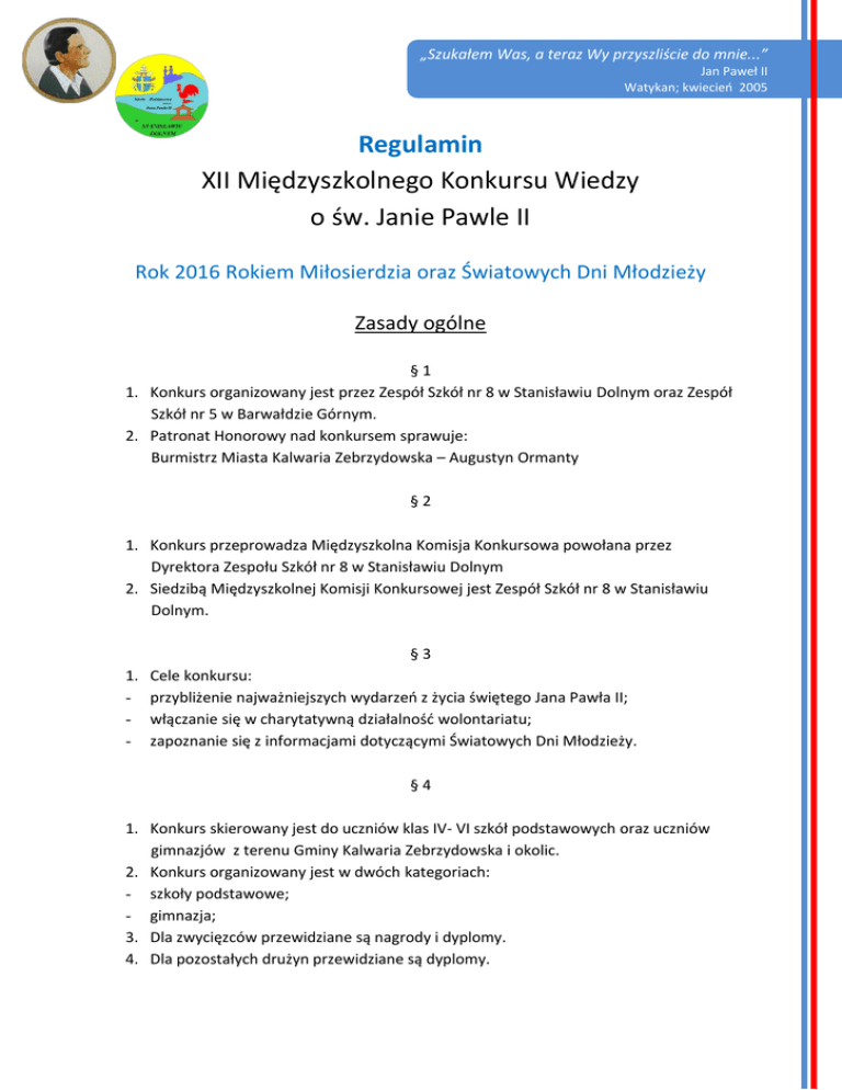 „Szukałem Was, a teraz Wy przyszliście do mnie...” Jan Paweł II Watykan; kwiecień 2005 Regulamin XII Międzyszkolnego Konkursu Wiedzy o św. Janie Pawle II Rok 2016 Rokiem Miłosierdzia oraz Światowych Dni Młodzieży Zasady ogólne §1 1. Konkurs organizowany jest przez Zespół Szkół nr 8 w Stanisławiu Dolnym oraz Zespół Szkół nr 5 w Barwałdzie Górnym. 2. Patronat Honorowy nad konkursem sprawuje: Burmistrz Miasta Kalwaria Zebrzydowska – Augustyn Ormanty §2 1. Konkurs przeprowadza Międzyszkolna Komisja Konkursowa powołana przez Dyrektora Zespołu Szkół nr 8 w Stanisławiu Dolnym 2. Siedzibą Międzyszkolnej Komisji Konkursowej jest Zespół Szkół nr 8 w Stanisławiu Dolnym. §3 1. - Cele konkursu: przybliżenie najważniejszych wydarzeń z życia świętego Jana Pawła II; włączanie się w charytatywną działalność wolontariatu; zapoznanie się z informacjami dotyczącymi Światowych Dni Młodzieży. §4 1. Konkurs skierowany jest do uczniów klas IV- VI szkół podstawowych oraz uczniów gimnazjów z terenu Gminy Kalwaria Zebrzydowska i okolic. 2. Konkurs organizowany jest w dwóch kategoriach: - szkoły podstawowe; - gimnazja; 3. Dla zwycięzców przewidziane są nagrody i dyplomy. 4. Dla pozostałych drużyn przewidziane są dyplomy. XII Międzyszkolny Konkurs Wiedzy o św. Janie Pawle II §5 1. Informacje dotyczące organizacji, przebiegu i wyników konkursu będą przekazywane przez stronę internetową Zespołu Szkół nr 8 w Stanisławiu Dolnym www.sp1stanislawd.prv.pl, tel./fax 33 8767677 PRZEBIEG KONKURSU Kategoria: szkoła podstawowa i gimnazjum § 6 1. W konkursie przewidziane są dwa etapy: szkolny i międzyszkolny. §7 Etap szkolny: 1. Etap szkolny wyłania trzyosobową drużynę (z każdej kategorii), reprezentującą daną szkołę. 2. Dyrektor szkoły zgłasza drużynę do etapu międzyszkolnego drogą elektroniczną (w/g załącznika) do dnia1 kwietnia 2016r. na adres e-mail: [email protected] 3. Wyłoniona drużyna na podstawie podanej literatury przygotowuje się do konkursu oraz przygotowuje album. Zapewne każda szkoła podejmuje w roku szkolnym 2015/2016 działania o charakterze charytatywnym np. „Szlachetna paczka”, „Akcje mikołajkowe”, pomoc starszym, chorym itp. W związku z powyższym reprezentanci szkół wykonują album, ilustrujący podjęte lub realizowane działania. a) Album to zadanie dla obu kategorii konkursowych (szkoła podstawowa i gimnazjum), jeżeli z zespołu szkół zgłoszono reprezentację w obu kategoriach, album wykonują wspólnie. b) Album należy wykonać na formacie A4. Powinien zawierać krótki, zwięzły opis podjętego działania, ilustracje, zdjęcia itp. c) Na odwrocie pracy należy umieścić nazwę szkoły. d) Prace przywożone są w dniu konkursu. Reprezentant drużyny krótko ( max 2 minuty) referuje treść albumu. Wymienia podjęte działania i obejmuje refleksją to, co przyniosło uczniom ich szkoły najwięcej satysfakcji. e) Każda szkoła zarówno podstawowa jak i gimnazjum otrzymują za to zadanie max. 5 pkt. XII Międzyszkolny Konkurs Wiedzy o św. Janie Pawle II f) Albumy będą do wglądu dla wszystkich uczestników konkursu w dniu 26 kwietnia, do 06.05.2016 można je obejrzeć w ZS nr 8 w Stanisławiu Dolnym, od 09.05. do 16.05.2016 roku w ZS nr 5 w Barwałdzie Górnym. Od 17 -20 maja można je odebrać z ZS nr 5 w Barwałdzie Górnym. §8 Etap międzyszkolny ( szkoły podstawowe i gimnazja) Etap międzyszkolny składa się z czterech części: I część – prezentacja albumów II część – pisemny test sprawdzający znajomość podanej literatury. Każdy z uczestników indywidualnie pisze test. Punkty uzyskane przez poszczególnych uczestników sumuje się, a następnie dzieli przez liczbę uczestników - średnia będzie doliczana do punktacji całej drużyny. III część – ustne odpowiedzi drużyny na pytania. 1. Drużyny z poszczególnych kategorii losują pytania i udzielają ustnych odpowiedzi, zgodnie z podaną literaturą za 2 pkt - rozpoznają cytaty, - rozpoznają zdjęcia, - identyfikują daty i wydarzenia, 2. Uczestnicy udzielają pełnych odpowiedzi. 3. W przypadku niepełnej odpowiedzi drużyna otrzymuje 1 pkt (decyduje o tym komisja konkursowa) Komisja konkursowa z każdej kategorii wyłoni maksymalnie 3 najlepsze drużyny, które wchodzą do ścisłego finału. IV część FINAŁ – ustne odpowiedzi drużyny na pytania po 3 pkt. 1. Uczestnicy udzielają pełnych odpowiedzi. W innym wypadku otrzymują 0 pkt. 2. Drużyny, które uzyskają tytuł laureata otrzymają nagrody i dyplomy. Pozostałe drużyny otrzymają dyplomy. 3. Rozstrzygnięcia międzyszkolnej komisji konkursowej są ostateczne. Nie przysługuje od nich odwołanie. XII Międzyszkolny Konkurs Wiedzy o św. Janie Pawle II §9 Terminarz Konkursu: 1. Etap szkolny – należy przeprowadzić w szkołach do 23 marca 2016r. Zgłoszenia do etapu międzyszkolnego- do 1 kwietnia 2016r. 2. Etap międzyszkolny: 26 kwietnia 2016 r. godz. 9.30 – 13.00 Program: 9:30 – zgłoszenie drużyn 9:45 – 10: 30- uroczyste rozpoczęcie konkursu oraz prezentacja albumów 10:30 – 11:15- część pisemna (szkoła podstawowa) część ustna (gimnazjum) 11:15 – 12:00 - część pisemna (gimnazjum) część ustna (szkoła podstawowa ) 12:00 – 12:30 - finał szkół podstawowych i gimnazjum 12:30 – 13:00 - podsumowanie konkursu i rozdanie nagród, przekazanie ,,darów" przedstawicielom Warsztatów Terapii Zajęciowej z Zebrzydowic. Postanowienia końcowe § 10 1. Regulamin konkursu jest dostępny na stronie internetowej www.sp1stanislawd.prv.pl 2. Szczegółowych informacji o konkursie udzielają: mgr Małgorzata Job-Rozum nauczyciel Zespołu Szkół nr 8w Stanisławiu Dolnym, tel. (33) 8767677; e-mail: [email protected] mgr Gabriela Szwed – Woźnica nauczyciel Zespołu Szkół nr 5 w Barwałdzie Górnym, tel. (33) 8765225; e-mail: [email protected] mgr Elżbieta Warchał nauczyciel Zespołu Szkół nr 5 w