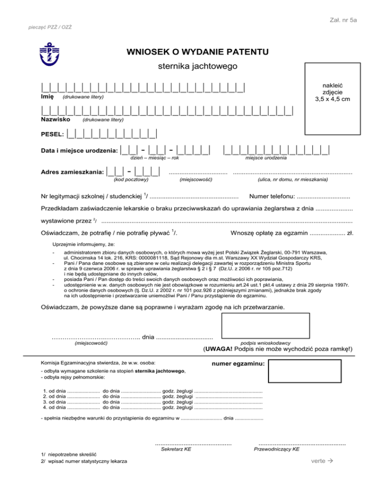 Zał. nr 5a pieczęć PZŻ / OZŻ WNIOSEK O WYDANIE PATENTU sternika jachtowego |_|_|_|_|_|_|_|_|_|_|_|_|_|_|_|_|_|_|_|_|_|_|_|_|_| Imię nakleić zdjęcie 3,5 x 4,5 cm (drukowane litery) |_|_|_|_|_|_|_|_|_|_|_|_|_|_|_|_|_|_|_|_|_|_|_|_|_|_|_|_|_|_|_| Nazwisko PESEL: (drukowane litery) |_|_|_|_|_|_|_|_|_|_|_| Data i miejsce urodzenia: |_|_| - |_|_| - |_|_|_|_| |_|_|_|_|_|_|_|_|_|_|_|_|_| dzień – miesiąc – rok Adres zamieszkania: |_|_| - |_|_|_| miejsce urodzenia ................................. ................................................................... (kod pocztowy) (miejscowość) (ulica, nr domu, nr mieszkania) 1 Nr legitymacji szkolnej / studenckiej / .................................................. Numer telefonu: .............................. Przedkładam zaświadczenie lekarskie o braku przeciwwskazań do uprawiania żeglarstwa z dnia ..................... wystawione przez 2/ ............................................................................................................................................. 1 Oświadczam, że potrafię / nie potrafię pływać /. Wnoszę opłatę za egzamin .................... zł. Uprzejmie informujemy, że: - administratorem zbioru danych osobowych, o których mowa wyżej jest Polski Związek Żeglarski, 00-791 Warszawa, ul. Chocimska 14 lok. 216, KRS: 0000081118, Sąd Rejonowy dla m.st. Warszawy XX Wydział Gospodarczy KRS, Pani / Pana dane osobowe są zbierane w celu realizacji delegacji zawartej w rozporządzeniu Ministra Sportu z dnia 9 czerwca 2006 r. w sprawie uprawiania żeglarstwa § 2 i § 7 (Dz.U. z 2006 r. nr 105 poz.712) i nie będą udostępniane do innych celów, posiada Pani / Pan dostęp do treści swoich danych osobowych oraz możliwości ich poprawiania, udostępnienie w.w. danych osobowych nie jest obowiązkowe w rozumieniu art.24 ust.1 pkt.4 ustawy z dnia 29 sierpnia 1997r. o ochronie danych osobowych (tj. Dz.U. z 2002 r. nr 101 poz.926 z późniejszymi zmianami), jednakże brak zgody na ich udostępnienie i przetwarzanie uniemożliwi Pani / Panu przystąpienie do egzaminu. Oświadczam, że powyższe dane są poprawne i wyrażam zgodę na ich przetwarzanie. BBBBBBBB.BBBBB.. dnia ................................ (miejscowość) podpis wnioskodawcy (UWAGA! Podpis nie może wychodzić poza ramkę!) Komisja Egzaminacyjna stwierdza, że w.w. osoba: numer egzaminu: - odbyła wymagane szkolenie na stopień sternika jachtowego, - odbyła rejsy pełnomorskie: 1. od dnia ....................... 2. od dnia ....................... 3. od dnia ....................... 4. od dnia ....................... do dnia ............................ godz. żeglugi ................................................ do dnia ............................ godz. żeglugi ............................................... do dnia ............................ godz. żeglugi ................................................ do dnia ............................ godz. żeglugi ................................................ - spełnia niezbędne warunki do przystąpienia do egzaminu w ............................. dnia .................... ........................................... Sekretarz KE 1/ niepotrzebne skreślić 2/ wpisać numer statystyczny lekarza ................................................. Przewodniczący KE verte -2- KARTA EGZAMINACYJNA na stopień sternika jachtowego Imię i nazwisko kandydata: B....................................................................................................................... lp. oceny egzaminatorów przedmiot data 1. 2. 3 4. 5. 6. 7. 8. 9. 10. 11. ocena 1/ podpis Przepisy Wiadomości o jachtach Nawigacja Locja Meteorologia Ratownictwo Sygnalizacja, łączność Silniki Prace bosmańskie Manewrowanie jachtem pod żaglami Manewrowanie jachtem na silniku Ogólna ocena egzaminu: B................................................................................................................................. B............................................................................................................... dnia B............................................... Opłata za patent: B.......................... zł. Przewodniczący Komisji Egzaminacyjnej B.................................................................... podpis i pieczątka imienna 1 / oceny wpisywać cyfrą i słownie: 5 (bardzo dobry) 4 (dobry) 3 (dostateczny) 2 (niedostateczny) mz