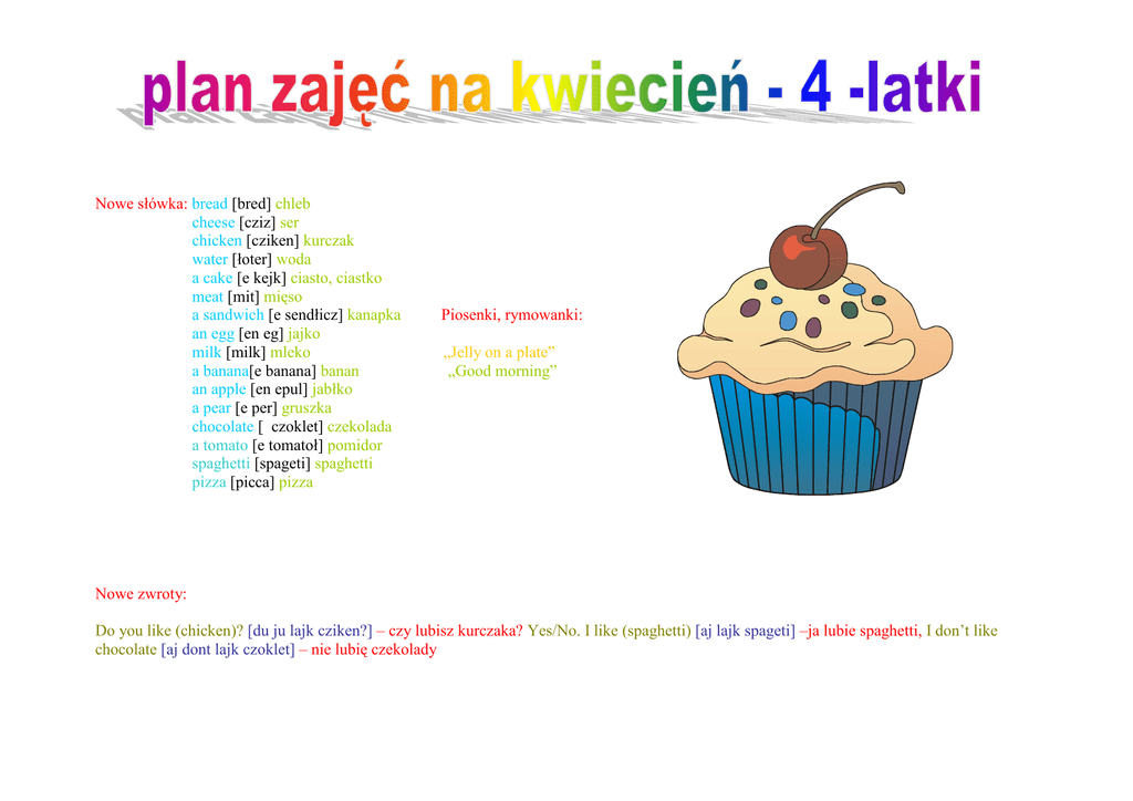 Nowe słówka: bread [bred] chleb cheese [cziz] ser chicken [cziken] kurczak water [łoter] woda a cake [e kejk] ciasto, ciastko meat [mit] mięso a sandwich [e sendłicz] kanapka an egg [en eg] jajko milk [milk] mleko a banana[e banana] banan an apple [en epul] jabłko a pear [e per] gruszka chocolate [ czoklet] czekolada a tomato [e tomatoł] pomidor spaghetti [spageti] spaghetti pizza [picca] pizza Piosenki, rymowanki: „Jelly on a plate” „Good morning” Nowe zwroty: Do you like (chicken)? [du ju lajk cziken?] – czy lubisz kurczaka? Yes/No. I like (spaghetti) [aj lajk spageti] –ja lubie spaghetti, I don’t like chocolate [aj dont lajk czoklet] – nie lubię czekolady