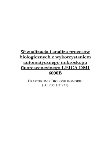 Wizualizacja i analiza procesów biologicznych z wykorzystaniem automatycznego mikroskopu fluorescencyjnego LEICA DMI 6000B PRAKTIKUM Z BIOLOGII KOMÓRKI (BT 206, BT 231) Wizualizacja i analiza procesów... BT 206, BT 231 Wizualizacja i analiza procesów biologicznych z wykorzystaniem automatycznego mikroskopu fluorescencyjnego LEICA DMI 6000B Mikroskopia fluorescencyjna całkowitego wewnętrznego odbicia (ang. Total Internal Reflection Fluorescence Microscope) jest jedną z odmian mikroskopii fluorescencyjnej pozwalającą na obrazowanie próbek tylko do określonej głębokości, zwykle do 200-250 nm w głąb. Zasada TIRFM polega na oświetleniu próbki światłem wzbudzającym, jednak pod takim kątem (kąt graniczny), by padające światło uległo całkowitemu wewnętrznemu odbiciu przed wejściem do próbki, albo w szkiełku nakrywającym próbkę (typ epi-) albo w kwarcowym pryzmacie (typ trans-). Rys. 1. Mikroskopia fluorescencyjna całkowitego wewnętrznego odbicia http://microscopy.duke.edu/introtomicroscopy/tirf.html Zjawisku całkowitego wewnętrznego odbicia towarzyszy powstanie fali zanikającej (wiąże się to z różnicą między współczynnikiem załamania światła szkła, czy kwarcu i wody, czyli próbki – współczynnik ten dla szkła (kwarcu) jest większy), która nie ulega odbiciu, ale penetruje środowisko (próbkę) po drugiej stronie szkiełka lub pryzmatu. Czyni to jednak tylko na pewną określoną głębokość (fala ta zanika wykładniczo wraz z odległością), co w praktyce oznacza zwykle około 100-250 nm. W tym obszarze głębokości próbki, fala ta może wzbudzić obecne w próbce fluorofory, a one zaczną emitować światło (co ważne, fala zanikająca ma tę samą długość co fala która uległa odbiciu). To emitowane światło jest następnie odbierane przez obiektyw, przepuszczane przez odpowiednie filtry i przetwarzane jak w klasycznym mikroskopie fluorescencyjnym. W ten sposób w TIRFM następuje bardzo selektywna wizualizacja obszarów położonych zaraz pod szkiełkiem lub pryzmatem, ponieważ obszar wzbudzenia powstaje tylko w zasięgu fali zanikającej, co znacznie ogranicza wpływ tła (wnętrza komórki), zwiększając rozdzielczość uzyskanych obrazów. 2 BT 206, BT 231 Wizualizacja i analiza procesów... BT 206, BT 231 Cel doświadczenia: Celem ćwiczenia jest praktyczne zapoznanie się z metodą całkowitego odbicia wewnętrznego fluorescencji (TIRF) oraz wykorzystanie jej w wizualizacji białek cytoszkieletu komórek. Ustawienie mikroskopu LEICA DMI 6000B do pracy: 1. Włączyć laser oraz kamerę Hamamatsu. 2. Włączyć sterownik mocy lasera (Lasos). W tym celu przełącznik ustawić w pozycji „laser run” natomiast pokrętło regulacji mocy lasera w pozycji minimalnej. 3. Włączyć mikroskop oraz lampę fluorescencyjną i poczekać, aż stolik mikroskopowy zinicjalizuje się. 4. Włączyć komputer oraz uruchomić program „Las AF”: a) Kliknąć OK b) Kliknąć NO 5. W zakładce Experiment utworzyć nowy eksperyment klikając NEW. 6. W zakładce Setup ustawić obiektyw HCX PL APO 40x 1,25 OIL. 7. Ustawić kanały (aby dodać nowy kanał kliknąć ikonę „+” poniżej FCr): a) w świetle przechodzącym, z różnicowym kontrastem Nomarskiego (DIC) klikając w oknie Contrast Method TL-DIC, a następnie przyporządkować mu maskę szarą klikając na ikonę palety z pędzlem i wybierając kolor Grey b) fluorescencyjny TRITC (wzbudzenie światło zielone, emisja swiatło czerwone) w oknie Contrast Method wybrać FLUO, ustawić w oknie Filter Cube N21, a następnie przyporządkować mu maskę czerwoną c) fluorescencyjny Alexa 488 (wzbudzenie światło niebieskie, emisja światło zielone), w oknie Contrast Method wybrać FLUO, ustawić w oknie Filter Cube L5, przyporządkować mu maskę zieloną 8. Na preparat nanieść kroplę olejku immersyjnego i umieścić na mikroskopowym szkiełkiem nakrywkowym do dołu. 9. Ustawić ostry obraz preparatu za pomocą joystica. 10. W zakładce Setup zmieniamy obiektyw na HCX PL APO 100x 1,47 OIL. 11. Ustawiamy ostry obraz preparatu za pomocą joystica. 12. Dodac kolejny kanał klikając „+”: stoliku a) Kanał TIRF, w oknie Contrast Method wybrać TIRF, przyporządkowac mu maskę zieloną 13. Następnie należy wycentrować wiązkę lasera: a) W zakładce Acquisition rozwinąć panel TIRF oraz kliknąć Autoalign UWAGA!!! Sprawdzić czy wszystkie okna czarnego obudowania mikroskopu są zamknięte!!! Nie wolno patrzeć w wiązkę światła lasera!!! 3 BT 206, BT 231 Wizualizacja i analiza procesów... BT 206, BT 231 b) Postępować zgodnie z wyświetloną w lewym oknie instrukcją c) Po zakończeniu Autoalign zamknąć okno 14. W tym momencie mikroskop przygotowany jest do pracy w trybie Fluo i TIRF. Wykonanie ćwiczenia: 1. Oglądnąć otrzymany preparat w świetle przechodzącym oraz fluorescencji: a) wybrać odpowiedni kanał b) włączyć podgląd obrazu na monitorze (ikona LIVE) c) w zakładce Acquisition, panelu Image wybrać odpowiednią intensywność fluorescencji (suwak Intensity) oraz czas ekspozycji (suwak Exposure) d) wykonać zdjęcie naciskając Single Image 2. W zakładce Experiment zaznaczyć wszystkie trzy zdjęcia (trzymając Ctr), kliknąć prawy przycisk myszy i wybrać Overlay. 3. Włączyć kanał TIRF a następnie podgląd obrazu na monitorze (ikona LIVE). 4. Oglądnąć wybarwione struktury w zależności od głębokości badanego preparatu oraz kierunku padania wiązki lasera: a) W zakładce Acquisition panelu TIRF wybierać różną głębokość próbki (70 – 250 nm) b) Za pomocą ikon ze strzałkami wybrać kierunek padania wiązki lasera 5. Wykonać zdjęcia w kanałach przechodzącym, fluorescencyjnym oraz TIRF. 6. Nałożyć i porównać otrzymane obrazy. Po zakończonej pracy wyczyścić obiektywy z olejku immersyjnego!!! Zagadnienia: − Mikroskopia fluorescencyjna − TIRF − Podstawowe pojęcia z fizyki optycznej (odbicie i załamanie światła