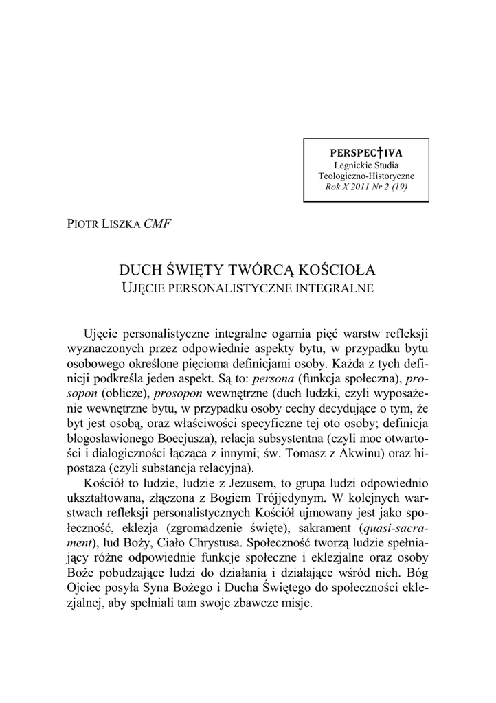 PERSPEC † IVA Legnickie Studia Teologiczno-Historyczne Rok X 2011 Nr 2 (19) PIOTR LISZKA CMF DUCH ŚWIĘTY TWÓRCĄ KOŚCIOŁA UJĘCIE PERSONALISTYCZNE INTEGRALNE Ujęcie personalistyczne integralne ogarnia pięć warstw refleksji wyznaczonych przez odpowiednie aspekty bytu, w przypadku bytu osobowego określone pięcioma definicjami osoby. Każda z tych definicji podkreśla jeden aspekt. Są to: persona (funkcja społeczna), prosopon (oblicze), prosopon wewnętrzne (duch ludzki, czyli wyposażenie wewnętrzne bytu, w przypadku osoby cechy decydujące o tym, że byt jest osobą, oraz właściwości specyficzne tej oto osoby; definicja błogosławionego Boecjusza), relacja subsystentna (czyli moc otwartości i dialogiczności łącząca z innymi; św. Tomasz z Akwinu) oraz hipostaza (czyli substancja relacyjna). Kościół to ludzie, ludzie z Jezusem, to grupa ludzi odpowiednio ukształtowana, złączona z Bogiem Trójjedynym. W kolejnych warstwach refleksji personalistycznych Kościół ujmowany jest jako społeczność, eklezja (zgromadzenie święte), sakrament (quasi-sacrament), lud Boży, Ciało Chrystusa. Społeczność tworzą ludzie spełniający różne odpowiednie funkcje społeczne i eklezjalne oraz osoby Boże pobudzające ludzi do działania i działające wśród nich. Bóg Ojciec posyła Syna Bożego i Ducha Świętego do społeczności eklezjalnej, aby spełniali tam swoje zbawcze misje. Duch Święty twórcą Kościoła 175 Duch Święty przebywa wśród ludzi, aby zobaczyli Jezusa Chrystusa, zwrócili się ku niemu i gromadzili się wokół Niego, przemienia ducha ludzkiego, tworzy relacje między ludźmi oraz między osobami ludzkimi a osobami boskimi i przenika ludzi swoją boską energią. Refleksja nad tworzeniem Kościoła poprzez realizację kolejnych idei wymaga wielorakiego rozumienia terminu „pochodzenie” (J 15,26). Odpowiednio w poszczególnych warstwach są to następujące słowa greckie: pempfesthai (w J 15,16: pempfo), ekporeuethai, ekporeuomenon, proienai, proballein. 1. KOŚCIÓŁ JAKO SPOŁECZNOŚĆ Jezus posyła nam Ducha Świętego. Można zaobserwować nie tyle samo działanie, co raczej skutki działania: gołębica nad Jezusem stojącym w rzece Jordan podczas chrztu dokonywanego przez św. Jana Chrzciciela, szum i języki ognia nad ludźmi w dniu Pięćdziesiątnicy, radość i pokój w Duchu Świętym i wiele innych zjawisk. W warstwie refleksji dotyczącej działania osoba definiowana jest jako persona, czyli ktoś spełniający w czasie i przestrzeni swoje funkcje społeczne, w określonym miejscu, ale też wymagające przemieszczania się. Duch Święty to osoba działająca wśród uczniów Jezusa, która popycha ich do działania, poucza o drogach zbawienia i daje energię do wypełniania wielorakich zadań: do spełniania funkcji i przeżywania zbawczych wartości, do życia według Ewangelii. W ten sposób tworzy On z poszczególnych jednostek społeczność zorganizowaną według zbawczego planu opisanego w świętych księgach, czyli tworzy Kościół jako społeczność. 2. KOŚCIÓŁ JAKO ZGROMADZENIE ŚWIĘTE Warstwa refleksji personalistycznej dotycząca sfery zewnętrznej posługuje się definicją osoby jako prosopon (oblicze). Oblicze objawia to, co jest wewnątrz. Zewnętrze jest adekwatne do wnętrza, jest to swoiste promieniowanie wnętrza. Warstwa refleksji dotycząca działania (persona) bardziej koncentruje się ku środowisku (ku zewnętrzu), w którym osoba przebywa, natomiast mówienie o osobie jako 176 PIOTR LISZKA CMF obliczu kieruje myśl już ku komuś, kto działa (ku wnętrzu). Przedmiotem jest pogranicze osoby i środowiska, jej najbliższe otoczenie. Od oblicza jest już tylko jeden krok do wnętrza, do rdzenia osoby. Ta warstwa refleksji znajduje się między czasoprzestrzenią a niepodlegającą jej osobową głębią jaźni. W tej warstwie myślenia Duch Święty określany jest słowem ekporeuethai. Dokładnie takiego słowa użył św. Jan w swojej Ewangelii (para tou Patros ekporeuethai), czyli „który od strony Ojca do nas przechodzi”, przechodzi przez przepaść oddzielającą byt Boga od bytów stworzonych z taką łatwością, jak przez bród na rzece. Taki jest dokładny sens słów J 15,26. Wychodzenie Ducha Świętego od Ojca na zewnątrz życia wewnętrznego Boga Trójjedynego (ad extra) oznacza, że trzecia osoba Trójcy jest widziana jako promieniowanie ojcostwa osoby pierwszej. Wewnątrz boskości (ad intra) jest On boskim obrazem Ojca, chwała z chwały (kadosz). Oblicze trzeciej osoby ukazywane Ojcu nie jest dla nas w żaden sposób widoczne. Na zewnątrz boskości natomiast promieniuje jako prosopon zewnętrzne, jako blask chwały (szekina). Przychodząc do świata, nakłania ludzi do zwrócenia się ku Chrystusowi, a także ku sobie nawzajem. Ludzie popychani energią personalną trzeciej osoby Trójcy gromadzą się wokół Chrystusa, gromadzą się razem dla uwielbiania Boga Trójjedynego. Przechodzenie Ducha Świętego od Ojca do świata niejako przedłuża się, tworząc linię energii przechodzącą od ludzi do Chrystusa. Ludzie zostają porwani przez rzekę mocy Ducha Świętego, który wewnątrz Trójcy przechodzi od Ojca do Syna, co zostaje „przedłużone” czasoprzestrzennie w świecie. Dzięki temu jednostki spełniające różne funkcje w Kościele rozumianym jako społeczność nachylają się ku Chrystusowi, otaczają go, tworząc zgromadzenie święte. 3. KOŚCIÓŁ JAKO SAKRAMENT Spotkanie ludzi z Chrystusem w mocy Ducha Świętego, posłanego przez Chrystusa i wychodzącego od Ojca, aby przejść do świata i pouczać o prawdzie, przemienia ducha ludzkiego, czyli intelekt, wolę i uczucia (miłość). Warstwa trzecia refleksji personalistycznej zajmuje się tym, co wyróżnia osobę od innych bytów, zwraca uwagę na trzy istotne elementy personalistyczne, a także na właściwości we- Duch Święty twórcą Kościoła 177 wnętrzne specyficzne, które odróżniają
