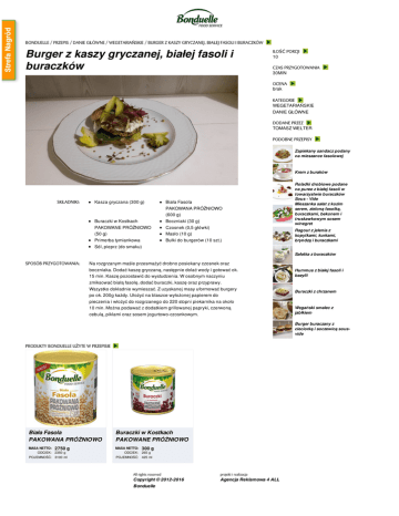 BONDUELLE / PRZEPIS / DANIE GŁÓWNE / WEGETARIAŃSKIE / BURGER Z KASZY GRYCZANEJ, BIAŁEJ FASOLI I BURACZKÓW Burger z kaszy gryczanej, białej fasoli i buraczków ILOŚĆ PORCJI 10 CZAS PRZYGOTOWANIA 30MIN OCENA brak KATEGORIE WEGETARIAŃSKIE DANIE GŁÓWNE DODANE PRZEZ TOMASZ WELTER PODOBNE PRZEPISY Zapiekany sandacz podany na mieszance fasolowej Krem z buraków SKŁADNIKI: Kasza gryczana (300 g) Biała Fasola Buraczki w Kostkach PAKOWANA PRÓŻNIOWO (600 g) Boczniaki (30 g) PAKOWANE PRÓŻNIOWO (50 g) Primerba tymiankowa Czosnek (0,5 główki) Masło (10 g) Bułki do burgerów (10 szt.) Roladki drobiowe podane na puree z białej fasoli w towarzystwie buraczków Sous - Vide Mieszanka sałat z kozim serem, zieloną fasolką, buraczkami, bekonem i truskawkowym sosem winegret Ragout z jelenia z kopytkami, kurkami, bryndzą i buraczkami Sól, pieprz (do smaku) Sałatka z buraczków SPOSÓB PRZYGOTOWANIA: Na rozgrzanym maśle przesmażyć drobno posiekany czosnek oraz boczniaka. Dodać kaszę gryczaną, następnie dolać wody i gotować ok. 15 min. Kaszę pozostawić do wystudzenia. W osobnym naczyniu zmiksować białą fasolę, dodać buraczki, kaszę oraz przyprawy. Wszystko dokładnie wymieszać. Z uzyskanej masy uformować burgery po ok. 200g każdy. Ułożyć na blaszce wyłożonej papierem do pieczenia i włożyć do rozgrzanego do 220 stopni piekarnika na około 10 min. Można podawać z dodatkiem grillowanej papryki, czerwoną cebulą, piklami oraz sosem jogurtowo-czosnkowym. Hummus z białej fasoli i bazylii Buraczki z chrzanem Wegański smalec z jabłkiem Burger buraczany z cieciorką i soczewicą sousvide PRODUKTY BONDUELLE UŻYTE W PRZEPISIE Biała Fasola PAKOWANA PRÓŻNIOWO Buraczki w Kostkach PAKOWANE PRÓŻNIOWO MASA NETTO: 2750 g ODCIEK: 2350 g POJEMNOŚĆ: 3100 ml MASA NETTO: 300 g ODCIEK: 265 g POJEMNOŚĆ: 425 ml All rights reserved projekt i realizacja Copyright © 2012-2016 Bonduelle Agencja Reklamowa 4 ALL