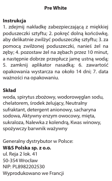 Pre White Instrukcja 1. zdejmij nakładkę zabezpieczającą z miękkiej poduszeczki sztyftu; 2. pokręć dolną końcówkę, aby delikatnie zwilżyć poduszeczkę sztyftu; 3. za pomocą zwilżonej poduszeczki, nanieś żel na zęby; 4. pozostaw żel na zębach przez 10 minut, a następnie dobrze przepłucz jamę ustną wodą; 5. zamknij aplikator nasadką; 6. zawartość opakowania wystarcza na około 14 dni; 7. data ważności na opakowaniu. Skład woda, spirytus zbożowy, wodorowęglan sodu, chelatorem, środek żelujący, Neutralny sufraktant, detergent anionowy, sacharyna sodowa, Aktywny enzym owocowy, mięta, sukraloza, Nalewka z kolendrą, Kwas winowy, spożywczy barwnik ważywny Generalny dystrybutor w Polsce: W&S Polska sp. z o.o. ul. Reja 2 lok. 41 50-354 Wrocław NIP: PL8982202530 Wyprodukowano we Francji