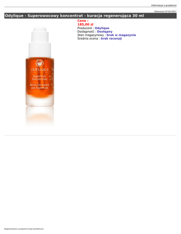 Informacje o produkcie Utworzono 07-03-2017 Odylique - Superowocowy koncentrat - kuracja regenerująca 30 ml Cena : 185,00 zł Producent : Odylique Dostępność : Dostępny Stan magazynowy : brak w magazynie Średnia ocena : brak recenzji Wygenerowano w programie www.oscGold.com Wyjątkowo odżywcza kombinacja organicznego awokado, granatu, głogu oraz owoców rokitnika zwyczajnego, tworząca bogate serum do twarzy. „Superowocowy koncentrat” z wysoką zawartością antyoksydantów oraz niezbędnych nienasyconych kwasów tłuszczowych jest idealnym rozwiązaniem, które chroni przed promieniami UV i wolnymi rodnikami. Jednocześnie wspomaga regenerację komórek skóry i syntezę kolagenu dla uzyskania gładkiej i promiennej skóry. Badania** dowodzą, że owoce uprawiane organicznie mają znacznie wyższy poziom polifenoli – silnych przeciwutleniaczy, które pomagają chronić skórę przed szkodliwym działaniem wolnych rodników – niż te hodowane nieorganicznie. Opakowanie: teraz w pięknej szklanej buteleczce z pipetą ułatwiającą precyzyjne dozowanie kosmetyku. - w 100% naturalny zapach - bez parabenów, - bez glikolu, - bez sztucznych barwników - bez silikonu - bez Phenoxyethanolu - bez PEG i SLS - bez składników GMO - fizjologiczne pH - hypoalergiczny Polecany: ● - do wszystkich typów skóry jako kuracja witaminowa;- szczególnie do skóry suchej i dojrzałej;- pomaga zmniejszyć drobne zmarszczki na twarzy, szyi i dekolcie. Jak używać? Informacje o produkcie ● -wmasować niewielką ilość (1-2 krople) w twarz, szyję i dekolt, aż do całkowitego wchłonięcia;- samodzielnie, na dzienny krem nawilżający, jako kuracja na noc lub cotygodniowa kuracja stymulująca. Kluczowe składniki: ● - granat - bogaty w składniki pokarmowe, które chronią i regenerują skórę;- głóg - wspomaga odbudowę skóry;rokitnik zwyczajny - bogaty w omega 7 pomaga w walce z przedwczesnym starzeniem skóry i przeciwdziała zniszczeniom spowodowanymi UV;- oleje z awokado i oliwek - wytłaczane na zimno, extra vergine oraz bogate w antyoksydacyjne witaminy A,D i szczególnie E. Sposób użycia: delikatnie wmasować 1 lub 2 krople w okolicy twarzy i dekoltu po nałożeniu nawilżającego kremu na dzień, aby „zamknąć” wilgoć i wspomóc lepsze wchłanianie obu produktów. Produktu można również używać jako preparatu na noc lub jako doraźną kurację wzmacniającą. Doskonale nadaje się również do stosowania przy bardzo suchej lub dojrzałej cerze jako wyrównująca i nawilżająca baza pod makijaż. Składniki: olej z owoców awokado*, olej z nasion jojoba*, wyciąg z owoców dzikiej róży*, wyciąg z owoców granatu*, wyciąg z owoców rokitnika zwyczajnego* *) uprawiane i produkowane organicznie (100% produktu). **) Badania prowadzone przez: Amodio M and Kader A (2007), University of California and Fauriel J, Bellon S, Pienet D, and Amiot MJ (2007), 'On-farm influence of production patterns on total polyphenol content in peach', Proceedings of the 3rd International Congress of European Integrated Project Quality Low Input Food, University of Hohenheim, Germany, March 2007. Produkt certyfikowany przez Soil Association. Produkt odpowiedni dla wegan. Wygenerowano w programie www.oscGold.com
