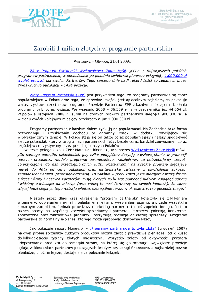 Zarobili 1 milion złotych w programie partnerskim Warszawa – Gliwice, 21.01.2009r. Złoty Program Partnerski Wydawnictwa Złote Myśli, jeden z największych polskich programów partnerskich, w poniedziałek po południu świętował pierwszy osiągnięty 1.000.000 zł wypłat prowizji dla swoich Partnerów. Tego samego dnia padł rekord ilości sprzedanych przez Wydawnictwo publikacji – 1434 pozycje. Złoty Program Partnerski (ZPP) jest przykładem tego, że programy partnerskie są coraz popularniejsze w Polsce oraz tego, że sprzedaż książek jest opłacalnym zajęciem, co pokazuje wzrost zysków uczestników programu. Prowizje Partnerów ZPP z każdym miesiącem działania programu były coraz wyższe. We wrześniu 2008 – 36.339 zł, a w październiku już 44.054 zł. W połowie listopada 2008 r. suma naliczonych prowizji partnerskich sięgnęła 900.000 zł, a w ciągu dwóch kolejnych miesięcy przekroczyła już 1.000.000 zł. Programy partnerskie z każdym dniem zyskują na popularności. Na Zachodzie taka forma networkingu i uzyskiwania dochodu to ogromny rynek, w dodatku rozwijający się w błyskawicznym tempie. W Polsce staje się on także coraz popularniejszy i należy spodziewać się, że potencjał, który w programach partnerskich leży, będzie coraz bardziej zauważany i coraz częściej wykorzystywany przez przedsiębiorczych Polaków. Na czym polega sukces ZPP? Mateusz Chłodnicki, wiceprezes Wydawnictwa Złote Myśli mówi: „Od samego początku działalności, gdy tylko podjęliśmy decyzję o wykorzystaniu w promocji naszych produktów modelu programu partnerskiego, widzieliśmy, że potrzebujemy czegoś, co przyciągnie do nas przedsiębiorczych ludzi. Postawiliśmy na wysokie prowizje sięgające nawet do 40% od ceny publikacji oraz na tematykę związaną z psychologią sukcesu, samodoskonaleniem, przedsiębiorczością. To właśnie w produktach jakie oferujemy widzę źródło sukcesu firmy i naszych Partnerów. Misją Złotych Myśli jest pomagać ludziom osiągnąć sukces i widzimy z miesiąca na miesiąc (oraz widzą to nasi Partnerzy na swoich kontach), że coraz więcej ludzi sięga po tego rodzaju wiedzę, szczególnie teraz, w okresie kryzysu gospodarczego." Niestety przez długi czas określenie "program partnerski" kojarzyło się z klikaniem w bannery, odbieraniem e-maili, oglądaniem reklam, wysyłaniem spamu, a przede wszystkim z marnym zarobkiem. Jednak prawdziwy marketing partnerski to coś zupełnie innego. Jest to biznes oparty na wspólnej korzyści sprzedawcy i partnera. Partnerzy polecają konkretne, sprawdzone oraz wartościowe produkty i otrzymują prowizję od każdej sprzedaży. Programy partnerskie to normalny e-biznes, którego może spróbować dosłownie każdy. Jak pokazuje raport Money.pl – „Programy partnerskie to żyła złota” (grudzień 2007) na owej próbie sprzedaży cudzych produktów można zarobić prawdziwe pieniądze, od kilkuset do kilkudziesięciu tysięcy złotych miesięcznie. Wszystko zależy od aktywności partnera i dopasowania produktu do tematyki strony, na której się go promuje. Największe prowizje lądują w kieszeniach partnerów polecających kredyty czy usługi finansowe, a najbardziej pewne pieniądze, choć mniejsze, dostaje się za polecanie książek. Na polskim rynku pojawia się coraz więcej prawdziwych programów partnerskich, które traktują partnera tak jak ten na to zasługuje, czyli w 100% poważnie. Dobrze prowadzony program partnerski to jeden z najlepszych i najbardziej opłacalnych sposobów promocji produktów, gdzie płaci się wyłącznie za efekty. Praca i efekty partnerów Złotego Programu Partnerskiego na pierwszy milion zostały wycenione po 5 latach działalności programu. Podobno najtrudniej zarobić właśnie ten pierwszy milion. Z tego wniosek, że o kolejnym milionie zarobionym przez partnerów Wydawnictwa Złote Myśli usłyszymy już niedługo. Monika Halasz :: [email protected] Specjalista ds. Public Relations Wydawnictwo Złote Myśli Tel. +48 665 270 720