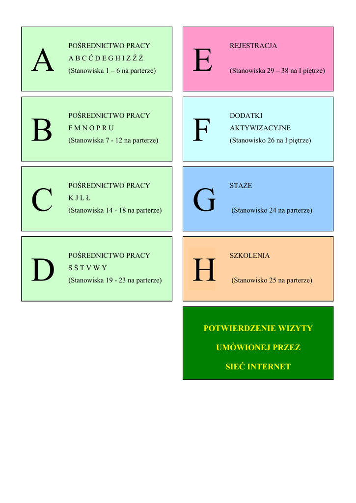 A B C D POŚREDNICTWO PRACY ABCĆDEGHIZŹŻ (Stanowiska 1 – 6 na parterze) POŚREDNICTWO PRACY FMNOPRU (Stanowiska 7 - 12 na parterze) POŚREDNICTWO PRACY KJLŁ (Stanowiska 14 - 18 na parterze) POŚREDNICTWO PRACY SŚTVWY (Stanowiska 19 - 23 na parterze) REJESTRACJA E (Stanowiska 29 – 38 na I piętrze) DODATKI F AKTYWIZACYJNE (Stanowisko 26 na I piętrze) G H STAŻE (Stanowisko 24 na parterze) SZKOLENIA (Stanowisko 25 na parterze) POTWIERDZENIE WIZYTY UMÓWIONEJ PRZEZ SIEĆ INTERNET