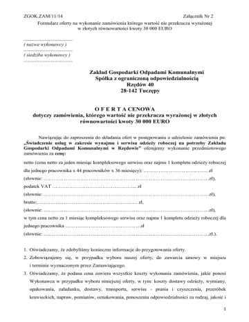Załącznik Nr 2 ZGOK.ZAM/11/14 Formularz oferty na wykonanie zamówienia którego wartość nie przekracza wyrażonej w złotych równowartości kwoty 30 000 EURO ....................................... ( nazwa wykonawcy ) ....................................... ( siedziba wykonawcy ) ....................................... Zakład Gospodarki Odpadami Komunalnymi Spółka z ograniczoną odpowiedzialnością Rzędów 40 28-142 Tuczępy O F E R T A CENOWA dotyczy zamówienia, którego wartość nie przekracza wyrażonej w złotych równowartości kwoty 30 000 EURO Nawiązując do zaproszenia do składania ofert w postępowaniu o udzielenie zamówienia pn: „Świadczenie usług w zakresie wynajmu i serwisu odzieży roboczej na potrzeby Zakładu Gospodarki Odpadami Komunalnymi w Rzędowie” oferujemy wykonanie przedmiotowego zamówienia za cenę: netto (cena netto za jeden miesiąc kompleksowego serwisu oraz najmu 1 kompletu odzieży roboczej dla jednego pracownika x 44 pracowników x 36 miesięcy): …………………………..….… zł (słownie: ………………………………………………………………………………………zł), podatek VAT …………………………………………... zł (słownie: ………………………………………………………………………………………zł), brutto:…………………………………………………… zł, (słownie: ………………………………………………………………………………………zł), w tym cena netto za 1 miesiąc kompleksowego serwisu oraz najmu 1 kompletu odzieży roboczej dla jednego pracownika ………………………………………zł (słownie: ………………………………………………………………………………………zł.). 1. Oświadczamy, że zdobyliśmy konieczne informacje do przygotowania oferty. 2. Zobowiązujemy się, w przypadku wyboru naszej oferty, do zawarcia umowy w miejscu i terminie wyznaczonym przez Zamawiającego. 3. Oświadczamy, że podana cena zawiera wszystkie koszty wykonania zamówienia, jakie ponosi Wykonawca w przypadku wyboru niniejszej oferty, w tym: koszty dostawy odzieży, wymiany, opakowania, załadunku, dostawy, transportu, serwisu - prania i czyszczenia, przeróbek krawieckich, napraw, pomiarów, oznakowania, ponoszenia odpowiedzialności za rodzaj, jakość i 1 Załącznik Nr 2 ZGOK.ZAM/11/14 ilość dostarczonej odzieży, opłatę ekologiczną, koszty wynajmu i serwisu szafek odzieżowych i szafki wrzutowej oraz innych czynności niezbędnych do wykonania przedmiotu zamówienia. 4. Załącznikami do niniejszej oferty stanowiącymi jej integralną część są: a……………………………….. b……………………………….. c……………………………….. dnia, ............................................... Podpisano ............................................................ ( upoważniony przedstawiciel ) ............................................................ ( adres ) 2