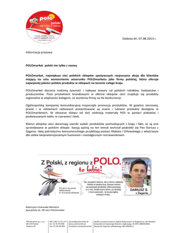Giebnia dn. 07.08.2013 r. Informacja prasowa POLOmarket polski nie tylko z nazwy POLOmarket, największa sieć polskich sklepów spożywczych rozpoczyna akcję dla klientów mającą na celu wzmocnienie wizerunku POLOmarketu jako firmy polskiej, która oferuje najwyższej jakości polskie produkty w sklepach na terenie całego kraju. POLOmarket docenia rodzimą żywnośd i nabywa towary od polskich rolników, hodowców i producentów. Poza produktami brandowymi w ofercie sklepów sieci znajduje się produkty regionalne w większości kategorii, co wyróżnia firmę na tle konkurencji. Ogólnopolską kampanię komunikacyjną rozpoczęła promocja produktów. W gazetce sieciowej, prasie i w reklamach radiowych prezentowane są znane i lubiane produkty dostępne w POLOmarketach. W obszarze sklepu od dziś widnieją materiały POS w postaci plakatów i podwieszanych tablic w czerwieni i bieli. Klienci sklepów sieci doceniają szeroki wybór produktów pochodzących z kraju i fakt, że są one sprzedawane w polskim sklepie. Swoją opinią na ten temat zechciał podzielid się Pan Dariusz z Żagania. Ideę patriotyzmu konsumenckiego przybliżają postaci Klekota i Orłowskiego z właściwym dla siebie bezpretensjonalnym humorem i nostalgicznym rozrzewnieniem. Katarzyna Ciszewska-Masianis Specjalista ds. PR sieci POLOmarket POLOmarket Sp. z o.o. 88-170 Pakośd Giebnia 20 NIP: 556-21-25-117 tel. 52 35-99-000 fax: 52 35-99-999 [email protected] www.polomarket.pl facebook.com/polomarket Spółka zarejestrowana w Sądzie Rejonowym w Bydgoszczy, XIII Wydział Gospodarczy Krajowego Rejestru Sądowego, Nr KRS: 0000204601. Wysokośd kapitału zakładowego 402 000,00 zł.