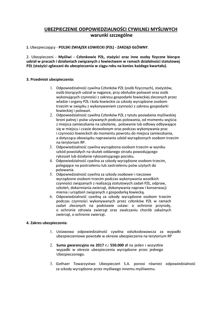UBEZPIECZENIE ODPOWIEDZIALNOŚCI CYWILNEJ MYŚLIWYCH warunki szczególne 1. Ubezpieczający - POLSKI ZWIĄZEK ŁOWIECKI (PZŁ) - ZARZĄD GŁÓWNY. 2. Ubezpieczeni - Myśliwi - Członkowie PZŁ, stażyści oraz inne osoby fizyczne biorące udział w pracach i działaniach związanych z łowiectwem w ramach działalności statutowej PZŁ (stażyści zgłaszani do ubezpieczenia w ciągu roku na koniec każdego kwartału). 3. Przedmiot ubezpieczenia: 1. Odpowiedzialność cywilna Członków PZŁ (osób fizycznych), stażystów, osób biorących udział w nagance, przy obsłudze polowań oraz osób wykonujących czynności z zakresu gospodarki łowieckiej zleconych przez władze i organy PZŁ i koła łowieckie za szkody wyrządzone osobom trzecim w związku z wykonywaniem czynności z zakresu gospodarki łowieckiej i polowań. 2. Odpowiedzialność cywilna Członków PZŁ z tytułu posiadania myśliwskiej broni palnej i psów używanych podczas polowania, od momentu wyjścia z miejsca zamieszkania na szkolenie, polowanie lub odłowy odbywające się w miejscu i czasie dozwolonym oraz podczas wykonywania prac i czynności łowieckich do momentu powrotu do miejsca zamieszkania, a dotycząca obowiązku naprawiania szkód wyrządzonych osobom trzecim na terytorium RP. 3. Odpowiedzialność cywilna wyrządzona osobom trzecim w wyniku szkód powstałych na skutek oddanego strzału powodującego rykoszet lub działanie rykoszetującego pocisku. 4. Odpowiedzialność cywilna za szkody wyrządzone osobom trzecim, polegające na postrzeleniu lub zastrzeleniu psów użytych do polowania. 5. Odpowiedzialność cywilna za szkody osobowe i rzeczowe wyrządzone osobom trzecim podczas wykonywania wszelkich czynności związanych z realizacją statutowych zadań PZŁ, odpraw, szkoleń, dokarmiania zwierząt, dokonywania napraw i konserwacji mienia i urządzeń związanych z gospodarką łowiecką. 6. Odpowiedzialność cywilną za szkody wyrządzone osobom trzecim podczas czynności wykonywanych przez członków PZŁ w ramach zadań zleconych na podstawie ustaw: o ochronie przyrody, o ochronie zdrowia zwierząt oraz zwalczaniu chorób zakaźnych zwierząt, o ochronie zwierząt. 4. Zakres ubezpieczenia: 1. Ustawowa odpowiedzialność cywilna odszkodowawcza za wypadki ubezpieczeniowe powstałe w okresie ubezpieczenia na terytorium RP 2. Suma gwarancyjna na 2017 r.: 550.000 zł na jeden i wszystkie wypadki w okresie ubezpieczenia wyrządzone przez jednego Ubezpieczonego. 3. Gothaer Towarzystwo Ubezpieczeń S.A. ponosi również odpowiedzialność za szkody wyrządzone przez myśliwego innemu myśliwemu. 5. Wyłączenia: Zakres ubezpieczenia nie obejmuje odpowiedzialności cywilnej za szkody: 1/ W uprawach i płodach rolnych, wyrządzone podczas wykonywania polowania przez członków PZŁ oraz osoby biorące udział w nagance lub przy obsłudze polowania, 2/ Wyrządzone przez zwierzynę, w uprawach i płodach rolnych, 3/ Jeżeli sprawca szkody wyrządził szkodę za pomocą broni, na którą nie posiadał pozwolenia; wyłączenie to nie dotyczy przypadku, gdy sprawca szkody korzystał z broni mu użyczonej i posiadał zezwolenie na broń tego samego rodzaju, 4/ Powstałe w wyniku winy umyślnej ubezpieczonego, 5/ Powstałe w wyniku rażącego niedbalstwa - w odniesieniu do szkód wyrządzonych przez Ubezpieczone inne osoby fizyczne, nie będące członkami PZŁ, 6/ Spowodowane użytkowaniem lub prowadzeniem pojazdów mechanicznych podlegających obowiązkowemu ubezpieczeniu odpowiedzialności cywilnej, 7/ Powstałe w związku z wykonywaniem czynności życia prywatnego, tj. nie zlecone przez PZŁ ani nie mające związku ze statutową działalnością PZŁ, 8/ Polegające na wystąpieniu czystych szkód majątkowych, 9/ Za które osoba objęta ubezpieczeniem jest odpowiedzialna wskutek umownego przejęcie odpowiedzialności cywilnej osoby trzeciej, albo wskutek rozszerzenia zakresu własne odpowiedzialności cywilnej wynikającej z ustawy, 10/ Wyrządzone w wartościach pieniężnych, dokumentach, dziełach sztuki itp., 11/ Związane z działaniami wojennymi, wojną domową, stanem wojennym i wyjątkowym, zamieszkami i niepokojami społecznymi, rozruchami, strajkami, lokautami oraz aktami sabotażu i terroryzmu, 6. Umowa ubezpieczenia nie pokrywa grzywien i kar administracyjnych lub sądowych oraz innych kar o charakterze pieniężnym, w tym również odszkodowań o charakterze karnym, nałożonych na osoby objęte ubezpieczeniem.