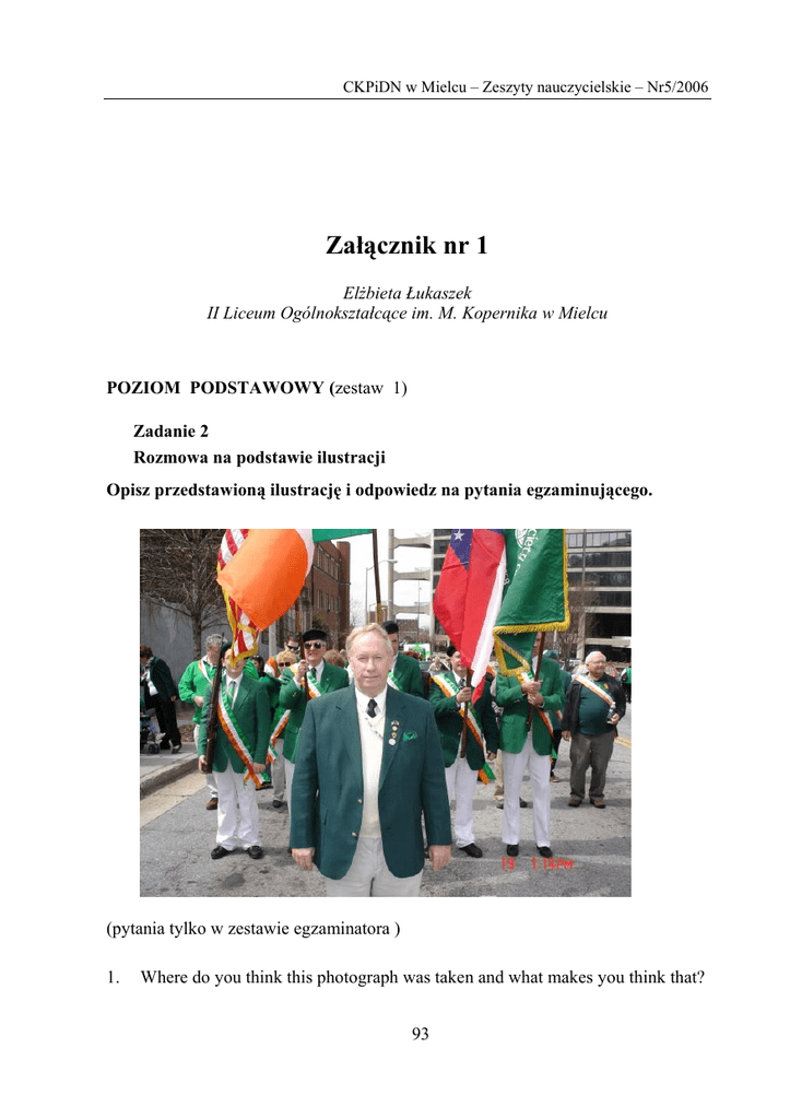 CKPiDN w Mielcu – Zeszyty nauczycielskie – Nr5/2006 Załącznik nr 1 Elżbieta Łukaszek II Liceum Ogólnokształcące im. M. Kopernika w Mielcu POZIOM PODSTAWOWY (zestaw 1) Zadanie 2 Rozmowa na podstawie ilustracji Opisz przedstawioną ilustrację i odpowiedz na pytania egzaminującego. (pytania tylko w zestawie egzaminatora ) 1. Where do you think this photograph was taken and what makes you think that? 93 Elżbieta Łukaszek – „Scenariusz lekcji...” 2. Why is St.Patrick`s Day so popular not only in Ireland, but also in many other countries, including Poland? POZIOM PODSTAWOWY (zestaw 2) Zadanie 2 Rozmowa na podstawie ilustracji Opisz przedstawioną ilustrację i odpowiedz na pytania egzaminującego. (pytania tylko w zestawie egzaminatora) 1. 2. Why do you think the children in the photograph look so happy? What is Halloween and how is it celebrated? 94