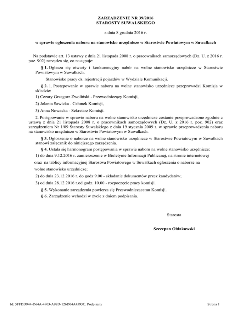 ZARZĄDZENIE NR 39/2016 STAROSTY SUWALSKIEGO z dnia 8 grudnia 2016 r. w sprawie ogłoszenia naboru na stanowisko urzędnicze w Starostwie Powiatowym w Suwałkach Na podstawie art. 13 ustawy z dnia 21 listopada 2008 r. o pracownikach samorządowych (Dz. U. z 2016 r. poz. 902) zarządza się, co następuje: § 1. Ogłasza się otwarty i konkurencyjny nabór na wolne stanowisko urzędnicze w Starostwie Powiatowym w Suwałkach: Stanowisko pracy ds. rejestracji pojazdów w Wydziale Komunikacji. § 2. 1. Postępowanie w sprawie naboru na wolne stanowisko urzędnicze przeprowadzi Komisja w składzie: 1) Cezary Grzegorz Zwoliński - Przewodniczący Komisji, 2) Jolanta Sawicka - Członek Komisji, 3) Anna Nowacka - Sekretarz Komisji. 2. Postępowanie w sprawie naboru na wolne stanowisko urzędnicze zostanie przeprowadzone zgodnie z ustawą z dnia 21 listopada 2008 r. o pracownikach samorządowych (Dz. U. z 2016 r. poz. 902) oraz zarządzeniem Nr 1/09 Starosty Suwalskiego z dnia 19 stycznia 2009 r. w sprawie przeprowadzenia naboru na stanowisko urzędnicze w Starostwie Powiatowym w Suwałkach. § 3. Ogłoszenie o naborze na wolne stanowisko urzędnicze w Starostwie Powiatowym w Suwałkach stanowi załącznik do niniejszego zarządzenia. § 4. Ustala się harmonogram postępowania w sprawie naboru na wolne stanowisko urzędnicze: 1) do dnia 9.12.2016 r. zamieszczenie w Biuletynie Informacji Publicznej, na stronie internetowej oraz na tablicy informacyjnej Starostwa Powiatowego w Suwałkach ogłoszenia o naborze na wolne stanowisko urzędnicze; 2) do dnia 23.12.2016 r. do godz 9.00 - składanie dokumentów przez kandydatów; 3) od dnia 28.12.2016 r.od godz. 10.00 - rozpoczęcie pracy komisji. § 5. Wykonanie zarządzenia powierza się Przewodniczącemu Komisji. § 6. Zarządzenie wchodzi w życie z dniem podpisania. Starosta Szczepan Ołdakowski Id: 5FFDD944-D64A-4903-A98D-126D04A4593C. Podpisany Strona 1
