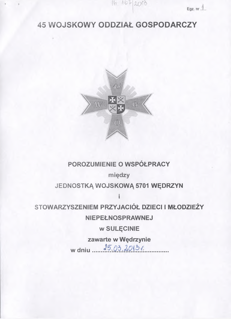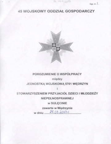 45 WOJSKOWY ODDZIAŁ GOSPODARCZY POROZUMIENIE O WSPÓŁPRACY między JEDNOSTKĄ WOJSKOWĄ 5701 WĘDRZYN i STOWARZYSZENIEM PRZYJACIÓŁ DZIECI I MŁODZIEŻY NIEPEŁNOSPRAWNEJ w SULĘCINIE zawarte w Wędrzynie w dniu..... ...................................... Mając na względzie współpracę na rzecz obronności państwa i wychowania patriotycznego młodzieży, integracji środowiska żołnierskiego i młodzieży, budowania poczucia tożsamości narodowej, kształtowania pozytywnego stosunku do wypełniania przez społeczeństwo zadań obronnych oraz wychowania młodzieży w duchu patriotycznym, ze szczególnym uwzględnieniem umacniania etosu oraz kultywowania chlubnych tradycji Wojska Polskiego, działając na podstawie decyzji nr 187/MON Ministra Obrony Narodowej z dnia 9 czerwca 2009 r. w sprawie określenia zasad i trybu współpracy resortu obrony narodowej z organizacjami pozarządowymi i innymi partnerami społecznymi ( Dz.Urz. MON nr 12, poz. 131 ) oraz decyzji nr 146/MON Ministra Obrony Narodowej z dnia 11 kwietnia 2011 r. zmieniającej decyzje w sprawie wprowadzenia zasad współpracy Resortu Obrony narodowej z organizacjami pozarządowymi i innymi partnerami społecznymi Jednostka W ojskowa 5701 w Wędrzynie, reprezentowana przez Dowódcę Jednostki ppłk Sławomira LEWICKIEGO oraz Stowarzyszenie Przyjaciół Dzieci i Młodzieży Niepełnosprawnej w Sulęcinie wpisane do Krajowego Rejestru Sądowego pod numerem 0000258348, zwane w dalszej części porozumienia „Stowarzyszeniem”, reprezentowane przez Prezesa Stowarzyszenia Panią Danutę MALINOW SKĄ oraz W iceprezesa Stowarzyszenia pana Arkadiusza KAŁUŻNEGO zawierają porozumienie następującej treści: § 1- Jednostka W ojskowa nr 5701 oraz „Stowarzyszenie” będą współpracować ze sobą w następujących celach: 1) upowszechniania patriotycznych tradycji i historii oręża polskiego; 2) upowszechniania wśród młodzieży wiedzy na temat Sił Zbrojnych oraz obronności Rzeczypospolitej Polskiej; 3) upowszechniania edukacji obronnej oraz sportu i rekreacji wśród dzieci i młodzieży; 4) wspierania integracji osób niepełnosprawnych ze społeczeństwem; 5) merytorycznego i logistycznego wspierania dzieci i młodzieży niepełnosprawnej objętej działalnością „Stowarzyszenia”; 6) popularyzowania oraz promocji dokonań i osiągnięć Jednostki Wojskowej 5701; 7) propagowania patriotycznej i obronnej edukacji młodzieży oraz kształtowania pozytywnego stosunku do wypełniania przez społeczeństwo zadań obronnych; 8) pozyskiwania społecznej akceptacji dla polityki obronnej państwa. §2. „Stowarzyszenie” zobowiązuje się do podejmowania działań zmierzających do realizacji niniejszego porozumienia, w szczególności do: 2 1) promowania Sił Zbrojnych RP w trakcie imprez, zawodów sportowych oraz innych sprzyjających temu okolicznościach (zjazdy, obozy sportowe, publikacje w mediach itp.); 2) popularyzacji idei obronności państwa w gronie członków „Stowarzyszenia” oraz w szkołach i instytucjach współpracujących; 3) kultywowania i upowszechniania tradycji i historii oręża polskiego; 4) upowszechniania wiedzy na temat Sił Zbrojnych oraz obronności Rzeczypospolitej Polskiej; 5) organizowania i realizowania imprez sportowo - rekreacyjnych oraz wypoczynku dzieci i młodzieży niepełnosprawnej; 6) popularyzacji i eksponowania współczesnego oblicza Jednostki Wojskowej 5701 w środowisku młodzieży niepełnosprawnej; 7) zapraszania przedstawicieli Jednostki W ojskowej 5701 do udziału w ważnych wydarzeniach i przedsięwzięciach „Stowarzyszenia”; 8) przeprowadzania dla dzieci i młodzieży konkursów o tematyce wojskowej. §3. 1. Jednostka W ojskowa 5701 udzieli „Stowarzyszeniu”, w miarę posiadanych możliwości, pomocy w realizacji celów statutowych, w szczególności poprzez: 1) wsparcie merytoryczne i logistyczne przedsięwzięć „Stowarzyszenia” na podstawie rocznego planu współpracy zgodnie z rozdziałem 5 „Zasad współpracy resortu obrony narodowej z organizacjami pozarządowymi i innymi partnerami społecznymi” ( załącznik do decyzji nr 186/MON z dnia 9 czerwca 2009 r. ); 2) promowanie działalności „Stowarzyszenia” w środowisku wojskowym; 3) wspieranie inicjatyw „Stowarzyszenia” mających na celu integrację osób niepełnosprawnych ze społeczeństwem; 4) udział przedstawicieli Jednostki Wojskowej 5701 w ważnych uroczystościach „Stowarzyszenia”; 5) organizację wspólnych przedsięwzięć kulturalno - oświatowych i sportowo rekreacyjnych. 2. Żołnierze zawodowi mogą uczestniczyć w przedsięwzięciach „Stowarzyszenia”, uzgodnionych z Dowódcą Jednostki Wojskowej 5701 i za jego zgodą, na zasadach określonych w przepisach o służbie wojskowej żołnierzy zawodowych. §4. Wzajemne przedsięwzięcia „Stowarzyszenie” i Jednostka W ojskowa 5701 będą wykonywać z należytą starannością, wiedzą fachową i z zachowaniem wszelkich środków bezpieczeństwa. §5. 1. Strony ustalają, że do dnia 10 września każdego roku będą uzgadniać plan współpracy na następny rok kalendarzowy. 2. Propozycje do planu, o którym mowa w ust. 1 muszą być wstępnie uzgodnione przez „Stowarzyszenie” z upoważnioną przez Dowódcę Jednostki Wojskowej 5701 komórką organizacyjną w terminie do dnia 25 sierpnia każdego roku. 3 § 6. „Stowarzyszenie” zobowiązuje się do przekazywania do dnia 31 stycznia każdego roku do Jednostki W ojskowej 5701 informacji o realizacji porozumienia w roku poprzednim w celu przeprowadzenia oceny przebiegu i wyników współpracy z resortem obrony narodowej. §7. Strony zobowiązują się do wzajemnego informowania się o zdarzeniach i okolicznościach istotnych ze względu na przedmiot i zakres porozumienia. §8. Porozumienie nie powoduje wydatków z budżetu Jednostki Wojskowej 5701 i resortu Obrony Narodowej. §9Dowódca Jednostki Wojskowej 5701 nie ponosi odpowiedzialności cywilnej i innej