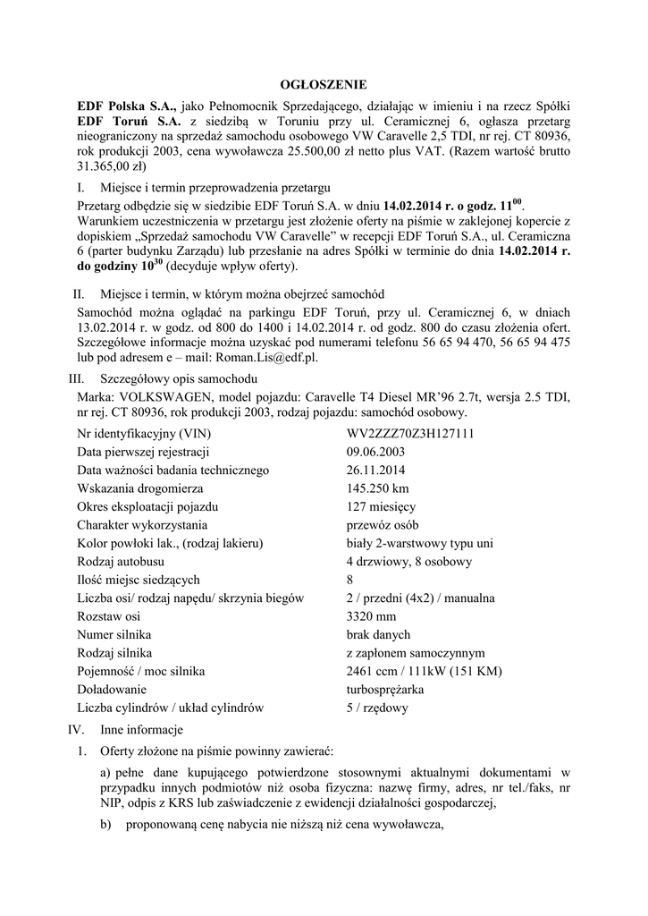 OGŁOSZENIE EDF Polska S.A., jako Pełnomocnik Sprzedającego, działając w imieniu i na rzecz Spółki EDF Toruń S.A. z siedzibą w Toruniu przy ul. Ceramicznej 6, ogłasza przetarg nieograniczony na sprzedaż samochodu osobowego VW Caravelle 2,5 TDI, nr rej. CT 80936, rok produkcji 2003, cena wywoławcza 25.500,00 zł netto plus VAT. (Razem wartość brutto 31.365,00 zł) I. Miejsce i termin przeprowadzenia przetargu Przetarg odbędzie się w siedzibie EDF Toruń S.A. w dniu 14.02.2014 r. o godz. 1100. Warunkiem uczestniczenia w przetargu jest złożenie oferty na piśmie w zaklejonej kopercie z dopiskiem „Sprzedaż samochodu VW Caravelle” w recepcji EDF Toruń S.A., ul. Ceramiczna 6 (parter budynku Zarządu) lub przesłanie na adres Spółki w terminie do dnia 14.02.2014 r. do godziny 1030 (decyduje wpływ oferty). II. Miejsce i termin, w którym można obejrzeć samochód Samochód można oglądać na parkingu EDF Toruń, przy ul. Ceramicznej 6, w dniach 13.02.2014 r. w godz. od 800 do 1400 i 14.02.2014 r. od godz. 800 do czasu złożenia ofert. Szczegółowe informacje można uzyskać pod numerami telefonu 56 65 94 470, 56 65 94 475 lub pod adresem e – mail: [email protected]. III. Szczegółowy opis samochodu Marka: VOLKSWAGEN, model pojazdu: Caravelle T4 Diesel MR’96 2.7t, wersja 2.5 TDI, nr rej. CT 80936, rok produkcji 2003, rodzaj pojazdu: samochód osobowy. Nr identyfikacyjny (VIN) Data pierwszej rejestracji Data ważności badania technicznego Wskazania drogomierza Okres eksploatacji pojazdu Charakter wykorzystania Kolor powłoki lak., (rodzaj lakieru) Rodzaj autobusu Ilość miejsc siedzących Liczba osi/ rodzaj napędu/ skrzynia biegów Rozstaw osi Numer silnika Rodzaj silnika Pojemność / moc silnika Doładowanie Liczba cylindrów / układ cylindrów IV. 1. WV2ZZZ70Z3H127111 09.06.2003 26.11.2014 145.250 km 127 miesięcy przewóz osób biały 2-warstwowy typu uni 4 drzwiowy, 8 osobowy 8 2 / przedni (4x2) / manualna 3320 mm brak danych z zapłonem samoczynnym 2461 ccm / 111kW (151 KM) turbosprężarka 5 / rzędowy Inne informacje Oferty złożone na piśmie powinny zawierać: a) pełne dane kupującego potwierdzone stosownymi aktualnymi dokumentami w przypadku innych podmiotów niż osoba fizyczna: nazwę firmy, adres, nr tel./faks, nr NIP, odpis z KRS lub zaświadczenie z ewidencji działalności gospodarczej, b) proponowaną cenę nabycia nie niższą niż cena wywoławcza, 2. Komisyjne otwarcie ofert nastąpi w dniu 14.02.2014 r. o godzinie 1100 w siedzibie EDF Toruń S.A., z udziałem oferentów. 3. Za najkorzystniejszą zostanie uznana oferta z najwyższą ceną. 4. Przystąpienie do przetargu jest równoznaczne ze złożeniem oświadczenia o zapoznaniu się ze stanem technicznym pojazdów. 5. Na nabywcy spoczywają koszty związane z przeniesieniem własności pojazdu. 6. Przeniesienie własności nastąpi na podstawie faktury lub umowy sprzedaży zawartej w formie pisemnej z wybranym oferentem. 7. Wydanie kupionego pojazdu nastąpi po zapłaceniu całej ceny, na podstawie faktury wystawionej przez EDF Toruń S.A., przelewem na rachunek bankowy wskazany na fakturze. 8. EDF Polska S.A. zastrzega sobie prawo: a) wezwania oferentów do złożenia ofert dodatkowych w określonym przez EDF Polska terminie, jeżeli taką samą najwyższą oferowaną cenę będzie zawierała więcej niż jedna oferta, b) prowadzenia dodatkowych rokowań z oferentami, c) uznania, że przetarg nie dał rezultatu, bez podania przyczyny, d) unieważnienia przetargu bez podania przyczyny.