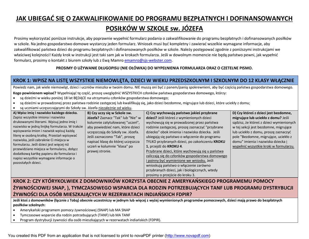 JAK UBIEGAĆ SIĘ O ZAKWALIFIKOWANIE DO PROGRAMU BEZPŁATNYCH I DOFINANSOWANYCH POSIŁKÓW W SZKOLE sw. JÓZEFA Prosimy wykorzystać poniższe instrukcje, aby poprawnie wypełnić formularz podania o zakwalifikowanie do programu bezpłatnych i dofinansowanych posiłków w szkole. Na jedno gospodarstwo domowe wystarczy jeden formularz. Wniosek musi być kompletny i zawierać wszelkie wymagane informacje, aby zakwalifikować państwa dzieci do programu bezpłatnych i dofinansowanych posiłków w szkole. Należy postępować zgodnie z poniższymi instrukcjami we właściwej kolejności! Każdy krok w instrukcji jest taki sam jak w krokach formularza. Jeśli w dowolnym momencie nie będą państwo pewni, jak wypełnić formularz, prosimy o kontakt z biurem szkoły lub z Ewą Mamro [email protected]. PROSIMY O UŻYWANIE DŁUGOPISU (NIE OŁÓWKA) DO WYPEŁNIENIA FORMULARZA ORAZ O CZETELNE PISMO. KROK 1: WPISZ NA LISTĘ WSZYSTKIE NIEMOWLĘTA, DZIECI W WIEKU PRZEDSZKOLNYM I SZKOLNYM DO 12 KLASY WŁĄCZNIE Powiedz nam, jak wiele niemowląt, dzieci i uczniów mieszka w twoim domu. NIE muszą oni być z panem/panią spokrewnieni, aby być częścią państwa gospodarstwa domowego. Kogo powinienem wpisać? Wypełniająć tę część, proszę uwzględnić WSZYSTKICH członków państwa gospodarstwa domowego, którzy: są dziećmi w wieku poniżej 18 lat BĘDĄCE na utrzymaniu członków gospodarstwa domowego; są dziećmi w prowadzonej przez państwa rodzinie zastępczej lub kwalifikują się, jako dzieci bezdomne, migrujące lub dzieci, które uciekły z domu; są uczniami uczęszczającymi do Szkoły sw. Józefa niezależnie od wieku. A) Wpisz imię i nazwisko każdego dziecka. B) Czy uczy się w Szkole sw. C) Czy wychowują państwo jakieś przybrane D) Czy któreś z dzieci jest bezdomne, Zapisz wszystkie imiona i nazwiska Józefa? Zaznacz "Tak" lub "Nie" w dzieci? Jeśli któreś z wymienionych dzieci migrujące lub uciekło z domu? Jeśli drukowanymi literami. Wpisuj jedno imię i kolumnie zatytułowanej "uczeń", wychowują się w prowadzonej przez państwa sądzisz, że któreś z dzieci wymienionych nazwisko w jedną linijkę formularza. W trakcie aby powiedzieć nam, które dzieci rodzinie zastępczej, proszę zaznaczyć "przybrane w tej sekcji jest bezdomne, migrujące wpisywania imion i nazwisk wpisuj każdą uczęszczają do Szkoły sw. Józefa. dziecko" obok imienia i nazwiska dziecka. Jeśli lub uciekło z domu, proszę zaznaczyć literę w osobną kratkę. Przestań wpisywać Jeśli zaznaczono "Tak", proszę ubiegają się państwo o włączenie do programu pole "Bezdomne, migrujące, uciekło z nazwiska, jeśli zabraknie Ci miejsca w napisać klasę do której uczęszcza TYLKO przybranych dzieci, po zakończeniu KROKU domu" imienia i nazwiska dziecka i formularzu. Jeśli dzieci jest więcej niż uczeń w kolumnie "klasa" po 1, przejdź do KROKU 4. wypełnić wszystkie kroki w formularzu. przewidziano miejsca w formularzu, dołącz prawej stronie. Przybrane dzieci, które wychowują się u państwa dodatkową kartkę papieru do formularza i zaliczają się do członków gospodarstwa domowego napisz wszystkie wymagane informacje o i poinny być wymienione we wniosku. Jeśli pozostałych dzieci. wnioskują państwo o włączenie zarówno przybranych dzieci, jak i biologicznych, wtedy prosimy o przejście do kroku 3. KROK 2: CZY KTÓRYKOLWIEK Z DOMOWNIKÓW KORZYSTA OBECNIE Z AMERYKAŃSKIEGO PROGRAMEMU POMOCY ŻYWNOŚCIOWEJ SNAP, ), TYMCZASOWEGO WSPARCIA DLA RODZIN POTRZEBUJĄCYCH TANF LUB PROGRAMU DYSTRYBUCJI ŻYWNOŚCI DLA OSÓB MIESZKAJĄCYCH W REZERWATACH INDJAŃSKICH FDPIR? Jeśli ktoś z domowników (łącznie z Tobą) obecnie uczestniczy w jednym lub więcej z wyżej wymienionych programów pomocowych, dzieci mają prawo do bezpłatnych posiłków szkolnych: Amerykański programem pomocy żywnościowej (SNAP) lub MA SNAP Tymczasowe wsparcie dla rodzin potrzebujących (TANF) lub MA TANF Program dystrybucji żywności dla osób mieszkających w rezerwatach indiańskich (FDPIR). You created this PDF from an application that is not licensed to print to novaPDF printer (http://www.novapdf.com) KROK 2: CZY KTÓRYKOLWIEK Z DOMOWNIKÓW KORZYSTA OBECNIE Z AMERYKAŃSKIEGO PROGRAMEMU POMOCY ŻYWNOŚCIOWEJ SNAP, ), TYMCZASOWEGO WSPARCIA DLA RODZIN POTRZEBUJĄCYCH TANF LUB PROGRAMU DYSTRYBUCJI ŻYWNOŚCI DLA OSÓB MIESZKAJĄCYCH W REZERWATACH INDJAŃSKICH FDPIR? A) Jeżeli nikt z domowników nie uczestniczy w żadnej z wyżej wymienionych programów: Pozostaw KROK 2 pusty i przejdź do KROKU 3. B) J eśli ktokolwiek w twoim domu uczestniczy w jednym z wyżej wymienionych programów: Wpisz numer sprawy dla SNAP, TANF lub FDPIR. Wystarczy dostarczyć jeden numer sprawy. Jeśli korzystają państwo z jednego z wymienionych programów, ale nie pamiętają swojego numeru sprawy, prosimy o kontakt z: Department of Transitional Assistance at 1-877-382-2363 Przejdź do KROKU 4. KROK 3: NALEŻY WPISAĆ DOCHÓD WSZYSTKICH CZŁONKÓW GOSPODARSTWA DOMOWEGO Jak mogę zadeklarować swoje dochody? Należy skorzystać z tabel z drugiej strony formularza zatytułowanych "źródła dochodu dorosłych" oraz "źródła dochodu dzieci", aby stwierdzić czy instnieje jakiś dochód, który należy podać we wniosku. Wpisz wszystkie kwoty DOCHODU BRUTTO. Wpisz wszelkie dochody w pełnych dolarach. Nie wpisuj centów. o Dochód brutto, to est całkowity dochód uzyskany przed opodatkowaniem. o Wiele osób uważa za dochód tylko sumę, którą "przynosi do domu", a nie całą kwotę "brutto". Proszę się upewnić, że państwa dochód NIE został pomniejszony o należności w formie podatków, składek ubezpieczeniowych, lub jakichkolwiek innych kwot pobranych z wynagrodzenia. Napisz "0" we wszelkich pozycjach, gdzie nie ma dochodu do zadeklarowania. Wszelkie pozycje pozostawione puste będą również liczone jako zero. Jeśli piszesz '0' lub pozostawiać puste pola, jesteś poświadczający (obiecujących), że ni