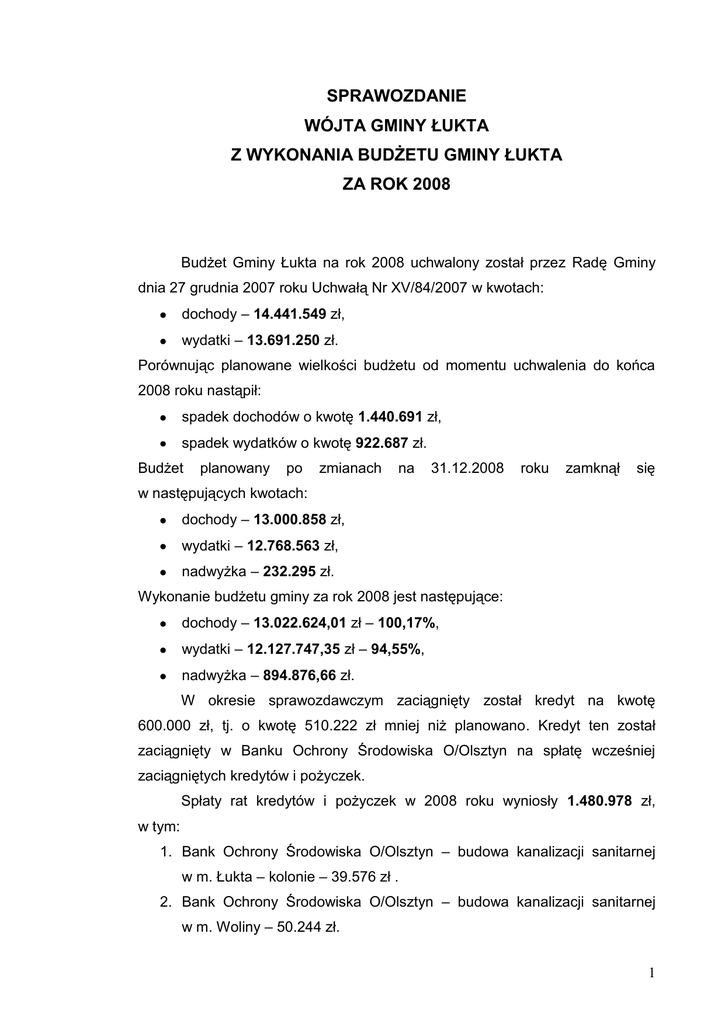 SPRAWOZDANIE WÓJTA GMINY ŁUKTA Z WYKONANIA BUDŻETU GMINY ŁUKTA ZA ROK 2008 Budżet Gminy Łukta na rok 2008 uchwalony został przez Radę Gminy dnia 27 grudnia 2007 roku Uchwałą Nr XV/84/2007 w kwotach: dochody – 14.441.549 zł, wydatki – 13.691.250 zł. Porównując planowane wielkości budżetu od momentu uchwalenia do końca 2008 roku nastąpił: spadek dochodów o kwotę 1.440.691 zł, spadek wydatków o kwotę 922.687 zł. Budżet planowany po zmianach na 31.12.2008 roku zamknął się w następujących kwotach: dochody – 13.000.858 zł, wydatki – 12.768.563 zł, nadwyżka – 232.295 zł. Wykonanie budżetu gminy za rok 2008 jest następujące: dochody – 13.022.624,01 zł – 100,17%, wydatki – 12.127.747,35 zł – 94,55%, nadwyżka – 894.876,66 zł. W okresie sprawozdawczym zaciągnięty został kredyt na kwotę 600.000 zł, tj. o kwotę 510.222 zł mniej niż planowano. Kredyt ten został zaciągnięty w Banku Ochrony Środowiska O/Olsztyn na spłatę wcześniej zaciągniętych kredytów i pożyczek. Spłaty rat kredytów i pożyczek w 2008 roku wyniosły 1.480.978 zł, w tym: 1. Bank Ochrony Środowiska O/Olsztyn – budowa kanalizacji sanitarnej w m. Łukta – kolonie – 39.576 zł . 2. Bank Ochrony Środowiska O/Olsztyn – budowa kanalizacji sanitarnej w m. Woliny – 50.244 zł. 1 3. Wojewódzki Fundusz Ochrony Środowiska i Gospodarki Wodnej w Olsztynie – instalacja urządzeń do odwadniania osadów ściekowych – 67.400 zł. 4. Wojewódzki Fundusz Ochrony Środowiska i Gospodarki Wodnej w Olsztynie – korsaż samochodu pożarniczego z OSP Ględy – 11.250 zł. 5. Wojewódzki Fundusz Ochrony Środowiska i Gospodarki Wodnej w Olsztynie – modernizacja oczyszczalni ścieków w m. Łukta – 127.055 zł. 6. Wojewódzki Fundusz Ochrony Środowiska i Gospodarki Wodnej w Olsztynie – budowa kanalizacji sanitarnej w m. Mostkowo – 86.453 zł. 7. Wojewódzki Fundusz Ochrony Środowiska i Gospodarki Wodnej w Olsztynie – dokumentacja techniczna na budowę kanalizacji sanitarnej w północnej części gminy – 18.106 zł. 8. Warmiński Bank Spółdzielczy O/Łukta – budowa wodociągu w m. Woliny i w m. Łukta – kolonie (I etap) – 64.000 zł. 9. Warmiński Bank Spółdzielczy O/Łukta – sfinansowanie planowanego deficytu budżetu gminy – 80.000 zł. 10. Warmiński Bank Spółdzielczy O/Łukta – budowa sieci wodno – kanalizacyjnej w m. Tabórz – 406.295 zł. 11. Warmiński Bank Spółdzielczy O/Łukta – zagospodarowanie brzegów jeziora Sąg w m. Pelnik – 296.592 zł. 12. Bank DnB NORD Warszawa – adaptacja pomieszczeń szkoły w Łukcie na potrzeby służby zdrowia i aptekę – 60.000 zł. 13. Bank DnB NORD Warszawa – budowa wodociągu w m. Woliny (II etap) – 20.000 zł. 14. Bank DnB NORD Warszawa – budowa wodociągu w m. Łukta – kolonie (II etap) – 20.000 zł. 15. Bank Gospodarki Żywnościowej O/Olsztyn – budowa Sali sportowej w m. Mostkowo – 110.000 zł. 16. Gospodarczy Bank Wielkopolski O/Bydgoszcz – spłata wcześniej zaciągniętych kredytów i pożyczek – 9.638 zł. 17. Gospodarczy Bank Wielkopolski O/Bydgoszcz – sfinansowanie planowanego deficytu budżetu gminy – 14.369 zł. 2 Spłaty rat kredytów i pożyczek wraz z odsetkami wyniosły 1.773.417,66 zł co stanowi wskaźnik 13,62% dochodów gminy za rok 2008. Zadłużenie gminy z tytułu kredytów i pożyczek na dzień 31.12.2008 r. wynosi 4.349.108,48 zł i w stosunku do dochodów budżetu gminy za rok 2008 wynosi 33,40%. Zadłużenie gminy na koniec 2008 roku zmalało w stosunku do 2007 roku o 880.978 zł. Na dług gminy składają się następujące kredyty i pożyczki: 1. Kredyt z Banku Ochrony Środowiska O/Olsztyn – budowa kanalizacji sanitarnej w m. Łukta – kolonie – 42.888 zł. 2. Kredyt z Banku Ochrony Środowiska O/Olsztyn – budowa kanalizacji sanitarnej w m. Woliny – 53.595 zł. 3. Kredyt z Banku Ochrony Środowiska O/Olsztyn – spłata wcześniej zaciągniętych kredytów i pożyczek – 600.000 zł. 4. Pożyczka z Wojewódzkiego Funduszu Ochrony Środowiska i Gospodarki Wodnej w Olsztynie – instalacja urządzeń do odwadniania osadów ściekowych – 134.600 zł. 5. Pożyczka z Wojewódzkiego Funduszu Ochrony Środowiska i Gospodarki Wodnej w Olsztynie – karosaż samochodu pożarniczego z OSP Ględy – 22.500 zł. 6. Pożyczka z Wojewódzkiego Funduszu Ochrony Środowiska i Gospodarki Wodnej w Olsztynie – dokumentacja techniczna na budowę kanalizacji sanitarnej w północnej części gminy – 34.325,36 zł. 7. Kredyt z Warmińskiego Banku Spółdzielczego O/Łukta – budowa wodociągu w m. Woliny i w m. Łukta – kolonie (I etap) – 320.000 zł. 8. Kredyt z Warmińskiego Banku Spółdzielczego O/Łukta – sfinansowanie planowanego deficytu budżetu gminy łączna kwota – 860.000 zł. 9. Kredyt z Banku DnB NORD Warszawa – adaptacja pomieszczeń szkoły w Łukcie na potrzeby służby zdrowia i aptekę – 221.200,12 zł. 10. Kredyt z Banku DnB NORD Warszawa – budowa wodociągu w m. Woliny (II etap) – 197.000 zł. 11. Kredyt z Banku DnB NORD Warszawa – budowa wodociągu w m. Łukta – kolonie (II etap) – 163.000 zł. 3 12. Kredyt z Gospodarczego Banku Wielkopolskiego O/Bydgoszcz – sfinansowanie planowanego deficytu budżetu gminy – 1.150.000 zł. 13. Kredyt z Gospodarczego Banku Wielkopolskiego O/Bydgoszcz – spłata wcześniej zaciągniętych kredytów i pożyczek – 550.000 zł. W roku 2008 udzielone zostały dwie pożyczki w łącznej kwocie 95.000 zł, z tego: dla Zakładu Gospodarki Komunalnej w Łukcie na remont pieca w kwocie 61.000 zł i na fundusz wynagrodzeń zakładu w kwocie 14.000 zł. Pożyczka zgodnie z umową podlega do zwrotu w terminie do 31 grudnia 2009 r.; dla Związku Stowarzyszeń „Kraina Drwęcy i Pasłęki” w Łukcie w kwocie 20.000 zł na pokrycie wydatków projektu pod nazwą „Kraina Drwęcy i Pasłęki kolebką liderów lokalnych” w ramach Sektorowego Programu Op