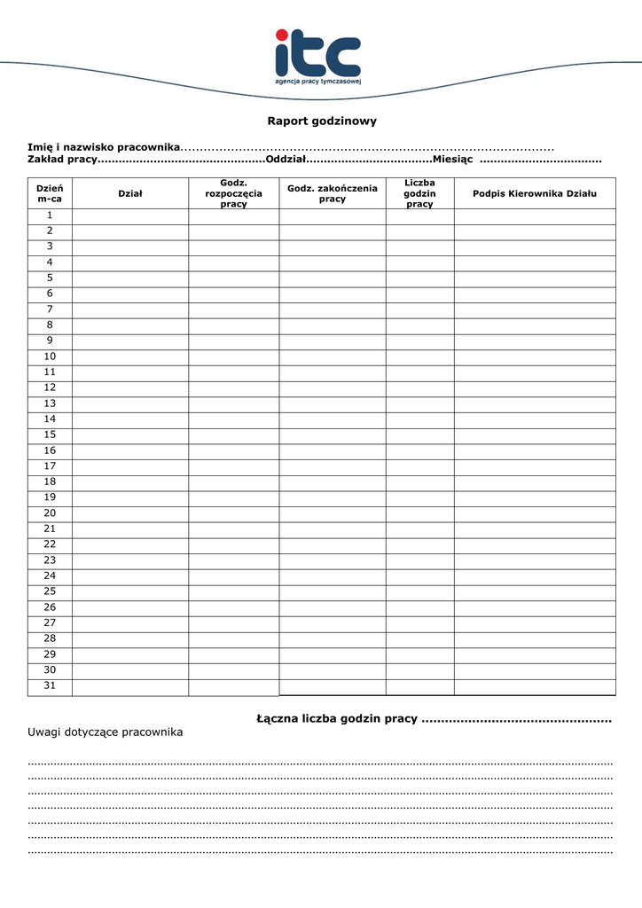 Raport godzinowy Imię i nazwisko pracownika................................................................................................ Zakład pracy................................................Oddział....................................Miesiąc ................................... Dzień m-ca Dział 1 Godz. rozpoczęcia pracy Godz. zakończenia pracy Liczba godzin pracy Podpis Kierownika Działu 2 3 4 5 6 7 8 9 10 11 12 13 14 15 16 17 18 19 20 21 22 23 24 25 26 27 28 29 30 31 Łączna liczba godzin pracy ................................................. Uwagi dotyczące pracownika ..................................................................................................................................................................................... ..................................................................................................................................................................................... ..................................................................................................................................................................................... ..................................................................................................................................................................................... ..................................................................................................................................................................................... ..................................................................................................................................................................................... .....................................................................................................................................................................................