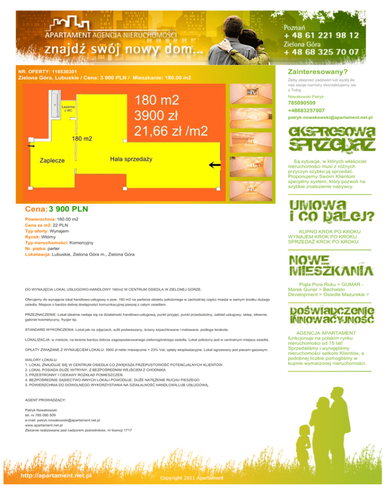 NR. OFERTY: 118530301 Zielona Góra, Lubuskie / Cena: 3 900 PLN / Mieszkanie: 180.00 m2 Zainteresowany? Żeby obejrzeć zadzwoń lub wyślij do nas swoje namiary skontaktujemy sie z Tobą. Nowakowski Patryk 785090509 +48683257007 [email protected] Są sytuacje, w których właściciel nieruchomości musi z różnych przyczyn szybko ją sprzedać. Proponujemy Swoim Klientom specjalny system, który pozwoli na szybkie znalezienie nabywcy. Cena: 3 900 PLN Powierzchnia: 180.00 m2 Cena za m2: 22 PLN Typ oferty: Wynajem Rynek: Wtórny Typ nieruchomości: Komercyjny Nr. piętra: parter Lokalizacja: Lubuskie, Zielona Góra m., Zielona Góra KUPNO KROK PO KROKU WYNAJEM KROK PO KROKU SPRZEDAŻ KROK PO KROKU DO WYNAJĘCIA LOKAL USŁUGOWO-HANDLOWY 180m2 W CENTRUM OSIEDLA W ZIELONEJ GÓRZE. Piąta Pora Roku > GUMAR Marek Guner > Bachalski Development > Osiedle Mazurskie > Oferujemy do wynajęcia lokal handlowo-usługowy o pow. 180 m2 na parterze obiektu położonego w zachodniej części miasta w samym środku dużego osiedla. Miejsce o bardzo dobrej dostępności komunikacyjnej pieszej z całym osiedlem. PRZEZNACZENIE: Lokal idealnie nadaje się na działalność handlowo-usługową, punkt przyjęć, punkt przedszkolny, zakład usługowy, sklep, siłownie, gabinet kosmetyczny, fryzjer itp. STANDARD WYKOŃCZENIA: Lokal jak na zdjęciach, sufit podwieszany, ściany szpachlowane i malowane, podłoga terakota. LOKALIZACJA: w mieście, na terenie bardzo dobrze zagospodarowanego zielonogórskiego osiedla. Lokal położony jest w centralnym miejscu osiedla. OPŁATY ZWIĄZANE Z WYNAJĘCIEM LOKALU: 3900 zł netto miesięcznie + 23% Vat, opłaty eksploatacyjne. Lokal ogrzewany jest piecem gazowym. WALORY LOKALU: 1. LOKAL ZNAJDUJE SIĘ W CENTRUM OSIEDLA CO ZWIĘKSZA PRZEPUSTOWOŚĆ POTENCJALNYCH KLIENTÓW. 2. LOKAL POSIADA DUŻE WITRYNY, Z BEZPOŚREDNIM WEJŚCIEM Z CHODNIKA 3. PRZESTRONNY I CIEKAWY ROZKŁAD POMIESZCZEŃ. 4. BEZPOŚREDNIE SĄSIECTWO INNYCH LOKALI POWODUJE, DUŻE NATĘŻENIE RUCHU PIESZEGO 5. POWIERZCHNIA DO DOWOLNEGO WYKORZYSTANIA NA DZIAŁALNOŚĆ HANDLOWĄ LUB USŁUGOWĄ. AGENT PROWADZĄCY: Patryk Nowakowski tel. nr 785 090 509 e-mail: [email protected] www.apartament.net.pl Zlecenie realizowane pod nadzorem pośredników, nr licencji 1717 http://apartament.net.pl AGENCJA APARTAMENT funkcjonuje na polskim rynku nieruchomości od 15 lat! Sprzedaliśmy i wynajęliśmy nieruchomości setkom Klientów, a podobnej liczbie pomogliśmy w kupnie wymarzonej nieruchomości.