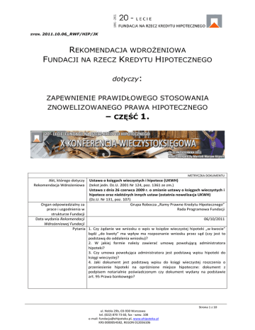 SYGN. 2011.10.06_RWF/HIP/JK REKOMENDACJA WDROśENIOWA FUNDACJI NA RZECZ KREDYTU HIPOTECZNEGO dotyczy: ZAPEWNIENIE PRAWIDŁOWEGO STOSOWANIA ZNOWELIZOWANEGO PRAWA HIPOTECZNEGO – CZĘŚĆ 1. METRYCZKA DOKUMENTU Akt, którego dotyczy Rekomendacja Wdrożeniowa Ustawa o księgach wieczystych i hipotece (UKWH) (tekst jedn. Dz.U. 2001 Nr 124, poz. 1361 ze zm.) Ustawa z dnia 26 czerwca 2009 r. o zmianie ustawy o księgach wieczystych i hipotece oraz niektórych innych ustaw (ostatnia nowelizacja UKWH) (Dz.U. Nr 131, poz. 107) Grupa Robocza „Ramy Prawne Kredytu Hipotecznego” Rada Programowa Fundacji Organ odpowiedzialny za prace i uzgodnienia w strukturze Fundacji Data wydania Rekomendacji 06/10/2011 Wdrożeniowej Fundacji Pytania 1. Czy żądanie we wniosku o wpis w księdze wieczystej hipoteki „w kwocie” bądź „do kwoty” ma wpływ ma rozpoznanie wniosku przez sąd (czy jest to podstawą do oddalenia wniosku)? 2. W jakiej formie należy zawierać umowę powołującą administratora hipoteki? 3. Czy umowa powołująca administratora jest podstawą wpisu hipoteki do księgi wieczystej? 4. Jaki dokument jest podstawą wpisu do księgi wieczystej roszczenia o przeniesienie hipoteki na opróżnione miejsce hipoteczne: dokument z podpisem notarialnie poświadczonym czy dokument wydany na podstawie art. 95 Prawa bankowego? Strona 1 z 10 ul. Nobla 29b, 03-930 Warszawa tel. (022) 870 73 60, fax - wew. 108 e-mail: [email protected], www.ehipoteka.pl KRS 0000054582, REGON 012036106 I. CHARAKTER I CEL REKOMENDACJI WDROŻENIOWYCH FUNDACJI Realizując cel statutowy Fundacji na rzecz Kredytu Hipotecznego, tj. współtworzenie i monitorowanie prawnej infrastruktury dla kredytu hipotecznego w Polsce, w ramach zapoczątkowanego na 69. posiedzeniu Rady Programowej Fundacji projektu „Modelowe rozwiązania procedur wypełniających obowiązki banków, wynikające z przepisów nadzorczych i ustawowych”, niniejszym udostępnia się wskazówki praktyczne, przesądzające zgłoszone przez banki wątpliwości interpretacyjne. Niniejsza Rekomendacja Wdrożeniowa związana jest z koniecznością implementacji znowelizowanej Ustawy o księgach wieczystych i hipotece. Rekomendacje wdrożeniowe Fundacji mają charakter ekspercki, opierają się na wnioskach analiz biura Fundacji (analizy prawne i prawnoporównawcze oraz funkcjonalne) oraz na uzgodnieniach bankowo-resortowych grup roboczych działających przy Fundacji, jak również wymianie opinii z odpowiednimi organami administracji i wnioskach z Ogólnopolskich Konferencji Wieczystoksięgowych. Celem szerszego udostępnienia Rekomendacji Wdrożeniowych Fundacji jest: • minimalizacja ryzyka bankowego, odpowiedzialności władz banku i ograniczenie kosztów powstających w związku z potencjalnie nieprawidłowym wdrożeniem nowych przepisów; • ujednolicenie poziomu wdrożeń regulacji (wypośrodkowanie zbyt daleko idących i kosztownych procedur i sprostanie prawnym wymogom) • w braku jasności interpretacyjnej organu źródła prawa – wypracowanie najrozsądniejszej w danych warunkach praktyki wdrożeniowej – dla której obroną będzie powszechność danego standardu. STRUKTURA PRAC NAD REKOMENDACJAMI WDROŻENIOWYMI W FUNDACJI Strona 2 z 10 ul. Nobla 29b, 03-930 Warszawa tel. (022) 870 73 60, fax - wew. 108 e-mail: [email protected], www.ehipoteka.pl KRS 0000054582, REGON 012036106 II. ROZBIEŻNOŚCI W STOSOWANIU NOWEGO PRAWA HIPOTECZNEGO W dniu 20 lutego 2011 r. weszła w życie nowelizacja Ustawy o księgach wieczystych i hipotece, która w znaczący sposób zmieniła konstrukcję hipoteki. Do polskiego prawa wprowadzono nowe instytucje; licznych kwestii szczegółowych nie przesądzono, pozostawiając je praktyce i nauce prawa. Fundacja zajmuje się nowym prawem hipotecznym jeszcze od czasów, gdy było ono projektem legislacyjnym. Liczne problemy praktyki są rozstrzygane na posiedzeniach działającej przy Fundacji grupy roboczej „Ramy Prawne Kredytu Hipotecznego”, a także na organizowanych przez Fundację konferencjach. Ostatnim wydarzeniem, na którym – w środowisku sędziów, notariuszy oraz praktyków bankowych i ubezpieczeniowych – ustalane było prawidłowe rozumienie budzących wątpliwości przepisów, było Seminarium Uzgodnieniowe „Najlepsze praktyki wdrażania nowych wymogów regulacyjnych w zakresie ochrony konsumenta i prawa hipotecznego”, 13-14 kwietnia 2011 r. Kolejną okazją do dyskusji w jeszcze szerszym gronie będzie X Konferencja Wieczystoksięgowa, 2021 października 2011 r. Rekomendacje mają na celu wyjaśnienie wątpliwości praktyki i przyczynienie się do jej ujednolicenia nie tylko w praktyce bankowej, ale także na linii wierzyciel hipotecznynotariusz-sąd. Niniejsze opracowanie stanowi część 1. rekomendacji dotyczących postępowania w wątpliwych kwestiach związanych z hipoteką. Opracowane zostało na bazie dyskusji prowadzonych na posiedzeniach prawnej grupy roboczej Fundacji oraz wniosków z Seminarium Uzgodnieniowego. X Konferencja Wieczystoksięgowa już 20-21 października 2011 r.! www.ehipoteka.pl Strona 3 z 10 ul. Nobla 29b, 03-930 Warszawa tel. (022) 870 73 60, fax - wew. 108 e-mail: [email protected], www.ehipoteka.pl KRS 0000054582, REGON 012036106 III. REKOMENDACJE WDROŻENIOWE FUNDACJI SKUTECZNE USTANOWIENIE HIPOTEKI 1) Czy żądanie we wniosku o wpis w księdze wieczystej hipoteki „w kwocie” bądź „do kwoty” ma wpływ ma rozpoznanie wniosku przez sąd (czy jest to podstawą do oddalenia wniosku)? - por. art. 68 ust. 2 zd. 2, brzmienie art. 68 UKWH przed nowelizacją oraz uchylony WYKAZ PRZEPISÓW: W myśl art. 68 UKWH: Art. 68. 1. Hipoteka zabezpiecza wierzytelność pieniężną, w tym również wierzytelność przyszłą. 2. Hipoteka zabezpiecza wierzytelność do oznaczonej sumy pieniężnej. Jeżeli zabezpieczenie hipoteczne jest nadmierne, właściciel obciążonej nieruchomości może żądać zmniejszenia sumy hipoteki. 3. Sumę hipoteki wyraża się w tej same