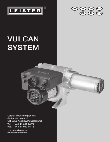 ® VULCAN SYSTEM Leister Technologies AG Galileo-Strasse 10 CH-6056 Kaegiswil/Switzerland Tel. Fax +41 41 662 74 74 +41 41 662 74 16 www.leister.com [email protected] DK N SF GR PL H RUS 2 Size 3 Wiring Diagram 4 Interface 5 FU / FC 6 7 DK Dansk Betjeningsvejledning N Norsk Bruksanvisning 16 SF Suomi Käyttöohje 25 GR Ελληνικά Οδηγίες χρήσης 34 PL Polski Instrukcja obsługi 43 H Magyar Használati útmutató 52 RUS Русский Инструкция по эксплуатации 61 VULCAN SYSTEM Size mm 3 Wiring Diagram L1 L2 L3 PE P N F1 max 3A OFF ON F2 S1 S2 K1 K1 K1 NO COM L1 L2 Power Display Alarm Power Alarm L3 L2 COM NO 4 L1 L3 ON CLL Inter f °F 1 2 3 Interface OPL Pot °C Mode Interface 24 VDC 4 – 20 mA 4 – 20 mA + 0 – 10 VDC GND Input 0 – 10V 24VDC 4-20mA – 4-20mA + Us 0-10V Uc GND Input 4 – 20mA 24VDC 4-20mA – 4-20mA + Ic Us 0-10V GND 5 FU / FC Wiring Diagram Mains supply Netzversorgung 3 x 230VAC FC 550 (3 x 230V) B1 B2 B3 B4 B5 B6 B7 + L1 L2/N U V W Vulcan System (3 x 230V) PE PE F1 (4A) S1 (32A) U1 W2 V1 U2 W1 V2 F2 (16 -32A) L1 L2 L3 PE L3 L1 Mains supply Netzversorgung 3 x 400VAC FC 550 (3 x 230V) B1 B2 B3 B4 B5 B6 B7 L1 L2/N U V W S1 (32A) L1 L2 L3 N PE Mains supply Netzversorgung 3 x 400VAC W L1 L2 L3 PE Mains supply Netzversorgung 3 x 400 – 480VAC 6 V2 Blower Power L1 Vulcan System (3 x 400 – 480V) PE PE F1 (4A) S1 (32A) U2 W1 L3 Mains supply Netzversorgung 3 x 400 – 480VAC V W2 V1 L2 B1 B2 B3 B4 B5 B6 B7 L2 L3/N U U1 F2 (16 -32A) (3 x 400 – 480V) L1 Vulcan System (3 x 400V) PE PE F1 (4A) + Power L2 Mains supply Netzversorgung 3 x 230VAC + Blower F2 (16 -32A) U1 W2 V1 U2 W1 V2 Blower L3 L2 L1 Power Betjeningsvejledning (Oversættelse af den originale betjeningsvejledning) DK Tillykke med dit køb af en VULCAN SYSTEM ! Du har valgt en førsteklasses varmluftblæser fra Leister, der er konstrueret med de bedste materialer. Hver enkelte VULCAN SYSTEM er underlagt en streng kvalitetskontrol, inden den forlader fabrikken i Schweiz. Schweiz verlässt. Betjeningsvejledningen læses omhyggeligt inden ibrugtagning og opbevares for fremtidig reference. Varmluftblæser VULCAN SYSTEM Anvendelse Varmluftblæseren VULCAN SYSTEM er beregnet til indbygning i maskiner, anlæg eller apparater og er konstrueret til kontinuerlig drift. Varmluftblæserne anvendes til f.eks. tørring og opvarmning, optøning, hurtig blanding og opløsning, sterilisering, udglatning, glinsning, aktivering og løsning, separation og smeltning, krympning og lakfjernelse. Advarsel Livsfare ved åbning af apparatet, da spændingsførende komponenter og tilslutninger bliver blottet. Inden åbning af apparatet skal alle poler frakobles elnettet. Brand- og eksplosionsfare ved ukorrekt anvendelse af varmluftblæsere, specielt i nærheden af brændbare materialer og eksplosive gasser. Forbrændingsfare! Varmeelementrør og dyser må ikke berøres i varm tilstand. Lad apparatet afkøle. Varmluftstråle må ikke rettes mod personer eller dyr. Forsigtig 230 400 Nominel spænding, der er angivet på apparatet, skal modsvare den aktuelle netspænding. EN 61000-3-11; Zmax = 0.044 Ω + j 0.028 Ω. Rådfør i givet fald med elektricitetsværket. Apparater af beskyttelsesklasse I skal jordes med beskyttelsesleder. Apparatet skal overvåges under drift. Varme kan nå til brændbare materialer der er udenfor synsvidde. Apparatet må kun benyttes af uddannede personer eller under opsyn af disse. Børn må ikke benytte apparatet. Apparatet beskyttes mod fugt og væske. 7 Monteringserklæring (ifølge maskindirektiv 2006/42/EF; Bilag II B) Leister Technologies AG, Galileo-Strasse 10, CH-6056 Kaegiswil/Schweiz erklærer hermed, at den ufuldstændige maskine Betegnelse: Varmluftblæser Type: VULCAN Udførelse: SYSTEM – så vidt det er muligt ud fra leveringsomfanget – opfylder de gældende grundlæggende krav i henhold til EFmaskindirektiv (2006/42). Den ufuldstændige maskine opfylder desuden kravene for følgende EF-direktiv(er): EF-direktiv(er): Elektromagnetisk kompatibilitet 2004/108 Lavspændingsdirektivet 2006/95 Harmoniserede normer: EN 12100-1, EN 12100-2, EN 60204-1, EN 14121-1, EN 55014-1, EN 55014-2, EN 61000-6-2, EN 61000-3-2, EN 61000-3-3, EN 61000-3-12, EN 61000-3-11 (Zmax) EN 50366, EN 62233, EN 60335-2-45 Desuden erklærer vi, at de særlige tekniske dokumenter for denne ufuldstændige maskine ifølge Bilag VII (Del B) er blevet fremstillet, og vi forpligter os til at overføre disse elektronisk efter anmodning fra markedstilsynet. Navn på fuldmægtige for dokumentering: Patrick Rieder, Compliance Manager Idriftsættelse af den ufuldstændige maskine er ikke tilladt før det i givet fald konstateres, at maskinen, i hvilken den ufuldstændige maskine er blevet innbygget, er ifølge bestemmelserne i maskindirektiv (2006/42). Kaegiswil, 28.11.2011 Bruno von Wyl, CTO Beat Mettler, COO Bortskaffelse Elektrisk værktøj, tilbehør og emballage skal bortskaffes miljømæssigt. Kun for EU-lande: Bortskaf ikke el-værktøj med husholdningsaffald! I henhold til det europæiske direktiv 2002/96/EF om elektrisk og elektronisk affald og deres omsætning i national ret, skal ikke længere anvendelige elektriske værktøjer indsamles separat og tilføres miljørigtig genanvendelse. 8 Tekniske data Spænding Effekt Frekvens Maks. temperatur for luftudtag Maks. temperatur for luftindtag Luftmængde (20 °C) Statisk tryk maks. Emissionsniveau Emissionsniveau uden netkabel Masse V~ kW Hz 3 × 230 6 3 × 400 10 6 3 × 480 11 6 11 50 / 60 50 / 60 50 / 60 °C 650 650 650 °C 65 65 65 850 / 1500 3100 / 4000 65 950 / 1700 3100 / 4000 65 950 / 1700 3100 / 4000 65 9.3 9.3 9.3 Side 3 (størrelse) 2 Side 3 (størrelse) 2 Side 3 (størrelse) 2 1 1 1 l/min. Pa LpA (dB) kg Overensstemmelsesmærke Sikkerhedsmærke Certificeringstype Beskyttelsesklasse I Ret til tekniske ændringer forbeholdes Indgangsspænding ikke reverserbar Varmeydelse med trinløs indstilling vha. potentiometer Integreret effek