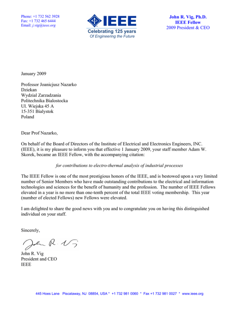 Phone: +1 732 562 3928 Fax: +1 732 465 6444 Email: [email protected] Celebrating 125 years John R. Vig, Ph.D. IEEE Fellow 2009 President & CEO Of Engineering the Future January 2009 Professor Joanicjusz Nazarko Dziekan Wydzial Zarzadzania Politechnika Bialostocka Ul. Wiejska 45 A 15-351 Bialystok Poland Dear Prof Nazarko, On behalf of the Board of Directors of the Institute of Electrical and Electronics Engineers, INC. (IEEE), it is my pleasure to inform you that effective 1 January 2009, your staff member Adam W. Skorek, became an IEEE Fellow, with the accompanying citation: for contributions to electro-thermal analysis of industrial processes The IEEE Fellow is one of the most prestigious honors of the IEEE, and is bestowed upon a very limited number of Senior Members who have made outstanding contributions to the electrical and information technologies and sciences for the benefit of humanity and the profession. The number of IEEE Fellows elevated in a year is no more than one-tenth percent of the total IEEE voting membership. This year (number of elected Fellows) new Fellows were elevated. I am delighted to share the good news with you and to congratulate you on having this distinguished individual on your staff. Sincerely, John R. Vig President and CEO IEEE 445 Hoes Lane Piscataway, NJ 08854, USA * +1 732 981 0060 * Fax +1 732 981 0027 * www.ieee.org