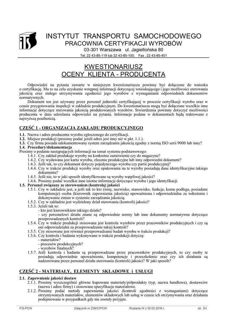 Załącznik nr Z36/C/PCW Instytut Transportu Samochodowego - Pracownia Certyfikacji Wyrobów Wydanie IX; 30 03 2016 r. str. 3/4 INSTYTUT TRANSPORTU SAMOCHODOWEGO PRACOWNIA CERTYFIKACJI WYROBÓW 03-301 Warszawa ul. Jagiellońska 80 Tel. 22 43-85-119 lub 22 43-85-100; Fax . 22 43-85-401 KWESTIONARIUSZ OCENY KLIENTA - PRODUCENTA Odpowiedzi na pytania zawarte w niniejszym kwestionariuszu powinny być dołączone do wniosku o certyfikację. Ma to na celu uzyskanie wstępnej informacji dotyczącej wnioskującego i jego możliwości sterowania jakością oraz stałego utrzymywania zgodności jego wyrobów z wymaganiami odpowiednich dokumentów normatywnych. Dokument ten jest używany przez personel jednostki certyfikującej w procesie certyfikacji wyrobu oraz w czasie przygotowania inspekcji w zakładzie produkcyjnym. Do kwestionariusza mogą być dołączone wszelkie inne informacje dotyczące sterowania jakością produkowanych wyrobów. Stwierdzenia powinny dotyczyć możliwości producenta w dniu udzielania odpowiedzi na pytania. Informacje podane w dokumentach będą traktowane z najwyższą poufnością. CZĘŚĆ 1 - ORGANIZACJA ZAKŁADU PRODUKCYJNEGO 1.1. Nazwa i adres producenta wyrobu zgłoszonego do certyfikacji. 1.2. Miejsce produkcji (prosimy podać jeżeli adres jest inny niż w pkt. 1.1.). 1.3. Czy firma posiada udokumentowany system zarządzania jakością zgodny z normą ISO serii 9000 lub inny? 1.4. Procedury/dokumentacja Prosimy o podanie następujących informacji na temat systemu podstawowego: 1.4.1. Czy zakład produkuje wyroby na konkretne zamówienie czy do magazynu? 1.4.2. Czy wydawana jest karta wyrobu, zlecenie produkcyjne lub inny odpowiedni dokument? 1.4.3. Jeśli tak, to czy dokument dotyczy pojedynczego wyrobu czy partii produkcyjnej? 1.4.4. Czy w trakcie produkcji wyroby oraz opakowania na te wyroby posiadają dane identyfikacyjne takiego dokumentu? 1.4.5. Jeśli nie, to w jaki sposób identyfikowane są wyroby wątpliwej jakości? 1.4.6. Prosimy podać wszelkie inne istotne informacje dotyczące wyrobu i jego identyfikacji. 1.5. Personel związany ze sterowaniem (kontrolą) jakości 1.5.1. Czy w zakładzie jest, a jeśli tak to kto (imię, nazwisko, stanowisko, funkcje, komu podlega, posiadane kompetencje) osoba (kierownik zapewnienia jakością) upoważniona i odpowiedzialna za wdrożenie i dokonywanie zmian w systemie zarządzania jakością. 1.5.2. Czy w zakładzie jest wydzielony dział sterowania (kontroli) jakości? 1.5.3. Jeżeli tak to: - kto jest kierownikiem takiego działu? - czy personelowi działu znane są odpowiednie normy lub inne dokumenty normatywne dotyczące przeprowadzanych kontroli? 1.5.4. Czy w trakcie produkcji stosowana jest kontrola wyrobów przez pracowników produkcyjnych i czy są oni odpowiedzialni za przeprowadzanie takiej kontroli? 1.5.5. Czy stosowane jest również przeprowadzanie badań wyrobu w trakcie produkcji? 1.5.6. Czy kontrola i badania wykonywane w trakcie produkcji dotyczą: - materiałów? - procesów produkcyjnych? - wyrobów finalnych? 1.5.7. Jeśli kontrola i badania są przeprowadzane przez pracowników produkcyjnych, to czy osoby te posiadają odpowiednie upoważnienie, kompetencje i przeszkolenie oraz czy ich działania są nadzorowane przez personel działu sterowania (kontroli) jakości? W jaki sposób? CZĘŚĆ 2 - MATERIAŁY, ELEMENTY SKŁADOWE i USŁUGI 2.1. Zapewnienie jakości dostaw 2.1.1. Prosimy wyszczególnić główne kupowane materiały/półprodukty (typ, nazwa handlowa), dostawców (nazwa i adres firmy) i stosowane specyfikacje materiałowe. 2.1.2. Prosimy podać metody zapewnienia jakości (kontroli zgodności z wymaganiami) dotyczące otrzymywanych materiałów, elementów składowych lub usług w czasie ich otrzymywania oraz działania podejmowane w przypadkach gdy nie zostały przyjęte. ITS-PCW Załącznik nr Z36/C/PCW Wydanie IX z 30 03 2016 r. str. 3/4 Załącznik nr Z36/C/PCW Instytut Transportu Samochodowego - Pracownia Certyfikacji Wyrobów Wydanie IX; 30 03 2016 r. str. 4/4 CZĘŚĆ 3 - PRODUKCJA 3.1. System 3.1.1. Prosimy opisać główne fazy produkcji oraz metody kontroli jakości (międzyoperacyjnej, ostatecznej). 3.1.2. Prosimy opisać stosowany w zakładzie transport wewnętrzny i międzywydziałowy (jeśli taki jest). 3.1.3. Prosimy opisać sposób magazynowania wyrobów gotowych oraz ich wysyłkę do odbiorców spełniającą wymaganiami dla tych wyrobów. CZĘŚĆ 4 - STEROWANIE JAKOŚCIĄ i BADANIA 4.1. System Prosimy opisać metody działania i przedsięwzięcia podejmowane w celu spełnienia wymagań jakościowych dla produkowanego wyrobu. Chodzi o krótki opis systemu sterowania jakością, włącznie ze stosowanym systemem pobierania próbek do badań, ze szczególnym uwzględnieniem powiązania badań z odpowiednimi normami. 4.2. Wyposażenie do badań 4.2.1. Czy zakład sam przeprowadza badania wyrobu na zgodność z właściwą normą lub innym dokumentem normatywnym? 4.2.2. Jeśli nie, to komu zleca przeprowadzenie badań? 4.2.3. Jeśli zakład sam wykonuje badania, prosimy podać stosowane ważniejsze wyposażenie pomiarowe do badań (nazwa przyrządu/urządzenia, typ) oraz producentów tego wyposażenia (nazwa firmy). Prosimy również podać sposób, częstotliwość sprawdzania i wzorcowania tego wyposażenia oraz wymienić stosowne dokumenty legalizacji i ich terminy ważności. 4.2.4. Prosimy określić sposób postępowania z wyrobem niespełniającym wymagania, jego oznaczenie, magazynowanie itp. 4.3. Badania 4.3.1. Czy zgłaszany wyrób był badany na zgodność z właściwą normą lub innym dokumentem normatywnym? Jeżeli tak, prosimy dołączyć sprawozdanie z badań (niezależne badania inne niż badanie na potrzeby przeprowadzenia procesu certyfikacji). 4.3.2. Czy badany wyrób jest prototypem, czy też będzie pobrany z serii produkcyjnej. CZĘŚĆ 5 - ZAPISY i DOKUMENTOWANIE 5.1. Ogólnie 5.1.1. Prosimy przedstawić formę dokumentów związanych z głó