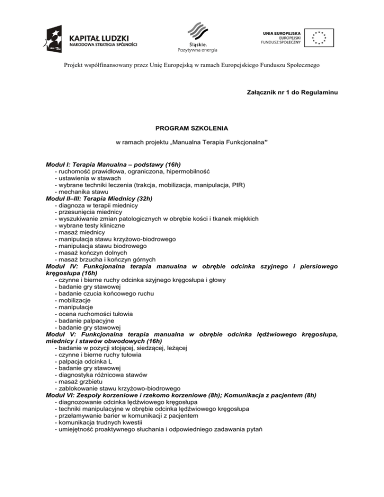 Projekt współfinansowany przez Unię Europejską w ramach Europejskiego Funduszu Społecznego Załącznik nr 1 do Regulaminu PROGRAM SZKOLENIA w ramach projektu „Manualna Terapia Funkcjonalna” Moduł I: Terapia Manualna – podstawy (16h) - ruchomość prawidłowa, ograniczona, hipermobilność - ustawienia w stawach - wybrane techniki leczenia (trakcja, mobilizacja, manipulacja, PIR) - mechanika stawu Moduł II–III: Terapia Miednicy (32h) - diagnoza w terapii miednicy - przesunięcia miednicy - wyszukiwanie zmian patologicznych w obrębie kości i tkanek miękkich - wybrane testy kliniczne - masaż miednicy - manipulacja stawu krzyżowo-biodrowego - manipulacja stawu biodrowego - masaż kończyn dolnych - masaż brzucha i kończyn górnych Moduł IV: Funkcjonalna terapia manualna w obrębie odcinka szyjnego i piersiowego kręgosłupa (16h) - czynne i bierne ruchy odcinka szyjnego kręgosłupa i głowy - badanie gry stawowej - badanie czucia końcowego ruchu - mobilizacje - manipulacje - ocena ruchomości tułowia - badanie palpacyjne - badanie gry stawowej Moduł V: Funkcjonalna terapia manualna w obrębie odcinka lędźwiowego kręgosłupa, miednicy i stawów obwodowych (16h) - badanie w pozycji stojącej, siedzącej, leżącej - czynne i bierne ruchy tułowia - palpacja odcinka L - badanie gry stawowej - diagnostyka różnicowa stawów - masaż grzbietu - zablokowanie stawu krzyżowo-biodrowego Moduł VI: Zespoły korzeniowe i rzekomo korzeniowe (8h); Komunikacja z pacjentem (8h) - diagnozowanie odcinka lędźwiowego kręgosłupa - techniki manipulacyjne w obrębie odcinka lędźwiowego kręgosłupa - przełamywanie barier w komunikacji z pacjentem - komunikacja trudnych kwestii - umiejętność proaktywnego słuchania i odpowiedniego zadawania pytań