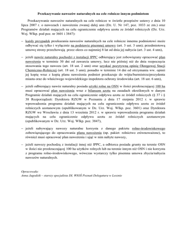 Przekazywanie nawozów naturalnych na cele rolnicze innym podmiotom Przekazywanie nawozów naturalnych na cele rolnicze w świetle przepisów ustawy z dnia 10 lipca 2007 r. o nawozach i nawożeniu zwanej dalej unn (Dz. U. Nr 147, poz. 1033 ze zm.) oraz Programów działań mających na celu ograniczenie odpływu azotu ze źródeł rolniczych (Dz. Urz. Woj. Wlkp. pod poz. nr 3601 i 3847): każdy przypadek przekazania nawozów naturalnych na cele rolnicze innemu podmiotowi może odbywać się tylko i wyłącznie na podstawie pisemnej umowy (art. 3 ust. 3 unn); przedmiotową umowę strony przechowują przez okres co najmniej 8 lat od dnia jej nabycia (art. 3 ust. 4 unn), jeżeli nawóz naturalny pochodzi z instalacji IPPC odbierający jest zobowiązany opracować plan nawożenia w terminie 30 dni od zawarcia umowy, lecz nie później niż do dnia rozpoczęcia stosowania tego nawozu (art. 18 ust. 2 unn) oraz uzyskać pozytywną opinię Okręgowej Stacji Chemiczno-Rolniczej (art. 18 ust. 3 unn); ponadto w terminie 14 dni od otrzymania ww. opinii jej kopię wraz z kopią planu nawożenia podmiot przekazuje do wójta/burmistrza/prezydenta miasta oraz do właściwego wojewódzkiego inspektora ochrony środowiska (art. 18 ust. 6 unn), jeżeli odbierający nawóz naturalny posiada użytki rolne na OSN w ilości przekraczającej 100 ha musi opracować plan nawożenia wraz z bilansem azotu na zasadach określonych w danym Programie działań mających na celu ograniczenie odpływu azotu ze źródeł rolniczych (§ 37 i § 38 Rozporządzeń: Dyrektora RZGW w Poznaniu z dnia 17 sierpnia 2012 r. w sprawie wprowadzenia programu działań mających na celu ograniczenie odpływu azotu ze źródeł rolniczych azotanowym (opublikowanym w Dz. Urz. Woj. Wlkp. poz. 3601) oraz Dyrektora RZGW we Wrocławiu z dnia 13 września 2012 r. w sprawie wprowadzenia programu działań mających na celu ograniczenie odpływu azotu ze źródeł rolniczych azotanowym (opublikowanym w Dz. Urz. Woj. Wlkp. poz. 3847), jeżeli nabywający nawozy naturalne korzysta z danego pakietu rolno-środowiskowego zobowiązującego do opracowania planu nawożenia (np. pakiet: rolnictwo zrównoważone), to również musi opracować plan nawożenia i ująć w nim nabyte nawozy, jeżeli nawozy pochodzą z instalacji innej niż IPPC, a odbiorca posiada grunty na terenie OSN w ilości nie przekraczającej 100 ha użytków rolnych lub na terenie innym niż OSN i nie korzysta z programu rolno-środowiskowego, wówczas wystarczy tylko pisemna umowa zbycia/nabycia nawozów naturalnych. Opracowała: Anna Jagodzik – starszy specjalista DI, WIOŚ Poznań Delegatura w Lesznie