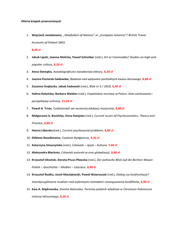 Oferta książek przecenionych 1. Wojciech Jasiakiewicz, „Woefullest of Nations” or „European America”? British Travel Accounts of Poland 1863, 8,20 zł 2. Jakub Lipski, Joanna Malicka, Paweł Schreiber (red.), Art or Commodity? Studies on high and popular culture, 8,20 zł 3. Anna Stempka, Autobiograficzne świadectwa lektury, 8,20 zł 4. Joanna Paciorek-Sadowska, Badania nad wpływem pochodnych kwasu borowego, 8,80 zł 5. Zuzanna Grębecka, Jakub Sadowski (red.), Blok nr 5 / 2010, 6,30 zł 6. Halina Ratyńska, Barbara Waldon (red.), Ciepłolubne murawy w Polsce. Stan zachowania i perspektywy ochrony, 15,10 zł 7. Paweł A. Trzos, Codzienność we wczesnej edukacji muzycznej, 8,80 zł 8. Małgorzata A. Basińska, Anna Ratajska (red.), Current Issues of Psychosomatics. Theory and Practice, 8,80 zł 9. Hanna Liberska (red.), Current psychosocial problems, 8,80 zł 10. Elżbieta Nowikiewicz, Czytanie Bydgoszczy, 9,45 zł 11. Katarzyna Smyczyńska (red.), Człowiek – Język – Kultura, 7,60 zł 12. Aleksandra Błachnio, Człowiek autorski w erze globalizacji, 8,80 zł 13. Krzysztof Okoński, Dorota Pruss-Pławska (red.), Der polnische Blick auf die Berliner Mauer: Politik – Geschichte – Medien – Literatur, 8,80 zł 14. Krzysztof Budka, Jacek Maciejewski, Paweł Wawryszuk (red.), Dialog czy konfrontacja? Interdyscyplinarne studium nad wybranymi metodami rozwiązywania konfliktów, 8,80 zł 15. Ewa A. Mądrowska, Domini Naturales. Portrety polskich władców w Chronicon Polonorum mistrza Wincentego, 8,20 zł 16. Barbara Waldon, Drobne zbiorniki wodne Pojezierza Krajeńskiego jako ostoje różnorodnej szaty roślinnej, 8,80 zł 17. Janusz Golinowski, Artur Laska, Sławomir Sadowski (red.), Dwadzieścia lat po… Stan i perspektywy polskiej demokracji, 8,80 zł 18. Agnieszka Latoś, Teresa Sołtysiak (red.), Działalność profilaktyczna i resocjalizacyjna w środowisku otwartym, instytucjach wychowawczych, poprawczych oraz karnych, 8,20 zł 19. Ewa Kubiak-Szymborska (red.), Educational and Social Context, tom 1, Multidimensionality of Educational Contexts, 8,80 zł 20. Piotr Kostyło (red.), Educational and Social Context, tom 2, Social Problems in Polish Pedagogy after 1989, 8,80 zł 21. Anna Jakubowicz-Bryx (red.), Edukacja czytelnicza wyzwaniem współczesnej pedagogiki przedszkolnej i wczesnoszkolnej, 8, 80 zł 22. Renata Tomaszewska-Lipiec, Edukacja w zakładzie pracy w perspektywie organizacji uczącej się, 8,80 zł 23. Elżbieta Kościńska, Edukacja zdrowotna seniorów i osób przewlekle chorych, 8.20 zł 24. Iwona Mandrzejewska-Smól, Edukacyjno-zawodowe wybory młodzieży gimnazjalnej, 8,20 zł 25. Dariusz Zając, Etyka zawodowa nauczycieli, 8,80 zł 26. Ewa Filipiak (red.), Forum Dydaktyczne 2011 nr 7-8, 3,15 zł 27. Ewa Filipiak (red.), Forum Dydaktyczne 2012 nr 9-10, 5,0 zł 28. Marlena Pietrzykowska, Grzegorz Rubin (red.), Henryk Mikołaj Górecki. Twórczość i inspiracje, 6,30 zł 29. Andrzej Zaćmiński (red.), Historia. Polityka. Stosunki międzynarodowe Wybrane zagadnienia, 9,45 zł 30. Ryszard Nowicki, Hrabiego Skórzewskiego poszukiwania miejsca na ziemi, 12,60 zł 31. Sławomir Kaczmarek, I gdy pragniemy tak namiętnie, 5,70 zł 32. Agnieszka Rypel, Ideologiczny wymiar dyskursu edukacyjnego na przykładzie podręczników języka polskiego z lat 1918-2010, 9,45 zł 33. Maria E. Szatlach, Interregionalizm w międzynarodowych stosunkach politycznych, 9,45 zł 34. Paweł Schreiber (red.), Into the Past. Studies in Literature and Culture, 6,90 zł 35. Jolanta Mędelska, Zofia Sawaniewska-Mochowa (red.), Językowe i kulturowe dziedzictwo Wielkiego Księstwa Litewskiego, 15,00 zł 36. Andrzej Stanisław Dyszak, Językowe wyrażenia zjawisk jasności i ciemności, 8,80 zł 37. Ewa Binkuńska, Językowy obraz świata w tekstach religijnych grupy wyznaniowej „Rodzina” oraz Kościoła Zjednoczeniowego, 8,80 zł 38. Ryszard Pujszo, Judocy Uniwersytetu Kazimierza Wielkiego, 8,20 zł 39. Maciej Chlewicki, Kant a problem filozofii religii, 8,80 zł 40. Jacek Maciejewski, Tomasz Nowakowski (red.), Kazimierz Wielki i jego państwo, 9,45 zł 41. Mariusz Guzek, Daria Mazur, Piotr Zwierzchowski (red.), Kino polskie wobec II wojny światowej, 11,00 zł , 42. Magdalena Miotk-Mrozowska, Komunikacja interpersonalna w Internecie, 8,20 zł 43. Danuta Jastrzębska-Golonka, Konceptualizacja świata przedstawionego w języku najnowszego przekładu tekstów Hansa Christiana Andersena, 8,80 zł 44. Ewa Górecka, Konstantego Ildefonsa Gałczyńskiego gry barwą z wyobraźnią i kulturą, 9,45 zł 45. Elżbieta Kościńska, Maria Kuchcińska (red.), Konteksty zdrowia i edukacji zdrowotnej, 8,20 zł 46. Mirosława Cieślicka, Mirosława Szark-Eckardt, Mirosława Śmiglewska, Korygowanie wad postawy ciała poprzez zabawy w wodzie, 7,90 zł 47. Dariusz Tomasz Lebioda, Krasiński Gigantomachia, 15,10 zł 48. Ewa Zwolińska, Kształcenie nauczycieli według teorii uczenia się muzyki Edwina E. Gordona, 12,60 zł 49. Andrzej Stanisław Dyszak (red.), Linguistica Bidgostiana tom IX, 7,90 zł 50. Andrzej Stanisław Dyszak (red.), Linguistica Bidgostiana tom VII, 7,90 zł 51. Andrzej Stanisław Dyszak (red.), Linguistica Bidgostiana tom VIII, 7,60 zł 52. Anna Bączkowska, Małgorzata Święcicka (red.), Linguistics Applied nr 4, 7,60 zł 53. Adam Sudoł, Losy Polaków na Wschodzie w badaniach historyków Uniwersytetu Kazimierza Wielkiego w Bydgoszczy, 5,00 zł 54. Zbigniew Górski, Ryszard Kabaciński, Andrzej Mietz, Lustracja województw wielkopolskich i kujawskich 1765, 8,20 zł 55. Marek Kurkiewicz, Robert Mielhorski (red.), Marian Hemar wczoraj i dziś, 12,60 zł 56. Marek Macko, Metoda doboru rozdrabniaczy wielokrawędziowych do przeróbki materiałów polimerowych, 8,20 zł 57. Tomasz Karasiewicz, Krzysztof Moraczewski, Piotr Rytlewski, Magdalena Stepczyńska, Marian Żenkiewicz, Metody badań i oceny niektórych właściwości tworzyw polimerowych i metali, 9,45 zł 58. Małgorzata 