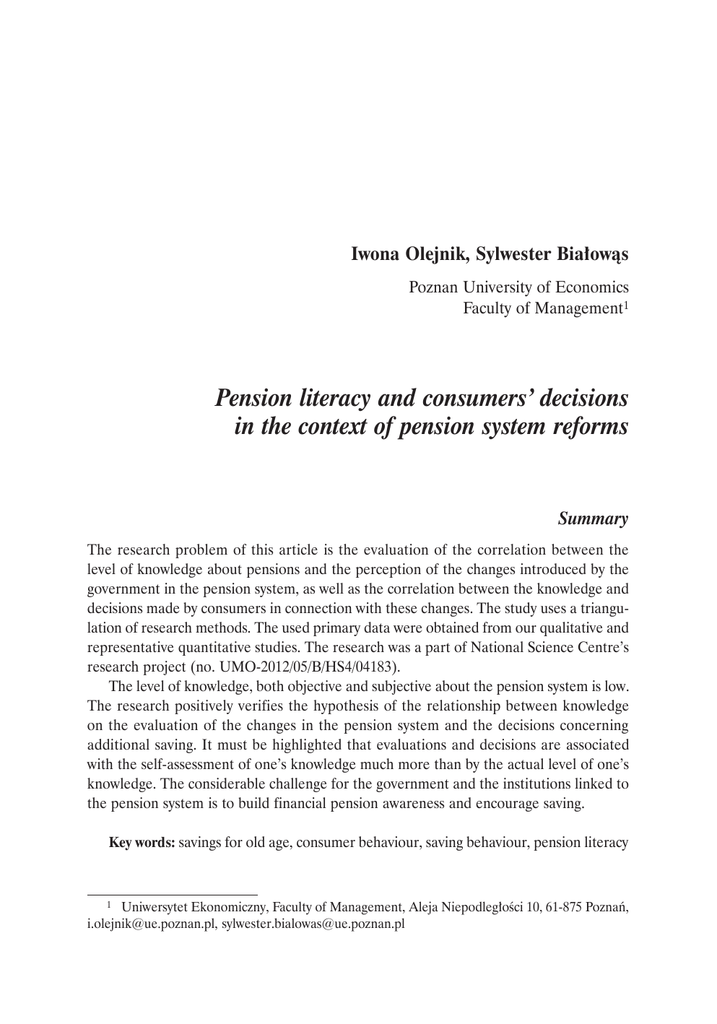 Iwona Olejnik, Sylwester Białowąs Poznan University of Economics Faculty of Management1 Pension literacy and consumers’ decisions in the context of pension system reforms Summary The research problem of this article is the evaluation of the correlation between the level of knowledge about pensions and the perception of the changes introduced by the government in the pension system, as well as the correlation between the knowledge and decisions made by consumers in connection with these changes. The study uses a triangulation of research methods. The used primary data were obtained from our qualitative and representative quantitative studies. The research was a part of National Science Centre’s research project (no. UMO-2012/05/B/HS4/04183). The level of knowledge, both objective and subjective about the pension system is low. The research positively verifies the hypothesis of the relationship between knowledge on the evaluation of the changes in the pension system and the decisions concerning additional saving. It must be highlighted that evaluations and decisions are associated with the self-assessment of one’s knowledge much more than by the actual level of one’s knowledge. The considerable challenge for the government and the institutions linked to the pension system is to build financial pension awareness and encourage saving. Key words: savings for old age, consumer behaviour, saving behaviour, pension literacy 1 Uniwersytet Ekonomiczny, Faculty of Management, Aleja Niepodległości 10, 61-875 Poznań, [email protected], [email protected] Iwona Olejnik, Sylwester Białowąs 14 Introduction The new pension system, introduced in Poland in 1999 is being constantly modified (the study takes into account two changes: a lowering of the portion of pension contributions transferred from ZUS to OFE as introduced in 2011 and also the possibility to stop saving at OFE as introduced in 2014). This may undermine peoples’ confidence in the stability of the system and contribute to a change in attitudes and decision-making related to additional (voluntary) pension coverage. Pension knowledge is an element of financial literacy and includes all the information, as well as the understanding of the issues connected with the pension system. This knowledge will be analyzed on the level of both subjective self-assessment and objective knowledge of the pension system issues. It was assumed that the level of pension knowledge would influence the perception of the modifications introduced in the pension system and the decisions connected with additional saving for old age. In particular it was assumed that the higher level of their knowledge, both objective and subjective, the consumers are more likely to: • make a decision to divide their pension assets into two separate accounts (ZUS and OFE) — the higher level of knowledge should lead to more diversified sources of future pension (Zaleśkiewicz 1996), • negatively evaluate the changes made by the government, that higher knowledge leads to a higher awareness of the breaking of any promised rules in the pension system • save additionally for old age. The article uses the triangulation research method. Both quantitative and qualitative research results are presented. The research was part of the National Science Centre’s research project “Saving Practices and Financial Pension Security in Households — Determinants, Attitudes, Models” (no. UMO-2012/05/B/HS4/04183). The role of knowledge in making financial decisions The process of shaping retirement competences, in particular of knowledge about the pension system should include planning household finances. Special attention should be given to the assessment of one’s financial situation, the rules and conditions of building up savings for old age — both in state and private pension systems, specifying the number of work years or choosing a pension product. Deciding to build up savings in order to make one’s aging more secure (on the expected level and at the preferred pace of their growth), or deciding on introducing changes in this matter requires possessing proper knowledge of finances. This knowledge enables one to set realistic aims of saving for retirement and make sensible choices. This issue is of considerable significance, particularly in the context of aging of societies, changes in a family model, or the forecast levels of replacement rates2. This issue is immensely important, not only in Poland. As A. Lusardi points out, also in the rich American society the improvement of education about finances and pensions seems to be 2 Pension literacy and consumers’ decisions in the context of pension system reforms 15 Information as a significant factor influencing making sensible decisions is a basis for the traditional models of consumer behavior. According to Schwartz (1986), customers who have access to complete information about the features of products are confident about what they personally prefer, they can process the data they have access to, and, as a consequence, they are able to specify their preferences among particular goods without incurring a loss. At the turn of the 1970s and 1980s, some researchers started to indicate that not all consumers make a sufficient effort in order to take optimal purchase decisions (Olshavsky, Granbois, 1979, pp. 93–100), and they do not look for information in an active way (Beales et al., 1981, pp. 11–22). Among various reasons for this situation, the following were given: the lack of knowledge enabling an individual to acquire information, the unavailability of adequate information or too much information, seemingly sufficient amount of information or experiences acquired earlier, and also the lack of knowledge enabling one to process the acquired information. Many authors emphasize that information has a profound influence on financial behaviors.3 Financial knowledge (i.e. the whole information obtained through researc