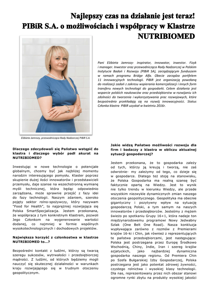 Pani Elżbieta Jamrozy- inspirator, innowator, inwestor. Fizyk i manager. Inwestor oraz przewodnicząca Rady Nadzorczej w Polskim Instytucie Badań i Rozwoju (PIBiR SA), zarządzającym funduszem w ramach programu Bridge Alfa. Obecie zarządza portfelem 11 innowacyjnych technologii. PIBiR jest organizacją powołaną do realizacji zadań z zakresu wspierania komercjalizacji i innych form transferu nowych technologii do gospodarki. Celem działania jest wsparcie polskich naukowców oraz przedsiębiorstw w rozwijaniu ich zdolności do tworzenia i wykorzystywania prac rozwojowych, które bezpośrednio przekładają się na rozwój innowacyjności. Status Członka klastra PIBiR uzyskał w kwietniu 2016r. Elżbieta Jamrozy, przewodnicząca Rady Nadzorczej PIBiR S.A. Dlaczego zdecydowali się Państwo wstąpić do klastra i dlaczego wybór padł akurat na NUTRIBIOMED? Inwestując w nowe technologie o potencjale globalnym, chcemy być jak najbliżej momentu narodzin interesującego pomysłu. Klaster poprzez skupienie dużej ilości innowatorów i przedstawicieli przemysłu, daje szanse na wszechstronną wymianę myśli technicznej, która będąc odpowiednio zarządzana, może sprawnie przejść z fazy idei do fazy technologii. Naszym zdaniem, szeroko pojęty sektor rolno-spożywczy, który nazywam "Food for Health”, to najprężniej rozwijająca się Polska SmartSpecjalizacja. Jestem przekonana, że współpraca z tym konkretnym Klastrem, pozwoli Jego Członkom na wygenerowanie wartości dodanej, co najmniej w formie wspólnych wysokotechnologicznych i dochodowych projektów. Największa korzyść z członkostwa w klastrze NUTRIBIOMED to…? Bezpośredni kontakt z ludźmi, którzy są twarzą szeregu sukcesów, wytrwałości i przedsiębiorczej mądrości. Z ludźmi, od których będziemy mogli nauczyć się skutecznej działalności w warunkach kraju rozwijającego się w trudnym otoczeniu geopolitycznym. Jakie widzą Państwo możliwości rozwoju dla firm i badaczy z klastra w obliczu aktualnej sytuacji gospodarczej? Jestem przekonana, że to gospodarka zależy od tych, którzy ją kreują i tworzą, nie zaś odwrotnie- my zależymy od tego, co dzieje się w gospodarce. Dlatego też stoję na stanowisku, że Polska Gospodarka ma realną szansę być faktycznie opartą na Wiedzy. Jest to wynik nie tylko trendu w kierunku Wiedzy, ale przede wszystkim niezwykle dynamicznych zmian naszego otoczenia geopolitycznego. Geopolityka ma obecnie gigantyczny i pozytywny wpływ na sytuację gospodarczą Polski, a tym samym na naszych innowatorów i przedsiębiorców. Jesteśmy z mężem świeżo po spotkaniu Grupy 16+1, która nadaje ton międzynarodowemu programowi Nowy Jedwabny Szlak (One Belt One Road). Nasza konkluzja wypływająca zarówno z rozmów z Premierami krajów 16-ki i Chin, jak również z reprezentujących te państwa przedsiębiorcami, jest następująca: Polska jest postrzegana przez Europę Środkowo Wschodnią, Chiny, Indie, Iran i szereg krajów azjatyckich, jako najbardziej dynamiczna gospodarka naszego regionu. Od Premiera Chin po Szefa Bułgarskiej Izby Gospodarczej, Polska postrzegana jest jako potentat zdrowej żywności, czystego rolnictwa i wysokiej klasy technologii. Dla nas, reprezentowany przez nich obszar stanowi ogromne rynki zbytu na produkty wysokiej jakości głównie w obszarze Food for Health. Zatem uważam, że obecna sytuacja gospodarcza i otwartość Rządu na współpracę z Azją to od dawna wyczekiwana okazja do spektakularnego rozwoju branży F4H. Jakie narzędzia Państwo mogą proponować i dostarczać członkom klastra w ramach współpracy? Fundusze publiczno-prywatne, które tworzę od 2012 roku, a które stanowią dywersyfikację ryzyka dla inwestorów, zainteresowanych lokowaniem środków w innowacje. Innowacja to wysokie ryzyko, dlatego też skonstruowałam jeden z pierwszych tego typu mechanizmów, zwany Bridge Alfa. Jest to jedna z ofert skierowanych do Członków Klastra. Kolejne narzędzie to szerokie wsparcie przy wejściu na rynki krajów uczestniczących w narodowych programach będących składową Nowego Jedwabnego Szlaku. Po nowym roku uruchomimy Zespół roboczy ds. komercjalizacji innowacji, działający przy Grupie 16+1 oraz współpracujący z AIIB (Azjatyckim Bankiem Inwestycji Infrastrukturalnych), który może finansować również międzynarodową infrastrukturę typu Park Technologiczny Polsko-Chińsko-Indyjski, jeśli tylko zechcemy taki zaprojektować i uruchomić. Czy widzą Państwo jakieś ryzyka, zagrożenia dla naszej inicjatywy klastrowej oraz dalszej współpracy? Podmioty przedsiębiorcze są nastawione na działania zmierzające do konkretnego efektu finansowego w określonym czasie, co powoduje, że nie zaprzątają sobie głowy rozmowami o projektach długofalowych. Z kolei Jednostki Naukowe mają na celu poszukiwanie nowych technologii, a to niekoniecznie jest zadaniem przewidywalnym i dochodowym. Jest to znane ryzyko związane ze współpracą gospodarczą przemysłu i nauki, które dotyczy wszystkich krajów i wszystkich branż. Problemem jest niska efektywność takiej współpracy nauki z przemysłem, która mogłaby pochwalić się dużymi przychodami w krótkim okresie jej trwania. Niestety nie ma na to jednej recepty, która rozwiąże wszystkie bolączki. Jednak mam pewną propozycję. Zbudujmy wspólnie Narodowy Program Sektorowy, skierowany głównie lub wyłącznie do Członków Klastra NUTRIBIOMED Program ten miałby w okresie 3 miesięcy dokonać realnej identyfikacji potrzeb przemysłu i możliwości ich zaspokojenia poprzez kompetencje innowatorów Klastra, a w jego konsekwencji uruchomić szereg konkursów dedykowanych wcześniej przygotowanym projektom. Rozmawiam o stworzeniu takiego Programu z Dyrektorem NCBR. Do czego chcieliby Państwo przekonać członków klastra w kontekście własnych doświadczeń, ale i perspektyw rozwoju? Do wyznaczania krótkoterminowych etapów współpracy danej firmy z z