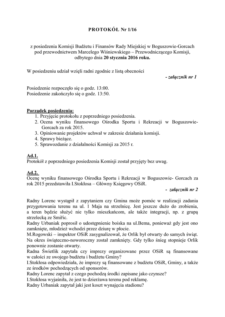 PROTOKÓŁ Nr 1/16 z posiedzenia Komisji Budżetu i Finansów Rady Miejskiej w Boguszowie-Gorcach pod przewodnictwem Marcelego Wiśniewskiego – Przewodniczącego Komisji, odbytego dnia 20 stycznia 2016 roku. W posiedzeniu udział wzięli radni zgodnie z listą obecności - załącznik nr 1 Posiedzenie rozpoczęło się o godz. 13:00. Posiedzenie zakończyło się o godz. 13:50. Porządek posiedzenia: 1. Przyjęcie protokołu z poprzedniego posiedzenia. 2. Ocena wyniku finansowego Ośrodka Sportu i Rekreacji w BoguszowieGorcach za rok 2015. 3. Opiniowanie projektów uchwał w zakresie działania komisji. 4. Sprawy bieżące. 5. Sprawozdanie z działalności Komisji za 2015 r. Ad.1. Protokół z poprzedniego posiedzenia Komisji został przyjęty bez uwag. Ad.2. Ocenę wyniku finansowego Ośrodka Sportu i Rekreacji w Boguszowie- Gorcach za rok 2015 przedstawiła I.Stokłosa – Główny Księgowy OSiR. - załącznik nr 2 Radny Lorenc wystąpił z zapytaniem czy Gmina może pomóc w realizacji zadania przygotowania terenu na ul. 1 Maja na strzelnicę. Jest jeszcze dużo do zrobienia, a teren będzie służyć nie tylko mieszkańcom, ale także integracji, np. z grupą strzelecką ze Smiřic. Radny Urbaniak poprosił o udostępnienie boiska na ul.Bema, ponieważ gdy jest ono zamknięte, młodzież wchodzi przez dziurę w płocie. M.Rogowski – inspektor OSiR zasygnalizował, że Orlik był otwarty do samych świąt. Na okres świąteczno-noworoczny został zamknięty. Gdy tylko śnieg stopnieje Orlik ponownie zostanie otwarty. Radna Świetlik zapytała czy imprezy organizowane przez OSiR są finansowane w całości ze swojego budżetu i budżetu Gminy? I.Stokłosa odpowiedziała, że imprezy są finansowane z budżetu OSiR, Gminy, a także ze środków pochodzących od sponsorów. Radny Lorenc zapytał z czego pochodzą środki zapisane jako czynsze? I.Stokłosa wyjaśniła, że jest to dzierżawa terenu pod reklamę. Radny Urbaniak zapytał jaki jest koszt wynajęcia stadionu? I.Stokłosa poinformowała, że jest to kwota 100 zł za godzinę. Zdaniem radnego Urbaniaka jest to zbyt mały koszt, ponieważ utrzymanie i odbudowa jest droższa. Radny Wiśniewski zasygnalizował, że OSiR dba o stan murawy na w Gorcach. Radny Wysocki zapytał czy prawdą jest, że trawa na stadionie przy ul.Kusocińskiego jest bardziej odporna, niż w Gorcach? M.Rogowski odpowiedział, że na stadionie przy ul.Kusocińskiego jest bardziej sucho, bardzo mało ziemi i dużo skały, stąd ta różnica. Ad.3. A) Projekt uchwały w sprawie zmian w Uchwale Budżetowej na rok 2016 omówiła E.Wojtas-Wolska. załącznik nr 3 Burmistrz Miasta omówił także projekty uchwał dotyczące dofinansowania parafii z terenu Boguszowa-Gorc, ponieważ mają one ścisły związek z projektem uchwały w sprawie zmian w Uchwale Budżetowej na rok 2016. Radny Wysocki zapytał, czy parafie muszą od tych kwot odprowadzić podatek? Radny Lorenc potwierdził, że 23 % VAT-u. Radny Urbaniak zapytał czy jest możliwość wsparcia kościoła w Gorcach? Wykonywane są tam duże remonty, a parafia nie otrzymuje wsparcia, ponieważ nie jest wpisana do rejestru zabytków. Burmistrz Miasta wyjaśnił, że aby móc otrzymać dofinansowanie, musi być spełniony warunek wpisania kościoła do rejestru zabytków. Parafia może sporządzić kartę zabytków i rozpocząć procedurę, ale koszt musi pokryć sama. Radny Wysocki zaznaczył, że są także obiekty, które były zabytkami, miały dokumentację i zostały wykreślone z rejestru zabytków. Radna Świetlik zapytała czy ksiądz płaci podatek od nieruchomości za zabudowania pozostałe oprócz samego kościoła, np. garaże, plebania, itp. ? Przewodniczący poddał projekt uchwały pod głosowanie. Stanowisko Komisji: Komisja w głosowaniu jawnym, głosami 9 za pozytywnie zaopiniowała projekt uchwały w sprawie zmian w uchwale Budżetowej na rok 2016. B) Projekt uchwały w sprawie przyznania dotacji na prace konserwatorskie, restauratorskie lub roboty budowlane przy zabytkach wpisanych do rejestru zabytków i zlokalizowanych na terenie Gminy Boguszów-Gorce (Parafia Rzymsko-Katolicka pw. Świętej Trójcy) omówił Burmistrz Miasta. - załącznik nr 4 Radni nie wnieśli uwag. Przewodniczący poddał projekt uchwały pod głosowanie. Stanowisko Komisji: Komisja w głosowaniu jawnym, głosami 9 za pozytywnie zaopiniowała projekt uchwały. C) Projekt uchwały w sprawie przyznania dotacji na prace konserwatorskie, restauratorskie lub roboty budowlane przy zabytkach wpisanych do rejestru zabytków i zlokalizowanych na terenie Gminy Boguszów-Gorce (Parafia Rzymsko-Katolicka pw. Niepokalanego Poczęcia NMP) omówił Burmistrz Miasta. - załącznik nr 5 Radni nie wnieśli uwag. Przewodniczący poddał projekt uchwały pod głosowanie. Stanowisko Komisji: Komisja w głosowaniu jawnym, głosami 9 za pozytywnie zaopiniowała projekt uchwały. D) Projekt uchwały w sprawie przyznania dotacji na prace konserwatorskie, restauratorskie lub roboty budowlane przy zabytkach wpisanych do rejestru zabytków i zlokalizowanych na terenie Gminy Boguszów-Gorce (Parafia Kościoła Polskokatolickiego pw. Św. Pawła Apostoła) omówił Burmistrz Miasta. - załącznik nr 6 Radni nie wnieśli uwag. Przewodniczący poddał projekt uchwały pod głosowanie. Stanowisko Komisji: Komisja w głosowaniu jawnym, głosami 9 za pozytywnie zaopiniowała projekt uchwały. E) Projekt uchwały w sprawie ustalenia wysokości ekwiwalentu pieniężnego dla członków ochotniczych straży pożarnych omówiła Tarnawska – Kierownik Wydziału Inwestycji Miejskich. - załącznik nr 7 Radni nie wnieśli uwag. Przewodniczący poddał projekt uchwały pod głosowanie. Stanowisko Komisji: Komisja w głosowaniu jawnym, głosami 7 za, 2 wstrz. pozytywnie zaopiniowała projekt uchwały. F) Projekt uchwały w sprawie zmiany Uchwały Nr XVI/96/15 Rady Miejskiej w Boguszoiwe-Gorcach z dnia 30 listopada 2015 r. w sprawie ustalenia trybu udzi