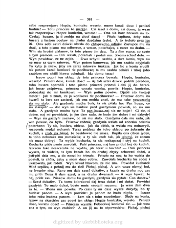 sebe rosprawjaw: Hopże, koniczku weseło, marne kurażi dosc i penieżi hodnie! — Totu princezu to merziło. Czi iszoł z domu, czi domu, ta wsze tak rosprawjaw: Hopże koniczku, weseło! — Ona sia barz hńiwała na to: Czekaj, husare, ja ti zrobju na złosf daco! — Pitała kapitana, żeby toho husara z łystom posław na druhu dzedzinu (seło). A to trebało prez ]es iti. Ona sobi sztiri dziwki ubrała do chłopskoho odinia: Zastupce mu na draźi, a toto pismo mu odberece, a wesce, potarhajce, a rucce na drahu. — Win sia hroźni zlaknuw, ta toto pismo jim daw. Ta z nim ropce, co scete s tym pismom. — Oni wziali, potarhali i podali mu: S konia schód dołu. — Wyn powidaw, że ne zejde. — Dwa schytili szablu, a dwa konia, wyn sia ne maw sz czym ratować. Wyn potom banowaw, jak mu szablu odyjniali: Ta kyby ja znaw, jaby sia zaraz ratuwaw inaksze. Jak ho s konia zrucili tak potom kazali koniowi ric pociłowac; ta mu szablu odniali i takoj joho szablom mu chtili hławu odrubati. Idz domu teraz! Iszow popri ten skłep, de tota princeza buwała. Hopże, koniczku, weseło! Penieżi dosc, kurażi dosc! — Aj toti sztiri dziwki połetili peredom, toho husara speredili i toto pismo princezi prinesli i dali jij do harsci. Jak husar zaśpiwaw, princeza wyszła wonka, powiła: Hopże, koniczku, poboczkaj ric mi konikowi. — Wyn potim powiw: Djabli sto twojyji materi! Jak ti znała, że ja konikowi ric pociłuwaw? — Priszow domu na kwarfil ta bars sze zastarał, jak ona mohła znati, że mu take neszczastia sia mu stało. Ałe gazdynia mudra buła, ta sia pitała ho: Pan husar, co sia starajut? — Ałe wyn sia hańbiw pred gazdyniom powisti, co sia mu stało. A gazdynia mudra była: Ta pan hnsan.naj sia ne bojat! Ci złe, ci dobre, naj mi powidziat, ja jim dam radu, że bude jim dobre i mi dakydy! — Wyn sia gazdyńi zoznaw, co sia mu stało. Gazdynia dała mu radu, jak win powiw, co było. Priszow żobrak, gazdynia wziała od żobraka odzinia / potarhane: Ty sia, husiare, oblecz. Jak sia oblek, ta wziała mu nohawyći, rosporoła medzi nohami: Teraz pojdesz do toho skłepu po żobraniu do kuchni, a 7rnh sia ń \myi że besidowac nie znasz. Kupiła ona citron jyden, ta toho neboraka mu ^namaściła; a ty sia zrob tak, iak głupyj. że rozum nie masz dobryj. Ta wyjdę kucharka, ta sia roskapczaj i styj na kuchni. Kucharka pijde paniu zawołati. Pańi princeza, naj lym pridut hej do kuchńi. Iszczem take neszczestia ne wydiła, jak teraz u kuchńi! — Pańi princeza wyszła, ta widziła, ta lym kazała ho do druhej chyży schowati dobri, a jisti-piti dała mu, a do noczi ho trimała. Priszło na noc, ta ho wziała do posteli, ta chfiła, żeby z niom daco robiw. Zawołała kucharku ku sobje i ukazowała, jak robiti. Wyn kiwat hławom, że nie zna. Powidat kucharci: Woź szpilku, a pchnij mu do rici! Pichaj, pichaj. A win wsze niemyj buł, ne hwariw nicz. Rano mu dała szesf dukatiw, a kazała na druhu noc zas mu priti: Teraz ti dam szesf, a na druhu dwanasti. — A wyn kywat, że hej, pride zas. Priszow domu ku gazdyni, gazdynia sia pytała: Cos dostaw? — Szesf dukatiw. Ta tomu żobrakowi daj teraz dukat i mi dukat. Powidat gazdyńi: To mało dukat, boste mnia nauczili rozumu. Ja wam dam dwa za to. — Wona mu powiła: Po czasi ty mi dasz wysze dakydy, bo ty budesz panom. — A wyn powidat: Ja panom ne budu nigda. — Iszczę toho roku budesz panom. — Łem sia s toho rozośmjaw. Siade na konia, iszow na ekzecirku zas popri ten skłep: Hopże koniczku, weseło. Penieżi dosc, kurażu dosc! — Princeza wyszła: Poboczkaj koniowi ric. — Jak wna zna o tym, co wyn zrobiw? A on jij na to otpowedziw: Pichaj, pichaj digitized by ukrbiblioteka.org