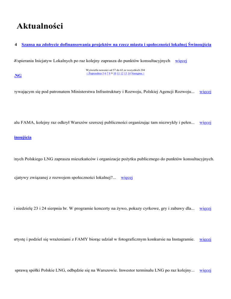 Aktualności 9.09.2014 Szansa na zdobycie dofinansowania projektów na rzecz miasta i społeczności lokalnej Świnoujścia undusz Wspierania Inicjatyw Lokalnych po raz kolejny zaprasza do punktów konsultacyjnych skiego LNG więcej Wyświetla nowości od 57 do 63 ze wszystkich 204 < Poprzednia 5 6 7 8 9 10 11 12 13 14 Następna > 2014 odbywającym się pod patronatem Ministerstwa Infrastruktury i Rozwoju, Polskiej Agencji Rozwoju... więcej y festiwalu FAMA, kolejny raz odkrył Warszów szerszej publiczności organizując tam niezwykły i pełen... więcej zwój Świnoujścia w Lokalnych Polskiego LNG zaprasza mieszkańców i organizacje pożytku publicznego do punktów konsultacyjnych. wanie inicjatywy związanej z rozwojem społeczności lokalnej?... więcej sobotę i niedzielę 23 i 24 sierpnia br. W programie koncerty na żywo, pokazy cyrkowe, gry i zabawy dla... więcej w sobie artystę i podziel się wrażeniami z FAMY biorąc udział w fotograficznym konkursie na Instagramie. więcej nich, za sprawą spółki Polskie LNG, odbędzie się na Warszowie. Inwestor terminalu LNG po raz kolejny... więcej