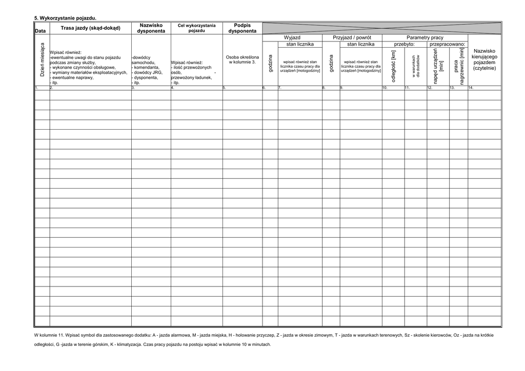 5. Wykorzystanie pojazdu. Podpis dysponenta 2. 3. 4. 5. 6. wpisać równieŜ stan licznika czasu pracy dla urządzeń [motogodziny] 7. 8. wpisać równieŜ stan licznika czasu pracy dla urządzeń [motogodziny] 9. 10. 11. 12. praca nagrzewnic [min] Wpisać równieŜ: - ilość przewoŜonych osób, przewoŜony ładunek, - itp. Osoba określona w kolumnie 3. napęd urządzeń [min] -dowódcy samochodu, - komendanta, - dowódcy JRG, - dysponenta, - itp. Parametry pracy przebyto: przepracowano: w warunkach dla dodatków Wpisać równieŜ: -ewentualne uwagi do stanu pojazdu podczas zmiany słuŜby, - wykonane czynności obsługowe, - wymiany materiałów eksploatacyjnych, - ewentualne naprawy, - itp. Przyjazd / powrót stan licznika godzina Wyjazd stan licznika odległość [km] Cel wykorzystania pojazdu godzina Dzień miesiąca 1. Nazwisko dysponenta Trasa jazdy (skąd-dokąd) Data 13. Nazwisko kierującego pojazdem (czytelnie) 14. W kolumnie 11. Wpisać symbol dla zastosowanego dodatku: A - jazda alarmowa, M - jazda miejska, H - holowanie przyczep, Z - jazda w okresie zimowym, T - jazda w warunkach terenowych, Sz - skolenie kierowców, Oz - jazda na krótkie odległości, G -jazda w terenie górskim, K - klimatyzacja. Czas pracy pojazdu na postoju wpisać w kolumnie 10 w minutach.