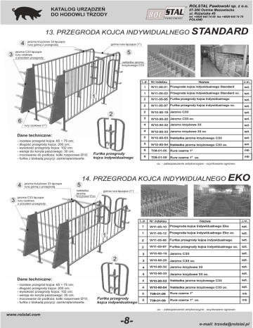ROLSTAL Pawłowski sp. z o.o. KATALOG URZĄDZEŃ DO HODOWLI TRZODY 07-300 Ostrów Mazowiecka ul. Różańska 45 tel. +4829 645 74 00 fax +4829 645 74 70 POLAND 13. PRZEGRODA KOJCA INDYWIDUALNEGO STANDARD 4 3 jarzma krzyżowe 33 łączące rurę górną z przegrodą górna rura łącząca (1”) 5 jarzma C33 łączące rury czołowe z przodem przegrody nakładka jarzma krzyżowego C33 L.p. 1 2 6 rury czołowe (1”) Dane techniczne: - rozstaw przegród kojca: 65 ÷ 75 cm; - długość przegrody kojca: 200 cm; - wysokość przegrody kojca: 102 cm; - wersja do koryta paszowego: 30 cm; - mocowanie do podłoża: kołki rozporowe Ř 10; - furtka z blokadą pozycji: zamknięte/otwarte. Furtka przegrody kojca indywidualnego Nr indeksu Nazwa J.m. 1 W11-05-01 Przegroda kojca indywidualnego Standard szt. 1 W11-05-03 Przegroda kojca indywidualnego Standard oc. szt. 2 W11-05-95 Furtka przegrody kojca indywidualnego szt. 2 W11-05-97 Furtka przegrody kojca indywidualnego oc. szt. 2 W10-90-19 Jarzmo C33 szt. 3 W10-90-20 Jarzmo C33 oc. szt. 4 W10-90-32 Jarzmo krzyżowe 33 szt. 4 W10-90-33 Jarzmo krzyżowe 33 oc. szt. 5 W10-90-53 Nakładka jarzma krzyżowego C33 szt. 5 W10-90-54 Nakładka jarzma krzyżowego C33 oc. szt. 6 T08-01-05 Rura czarna 1" mb 6 T08-01-09 Rura czarna 1" oc. mb oc. - zabezpieczenie antykorozyjne - ocynkowane ogniowo 4 3 jarzma krzyżowe 33 łączące rurę górną z przegrodą jarzma C33 łączące rury czołowe z przodem przegrody 5 14. PRZEGRODA KOJCA INDYWIDUALNEGO EKO nakładka jarzma krzyżowe C33 górna rura łącząca (1”) W11-05-10 W11-05-12 1 W11-05-95 W11-05-97 W10-90-19 2 W10-90-20 W10-90-32 W10-90-33 Dane techniczne: - rozstaw przegród kojca: 65 ÷ 75 cm; - długość przegrody kojca: 200 cm; - wysokość przegrody kojca: 102 cm; - wersja do koryta paszowego: 30 cm; - mocowanie do podłoża: kołki rozporowe Ř 10; - furtka z blokadą pozycji: zamknięte/otwarte. Furtka przegrody kojca indywidualnego W10-90-53 Nakładka jarzma krzyżowego C33 W10-90-54 Nakładka jarzma krzyżowego C33 oc. 5 T08-01-05 Rura czarna 1" mb 5 T08-01-09 Rura czarna 1" oc. mb oc. - zabezpieczenie antykorozyjne - ocynkowane ogniowo www.rolstal.com -8- e-mail: [email protected]