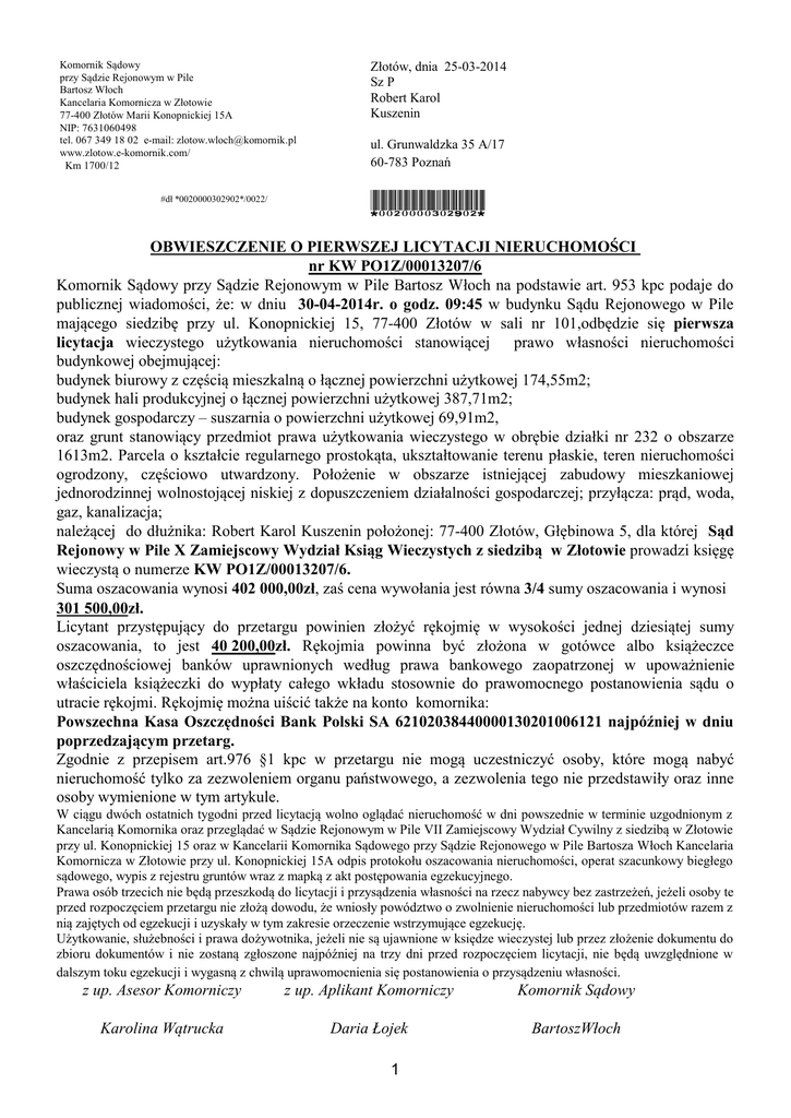 Komornik Sądowy przy Sądzie Rejonowym w Pile Bartosz Włoch Kancelaria Komornicza w Złotowie 77-400 Złotów Marii Konopnickiej 15A NIP: 7631060498 tel. 067 349 18 02 e-mail: [email protected] www.zlotow.e-komornik.com/ Km 1700/12 #dł *0020000302902*/0022/ Złotów, dnia 25-03-2014 Sz P Robert Karol Kuszenin ul. Grunwaldzka 35 A/17 60-783 Poznań *0020000302902* OBWIESZCZENIE O PIERWSZEJ LICYTACJI NIERUCHOMOŚCI nr KW PO1Z/00013207/6 Komornik Sądowy przy Sądzie Rejonowym w Pile Bartosz Włoch na podstawie art. 953 kpc podaje do publicznej wiadomości, że: w dniu 30-04-2014r. o godz. 09:45 w budynku Sądu Rejonowego w Pile mającego siedzibę przy ul. Konopnickiej 15, 77-400 Złotów w sali nr 101,odbędzie się pierwsza licytacja wieczystego użytkowania nieruchomości stanowiącej prawo własności nieruchomości budynkowej obejmującej: budynek biurowy z częścią mieszkalną o łącznej powierzchni użytkowej 174,55m2; budynek hali produkcyjnej o łącznej powierzchni użytkowej 387,71m2; budynek gospodarczy – suszarnia o powierzchni użytkowej 69,91m2, oraz grunt stanowiący przedmiot prawa użytkowania wieczystego w obrębie działki nr 232 o obszarze 1613m2. Parcela o kształcie regularnego prostokąta, ukształtowanie terenu płaskie, teren nieruchomości ogrodzony, częściowo utwardzony. Położenie w obszarze istniejącej zabudowy mieszkaniowej jednorodzinnej wolnostojącej niskiej z dopuszczeniem działalności gospodarczej; przyłącza: prąd, woda, gaz, kanalizacja; należącej do dłużnika: Robert Karol Kuszenin położonej: 77-400 Złotów, Głębinowa 5, dla której Sąd Rejonowy w Pile X Zamiejscowy Wydział Ksiąg Wieczystych z siedzibą w Złotowie prowadzi księgę wieczystą o numerze KW PO1Z/00013207/6. Suma oszacowania wynosi 402 000,00zł, zaś cena wywołania jest równa 3/4 sumy oszacowania i wynosi 301 500,00zł. Licytant przystępujący do przetargu powinien złożyć rękojmię w wysokości jednej dziesiątej sumy oszacowania, to jest 40 200,00zł. Rękojmia powinna być złożona w gotówce albo książeczce oszczędnościowej banków uprawnionych według prawa bankowego zaopatrzonej w upoważnienie właściciela książeczki do wypłaty całego wkładu stosownie do prawomocnego postanowienia sądu o utracie rękojmi. Rękojmię można uiścić także na konto komornika: Powszechna Kasa Oszczędności Bank Polski SA 62102038440000130201006121 najpóźniej w dniu poprzedzającym przetarg. Zgodnie z przepisem art.976 §1 kpc w przetargu nie mogą uczestniczyć osoby, które mogą nabyć nieruchomość tylko za zezwoleniem organu państwowego, a zezwolenia tego nie przedstawiły oraz inne osoby wymienione w tym artykule. W ciągu dwóch ostatnich tygodni przed licytacją wolno oglądać nieruchomość w dni powszednie w terminie uzgodnionym z Kancelarią Komornika oraz przeglądać w Sądzie Rejonowym w Pile VII Zamiejscowy Wydział Cywilny z siedzibą w Złotowie przy ul. Konopnickiej 15 oraz w Kancelarii Komornika Sądowego przy Sądzie Rejonowego w Pile Bartosza Włoch Kancelaria Komornicza w Złotowie przy ul. Konopnickiej 15A odpis protokołu oszacowania nieruchomości, operat szacunkowy biegłego sądowego, wypis z rejestru gruntów wraz z mapką z akt postępowania egzekucyjnego. Prawa osób trzecich nie będą przeszkodą do licytacji i przysądzenia własności na rzecz nabywcy bez zastrzeżeń, jeżeli osoby te przed rozpoczęciem przetargu nie złożą dowodu, że wniosły powództwo o zwolnienie nieruchomości lub przedmiotów razem z nią zajętych od egzekucji i uzyskały w tym zakresie orzeczenie wstrzymujące egzekucję. Użytkowanie, służebności i prawa dożywotnika, jeżeli nie są ujawnione w księdze wieczystej lub przez złożenie dokumentu do zbioru dokumentów i nie zostaną zgłoszone najpóźniej na trzy dni przed rozpoczęciem licytacji, nie będą uwzględnione w dalszym toku egzekucji i wygasną z chwilą uprawomocnienia się postanowienia o przysądzeniu własności. z up. Asesor Komorniczy z up. Aplikant Komorniczy Komornik Sądowy Karolina Wątrucka Daria Łojek BartoszWłoch 1