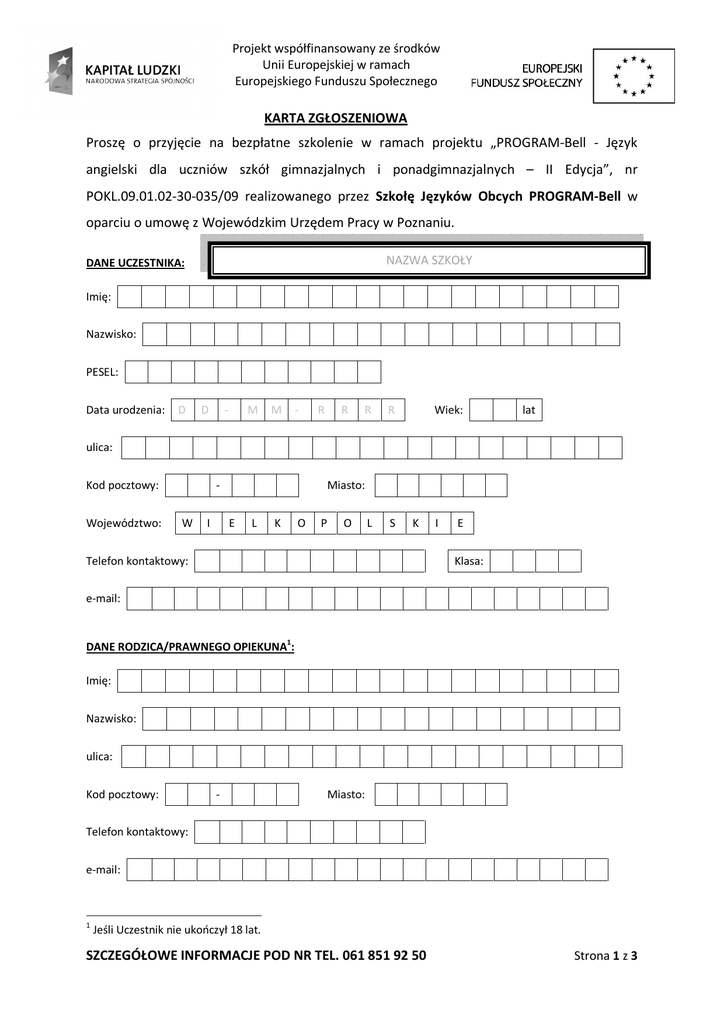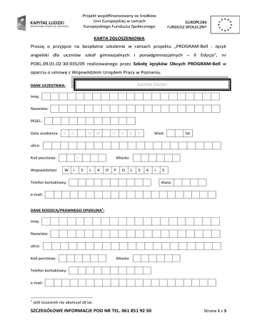 Projekt współfinansowany ze środków Unii Europejskiej w ramach Europejskiego Funduszu Społecznego KARTA ZGŁOSZENIOWA Proszę o przyjęcie na bezpłatne szkolenie w ramach projektu „PROGRAM-Bell - Język angielski dla uczniów szkół gimnazjalnych i ponadgimnazjalnych – II Edycja”, nr POKL.09.01.02-30-035/09 realizowanego przez Szkołę Języków Obcych PROGRAM-Bell w oparciu o umowę z Wojewódzkim Urzędem Pracy w Poznaniu. NAZWA SZKOŁY DANE UCZESTNIKA: Imię: Nazwisko: PESEL: Data urodzenia: D D - M M - R R R R Wiek: lat ulica: Kod pocztowy: Województwo: W I Miasto: E L K O P O L S K Telefon kontaktowy: I E Klasa: e-mail: DANE RODZICA/PRAWNEGO OPIEKUNA1: Imię: Nazwisko: ulica: Kod pocztowy: - Miasto: Telefon kontaktowy: e-mail: 1 Jeśli Uczestnik nie ukończył 18 lat. SZCZEGÓŁOWE INFORMACJE POD NR TEL. 061 851 92 50 Strona 1 z 3 Strona 2 z 3 REGULAMIN UCZESTNICTWA 1. Udział w szkoleniu jest bezpłatny, z zastrzeżeniem punktu 4 „Oświadczenia Uczestnika”. 2. W szkoleniach mogą brać udział uczniowie wybranych gimnazjów i szkół ponadgimnazjalnych w Poznaniu i Koninie. 3. Podstawą przyjęcia na szkolenie jest złożenie w sekretariacie swojej szkoły, najpóźniej do dnia 24.09.2010, kompletu dokumentów: a. Karty zgłoszeniowej (podpisanej przez uczestnika lub w przypadku osób niepełnoletnich przez rodzica lub prawnego opiekuna) b. Dokumentu potwierdzającego kwalifikowalność - kserokopia ważnej legitymacji szkolnej (oryginał do wglądu) 4. O przyjęciu na szkolenie decyduje kolejność zgłoszeń, z zastrzeżeniem warunku zebrania grupy szkoleniowej na dany kurs. W przypadku nie dostarczenia przez Uczestnika w wymaganym terminie kompletu dokumentów jego miejsce zajmuje kolejna osoba z listy rekrutacyjnej. 5. Zajęcia prowadzone będą w szkołach, z których rekrutują się uczestnicy szkolenia. 6. Szkolenie przewiduje zajęcia stacjonarne (58 godz.) oraz zajęcia w trybie e-learningowym (materiał odpowiadający 58 godz. zajęć stacjonarnych). Zajęcia stacjonarne odbywać się będą raz w tygodniu po dwie godziny lekcyjne. Program będzie kontynuowany przez dwa semestry z uwzględnieniem przerw świątecznych oraz ferii. 7. Organizatorzy zastrzegają sobie prawo do wprowadzania zmian w harmonogramie. Zmiany wprowadzane będą w porozumieniu z dyrekcją szkoły, na terenie której realizowane będą zajęcia. 8. 9. Uczestnik w ramach udziału w projekcie otrzymuje: a. podręcznik oraz materiały pomocnicze b. dostęp do platformy e-learningowej. Uczestnik zobowiązany jest do: a. uczestniczenia w zajęciach stacjonarnych, zgodnie z ustalonym harmonogramem (wzmagane minimum to 41 godz.) b. wykonywania zadań na platformie e-learningowej c. wypełniania ankiet ewaluacyjnych, w tym także ankiet na potrzeby sprawozdawczości EFS d. wypełniania testów w formie papierowej lub elektronicznej na potrzeby oceny postępów w nauce 10. Najlepsi uczestnicy projektu będące na poziomie min. A2 wg CEFR otrzymają możliwość zdawania nieodpłatnego egzaminu Cambridge ESOL (FCE, KET, PET). Ranking uczestników ustalany będzie na podstawie frekwencji na zajęciach, wyniku z testu oraz indywidualnej oceny lektora). 11. Niedopełnienie obowiązków przez Uczestnika skutkować będzie wykluczeniem z udziału w szkoleniu. Wyjątek stanowią uzasadnione przypadki takie jak np. choroba, zmiana miejsca zamieszkania itp. Każdy taki przypadek rozpatrywany będzie indywidualnie przez Kierownika Projektu na pisemny wniosek Uczestnika2. 2 W przypadku osób, które nie ukończyły 18 roku życia pismo składa jeden z rodziców lub prawnych opiekunów, składając tym samym oświadczenie woli w ich imieniu. Strona 3 z 3 12. Po zakończeniu udziału w projekcie każdy Uczestnik otrzyma Zaświadczenie. Warunkiem otrzymania Zaświadczenia jest obecność na przynajmniej 41 godz. zajęć stacjonarnych, pozytywna oceną z realizacji zadań na platformie e-learningowej oraz zdanie testu końcowego. OŚWIADCZENIE UCZESTNIKA 1. Potwierdzam prawdziwość danych zawartych na niniejszym formularzu zgłoszenia. 2. Potwierdzam, że zapoznałem się i akceptuję Regulamin uczestnictwa. 3. W związku z przystąpieniem do Projektu „PROGRAM-Bell - Język angielski dla uczniów szkół gimnazjalnych i ponadgimnazjalnych – II Edycja”, nr POKL.09.01.02-30-035/09 realizowanego w ramach Programu Operacyjnego Kapitał Ludzki wyrażam zgodę na przetwarzanie moich danych osobowych. 4. Oświadczam, iż przyjmuje do wiadomości, że: a. administratorem tak zebranych danych osobowych jest Instytucja Zarządzająca dla Programu Operacyjnego Kapitał Ludzki [Ministerstwo Rozwoju Regionalnego, ul. Wspólna 2/4, 00-926 Warszawa]; b. moje dane osobowe będą przetwarzane wyłącznie w celu udzielenia wsparcia i obsługi Projektu; c. moje dane osobowe mogą zostać udostępnione innym podmiotom w celu ewaluacji, jak również w celu realizacji zadań związanych z monitoringiem i sprawozdawczością w ramach Programu Operacyjnego Kapitał Ludzki; d. podanie danych jest dobrowolne, aczkolwiek odmowa ich podania jest równoznaczna z brakiem możliwości udzielenia wsparcia w ramach Projektu; e. mam prawo dostępu do treści swoich danych i ich poprawiania. 5. Zobowiązuję się do zwrócenia kwoty 1500,00 PLN, jeśli nie dopełnię obowiązków wskazanych w punkcie 9 Regulaminu uczestnictwa, z jednoczesnym uwzględnieniem punktu 11 Regulaminu uczestnictwa. Do zwrotu kosztów uczestnictwa zobowiązane są osoby, które rozpoczęły udział w szkoleniu (tj. uczestniczyły przynajmniej w jednych zajęciach). …………………………………………………………………… Czytelny podpis rekrutującego, data przyjęcia 3 …………………………………………………………………… Czytelny podpis Uczestnika lub Rodzica/Prawnego 3 opiekuna W przypadku osób, które nie ukończyły 18 roku życia podpis składa jeden z rodziców lub prawnych opiekunów, składając tym s