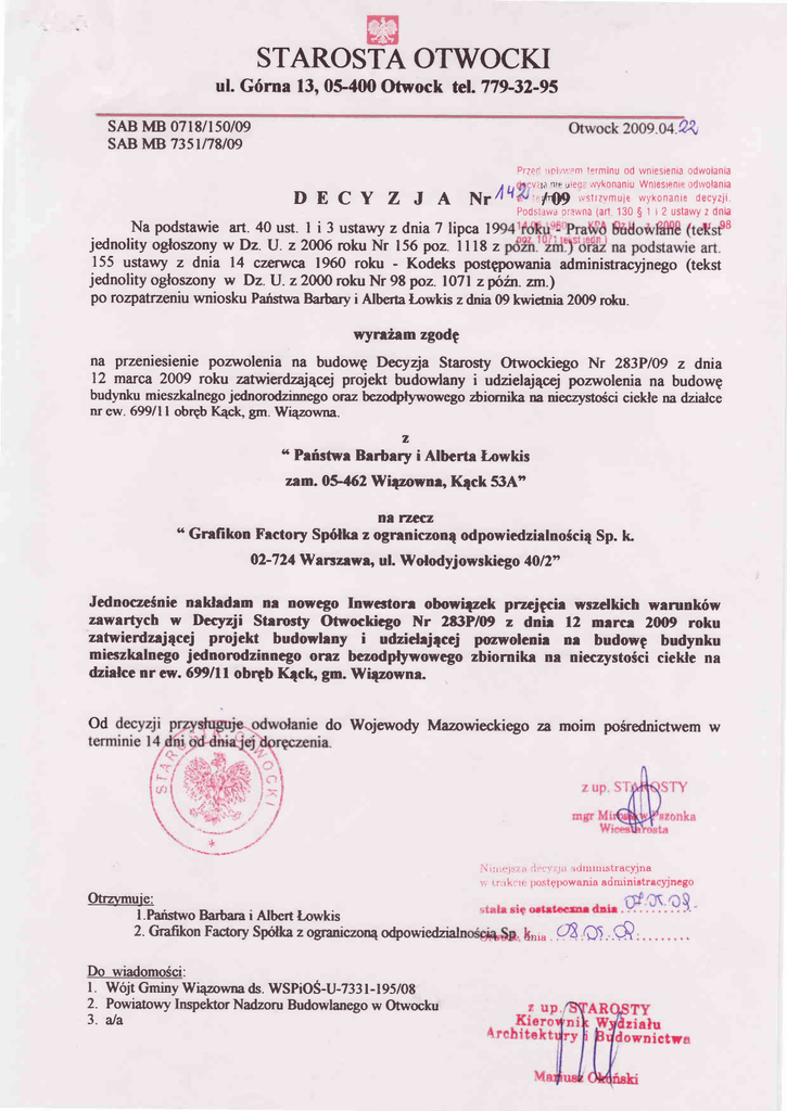 na przeniesieniepoavolenia na budowg Decyaa Starosty Otwockiego Nr 283PlO9z dnia