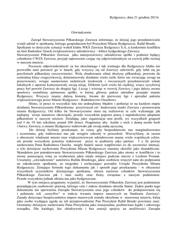 Bydgoszcz, dnia 21 grudnia 2013r. Oświadczenie Zarząd Stowarzyszenia Piłkarskiego Zawisza informuje, że dzisiaj jego przedstawiciele wzięli udział w spotkaniu, którego gospodarzem był Prezydent Miasta Bydgoszczy. Rafał Bruski. Spotkanie to dotyczyło sytuacji wokół klubu WKS Zawisza Bydgoszcz S.A, a konkretnie konfliktu na linii Radosław Osuch (większościowy udziałowiec) – kibice bydgoskiego Zawiszy. Stowarzyszenie Piłkarskie Zawisza jako mniejszościowy udziałowiec spółki i podmiot będący członkiem CWZS Zawisza, przyjął zaproszenie czując się odpowiedzialnym za rozwój piłki nożnej w naszym mieście. Poczucie odpowiedzialność za los ukochanego i tak ważnego dla Bydgoszczy klubu nie pozwoliło nam porzucić go w latach, gdy wszyscy się od Zawiszy odwrócili, gdy tułał się po peryferiach piłkarskiej rzeczywistości. Wola zbudowania silnej drużyny piłkarskiej, powrotu do centralnej klasy rozgrywkowej, determinowały działanie wielu osób, które nie zwracając uwagi na przeciwności, wrogie nastawienie niektórych środowisk i ówczesnych przedstawicieli władz lokalnych z uporem kontynuowały swoją misję. Efektem tych wielu lat ciężkiej, wręcz syzyfowej pracy był powrót Zawiszy do drugiej ligi. Licząc i wierząc w rozwój Zawiszy i jego dalszy awans sportowy zostaliśmy partnerem spółki, w której główny pakiet udziałów przejęło miasto Bydgoszcz. Wszyscy znamy dalszą historię. Awans do pierwszej ligi i sprzedaż pakietu większościowego przez Miasto Bydgoszcz - Radosławowi Osuchowi. Mimo, iż przez te wszystkie lata nie uniknęliśmy błędów i potknięć to na każdym etapie działania Stowarzyszeniu Piłkarskiemu przyświecał cel budowania marki Zawisza i promowania miasta Bydgoszczy. Od kilku lat Stowarzyszenie stara się realizować te cele wykonując jak najlepiej swoje statutowe obowiązki, przede wszystkim poprzez pracę z najmłodszymi adeptami piłkarskimi w naszym mieście. Działając jako organizacja non profit, we wszystkich grupach (od 5 do 10 lat) szkolimy ponad 200 dzieci. Pragniemy aby każde z nich z dumą nosiło herb i barwy Zawiszy, a miasto Bydgoszcz traktowało jak swoją małą ojczyznę. Do dzisiaj byliśmy przekonani, że czasy gdy bezpodstawnie nas marginalizowano i oczerniano, gdy traktowano nas jak wrogów odeszły w przeszłość. Wierzyliśmy, że razem z obecnymi władzami miasta oraz większościowym udziałowcem mamy wiele wspólnych celów, ale przede wszystkim jesteśmy traktowani przez te podmioty jako partner. I o ile pewne zachowania Pana Radosława Osucha mogły budzić nasze wątpliwości co do szczerości intencji, o tyle dzisiejsze zachowanie Prezydenta Miasta Bydgoszczy musimy określić jako skandaliczne. Skandalem jest potraktowanie Stowarzyszenia Piłkarskiego Zawisza jako strony w konflikcie i to strony ponoszącej winę za wydarzenia jakie miały miejsce podczas meczu z Lechem Poznań. Uważamy „oświadczenie” autorstwa Rafała Bruskiego, jakie osobiście wręczył nam do podpisania na zakończenie spotkania, za niegodne i uwłaczające powadze Urzędu Prezydenta Miasta Bydgoszczy. Żenująca formuła tego dokumentu jak i sposób jego przekazania - w obecności wszystkich uczestników dzisiejszego spotkania, obraża zarówno członków Stowarzyszenia Piłkarskiego Zawisza jak i inne osoby oraz firmy związane z naszym podmiotem. Przede wszystkim jednak obraża nas jako bydgoszczan. W tym miejscu pragniemy wyjaśnić, że Stowarzyszenie Piłkarskie Zawisza jest podmiotem posiadającym osobowość prawną, którego cele i zakres działania określa Statut. Żaden punkt tego dokumentu nie upoważnia Zarządu Stowarzyszenia oraz jego członków do podejmowania się i pełnienia roli „szeryfów” w trakcie trwania imprez masowych na Stadionie Zawiszy!. Zasady dotyczące bezpieczeństwa imprez masowych zostały określone w stosownej ustawie, którą jako osoba wydająca zgodę na ich przeprowadzenie Pan Prezydent Rafał Bruski powinien znać. Oceniamy dzisiejsze zachowanie Pana Prezydenta jako irracjonalne, pozbawione logiki i zdrowego rozsądku. Dla każdego, kto obiektywnie i bez emocji spojrzy na możliwości Zarządu Stowarzyszenia Piłkarskiego będzie sprawą oczywistą, że pakietu żądań autorstwa Prezydenta nikt z nas nie byłby w stanie zrealizować. Już od początku spotkania dało się odczuć, że gospodarzowi daleko jest do zachowania bezstronności. Niestety musimy to ze smutkiem stwierdzić, że im dłużej ono trwało tym bardziej Pan Rafał Bruski stawał się adwokatem jednej ze stron sporu. W pewnym momencie stało się jasne, że tak naprawdę to nie o mediację Prezydentowi chodziło. Uważamy za bezpodstawne i niczym nieuzasadnione wskazanie Stowarzyszenia Piłkarskiego Zawisza jako winnego w sporze. Za niedopuszczalne uznajemy bezrefleksyjne podejście Prezydenta Miasta Bydgoszczy Rafała Bruskiego do problemu i kompletny brak woli wyjaśnienia podłoża konfliktu. Dlatego też czujemy się zobowiązani do zapoznania Rady Miasta Bydgoszczy z zaistniałą sytuacją. Stosowny dokument z załączonym „oświadczeniem” autorstwa Prezydenta Rafała Bruskiego zostanie wysłany na adres Przewodniczącego Rady Miasta Bydgoszczy. Zarząd Stowarzyszenia Piłkarskiego Zawisza