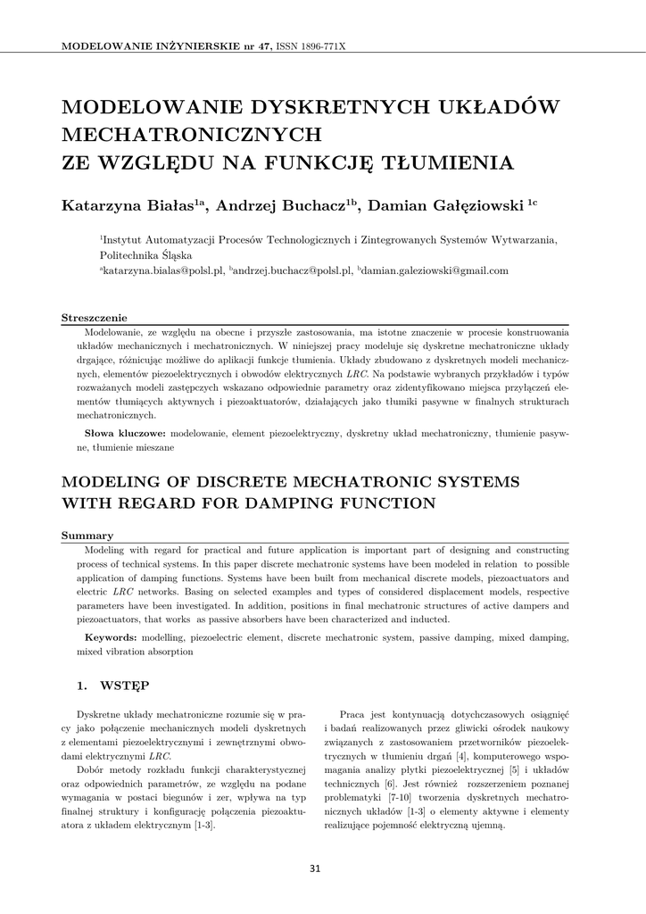 MODELOWANIE INŻYNIERSKIE nr 47, ISSN 1896-771X MODELOWANIE DYSKRETNYCH UKŁADÓW MECHATRONICZNYCH ZE WZGLĘDU NA FUNKCJĘ TŁUMIENIA Katarzyna Białas1a, Andrzej Buchacz1b, Damian Gałęziowski 1c Instytut Automatyzacji Procesów Technologicznych i Zintegrowanych Systemów Wytwarzania, Politechnika Śląska a [email protected], [email protected], [email protected] 1 Streszczenie Modelowanie, ze względu na obecne i przyszłe zastosowania, ma istotne znaczenie w procesie konstruowania układów mechanicznych i mechatronicznych. W niniejszej pracy modeluje się dyskretne mechatroniczne układy drgające, różnicując możliwe do aplikacji funkcje tłumienia. Układy zbudowano z dyskretnych modeli mechanicznych, elementów piezoelektrycznych i obwodów elektrycznych LRC. Na podstawie wybranych przykładów i typów rozważanych modeli zastępczych wskazano odpowiednie parametry oraz zidentyfikowano miejsca przyłączeń elementów tłumiących aktywnych i piezoaktuatorów, działających jako tłumiki pasywne w finalnych strukturach mechatronicznych. Słowa kluczowe: modelowanie, element piezoelektryczny, dyskretny układ mechatroniczny, tłumienie pasywne, tłumienie mieszane MODELING OF DISCRETE MECHATRONIC SYSTEMS WITH REGARD FOR DAMPING FUNCTION Summary Modeling with regard for practical and future application is important part of designing and constructing process of technical systems. In this paper discrete mechatronic systems have been modeled in relation to possible application of damping functions. Systems have been built from mechanical discrete models, piezoactuators and electric LRC networks. Basing on selected examples and types of considered displacement models, respective parameters have been investigated. In addition, positions in final mechatronic structures of active dampers and piezoactuators, that works as passive absorbers have been characterized and inducted. Keywords: modelling, piezoelectric element, discrete mechatronic system, passive damping, mixed damping, mixed vibration absorption 1. WSTĘP Dyskretne układy mechatroniczne rozumie się w pracy jako połączenie mechanicznych modeli dyskretnych z elementami piezoelektrycznymi i zewnętrznymi obwodami elektrycznymi LRC. Dobór metody rozkładu funkcji charakterystycznej oraz odpowiednich parametrów, ze względu na podane wymagania w postaci biegunów i zer, wpływa na typ finalnej struktury i konfigurację połączenia piezoaktuatora z układem elektrycznym [1-3]. Praca jest kontynuacją dotychczasowych osiągnięć i badań realizowanych przez gliwicki ośrodek naukowy związanych z zastosowaniem przetworników piezoelektrycznych w tłumieniu drgań [4], komputerowego wspomagania analizy płytki piezoelektrycznej [5] i układów technicznych [6]. Jest również rozszerzeniem poznanej problematyki [7-10] tworzenia dyskretnych mechatronicznych układów [1-3] o elementy aktywne i elementy realizujące pojemność elektryczną ujemną. 31 MODELOWANIE DYSKRETNYCH UKŁADÓW MECHATRONICZNYCH ZE WZGLĘDU NA… Natężenie prądu iz w układzie opisano natomiast zależnością Celem pracy jest podsumowanie możliwości modelowania i tworzenia mechatronicznych układów dyskretnych ze względu na możliwą do otrzymania w wyniku rozwiązania zadania odwrotnego funkcję tłumienia. Identyfikacja odpowiednich miejsc przyłączenia elementów piezoelektrycznych i tłumików aktywnych została przedstawiona na przykładach mechatronicznych dyskretnych struktur kaskadowych, rozgałęzionych i mieszanych. (2) , gdzie: – prędkość elementu inercyjnego, do którego przyłączony jest piezoaktuator. 3. TŁUMIENIE W UKŁADACH MECHATRONICZNYCH 2. DYSKRETNE DRGAJĄCE UKŁADY MECHATRONICZNE Klasyfikację metod tłumienia w mechatronicznych dyskretnych układach drgających rozszerzono o tłumienie z wykorzystaniem elementów aktywnych (rys 3). Elementy aktywne można zastosować w tłumieniu mieszanym, łącząc w różnych kombinacjach wybrane metody. Tłumiki proporcjonalne do elementów inercyjnych di dobierane są wg zależności: W dyskretnych układach mechatronicznych, w celu redukcji drgań, zastosowano element piezoelektryczny typu „stack” (rys. 1). (3) gdzie: ci – element sprężysty, χ = idem - współczynnik proporcjonalności. Elementy tłumiące proporcjonalne do elementów sprężystych wyznacza się natomiast wg zależności: Rys. 1. Schemat piezoaktuatora typu „stack” (4) 2 gdzie: mi – element inercyjny wyznaczony w wyniku syntezy, h = idem – parametr opisujący tłumienie w układzie, mający wymiar częstości. Bezwymiarowe parametry związane z realizacją tłumienia w układzie mechatronicznym zależą od ich pozycji w strukturze i wybranej metody rozkładu funkcji charakterystycznej. Na przykładzie mechatronicznych układów rozgałęzionych o jednym stopniu swobody z dwoma elementami piezoelektrycznymi – rys. 4 i 5, zapisano: Przykładową kaskadową strukturę mechatroniczną z elementem piezo działającym w funkcji LR pokazano na rys. 2. Linią przerywaną zaznaczono przykładowe możliwe pozycje dołączenia tłumienia aktywnego bądź pasywnego. 2 , 2 (5) gdzie: dp1,dp2 – elementy inercyjne, c2, c3 – elementy sprężyste, ω1 – częstość układu. Wartości elementów aktywnych wyznaczono na podstawie [10], zapisując równanie: ! "#Ψ% (6) gdzie: " %& ' ( ), M – macierz elementów inercyjnych, C – macierz sztywności, Ψ – macierz kolumnowa amplitud, F – macierz kolumnowa sił. Rys. 2. Przykładowy kaskadowy, dyskretny układ mechatroniczny z elementem piezoelektrycznym połączonym z obwodem LR Napięcie up na płytkach piezoelektryka zapisano jako: , (1) gdzie: e – stała piezoelektryczna, Fpe – składowa elektryczna siły pochodzącej od elementu piezoelektrycznego. 32 Katarzyna Białas, Andrzej Buchacz, Damian Gałęziowski Tłumienie w dyskretnych drgających układach mechatronicznych Pasywne Mieszane L LC LR LRC Kombinacje dwóch metod Pół-aktywne - tł